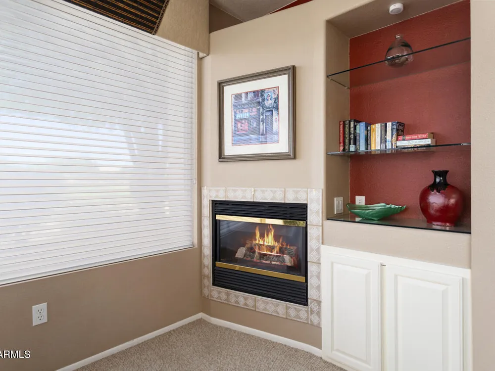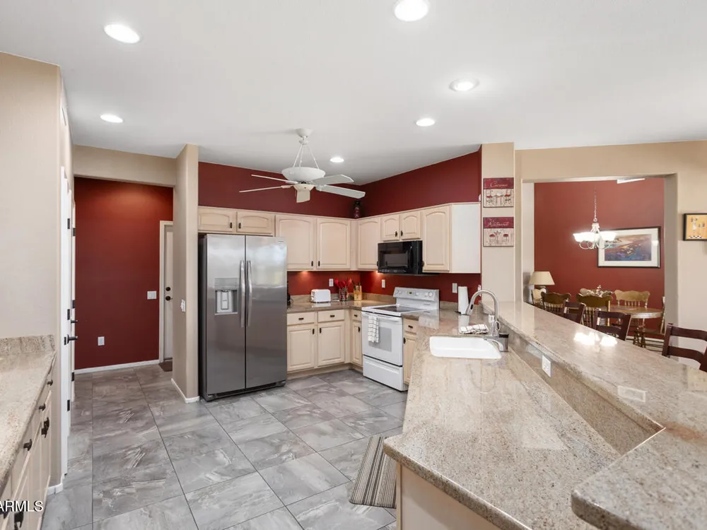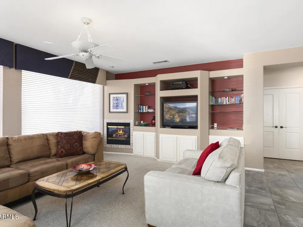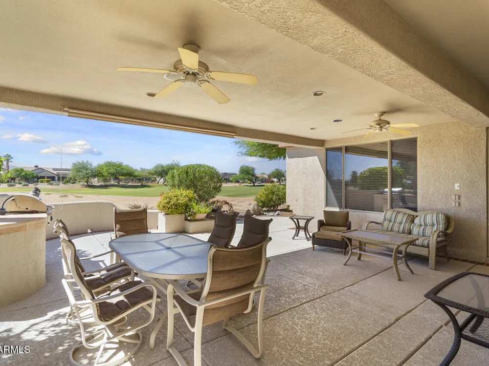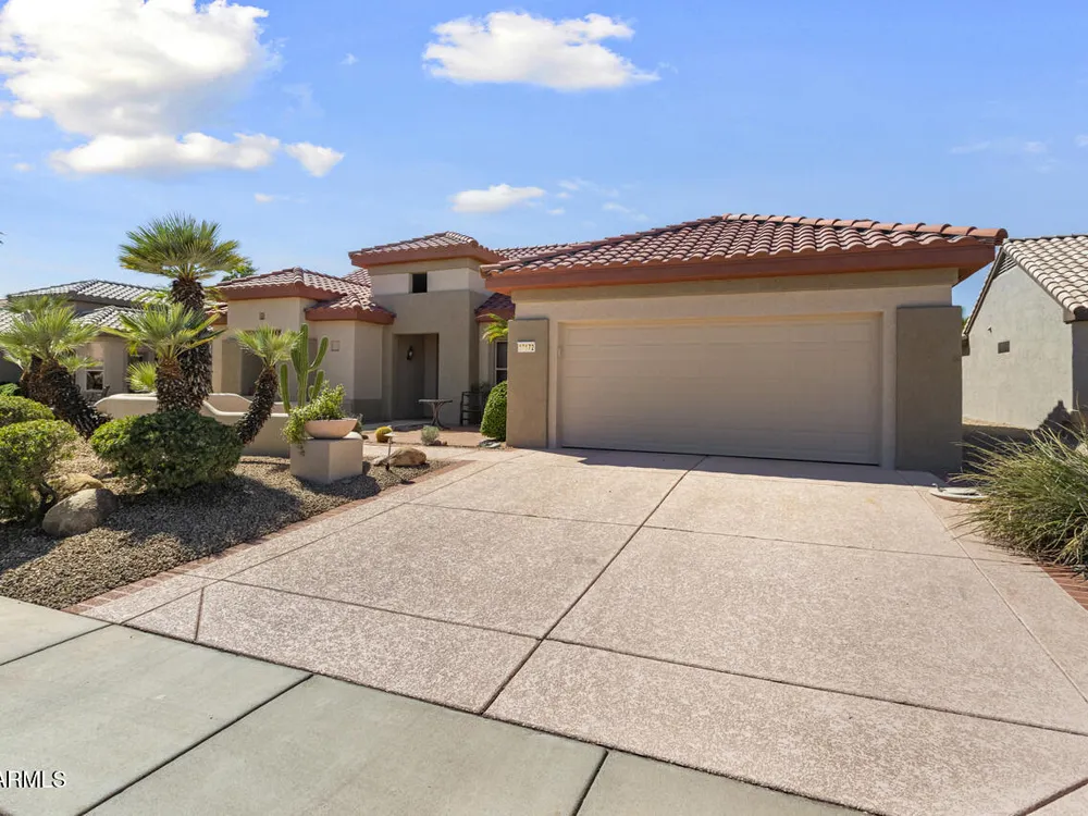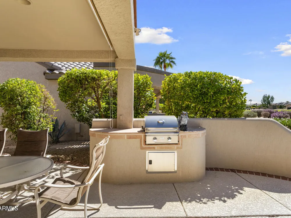 Beautiful Stonecrest on Granite Falls Golf Course with sweeping 180° fairway, mountain & sunset views! Enter through the charming front courtyard and step into a home loaded with updates: 2024 refrigerator & water heater, 2023 patio roof extension, 2022 roof, HVAC, garage door/opener, washer/dryer. Inside, enjoy new retiled floors, raised panel doors, a cozy fireplace, and a beautifully remodeled master bath with walk-in shower. Kitchen features newer dishwasher and plenty of storage. Laundry includes cabinets & sink. Outdoors, relax on the extended covered patio with NEW upgraded gas BBQ, knee wall, water feature, and fresh exterior paint. E/W exposure + extended garage with storage complete this move-in ready retreat. Perfect for entertaining or soaking in those Arizona sunsets!