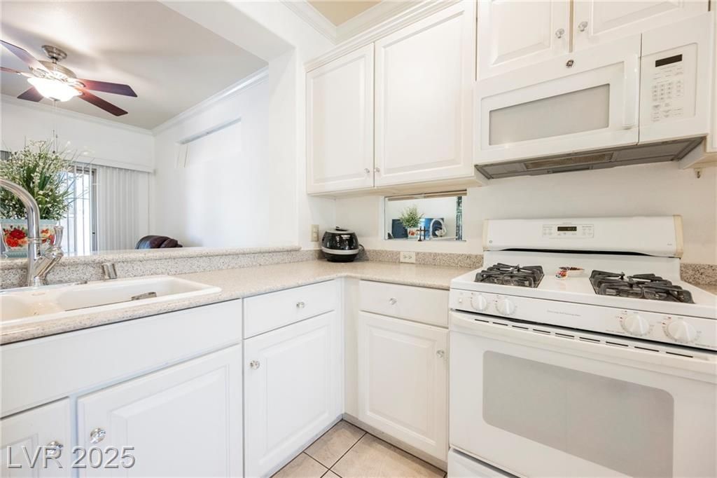 This popular Palm Desert model is move-in ready and filled with thoughtful upgrades. The open floor plan showcases 17" ceramic tile in high-traffic areas and new laminate wood-look flooring in the bedrooms. A versatile living room with ceiling fans and abundant natural light creates a warm, inviting atmosphere. The kitchen features upgraded cabinets, granite countertops, matching appliances, a large pantry, and a sunny breakfast nook. The primary suite offers dual sinks and a charming bay window. The two-car garage provides excellent storage, while the newly landscaped front yard adds curb appeal and beautiful mountain views. The fully private backyard is designed for entertaining with a spacious covered patio, and natural gas hookup for barbecues. All of this is in Sun City MacDonald Ranch, a premier 55+ community with golf, tennis, pickleball, swimming, fitness, and endless social opportunities. A must-see home!