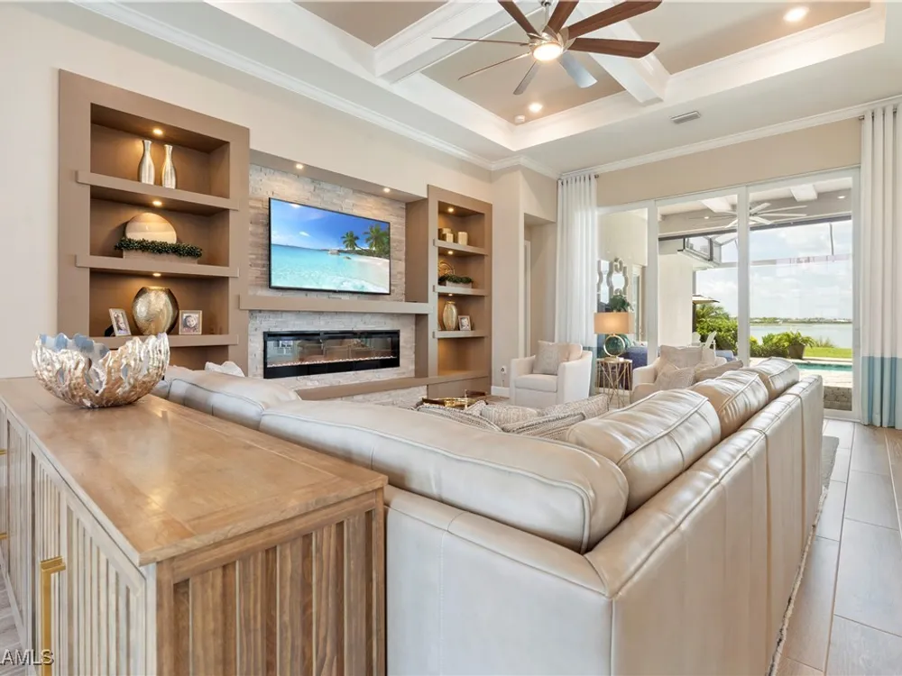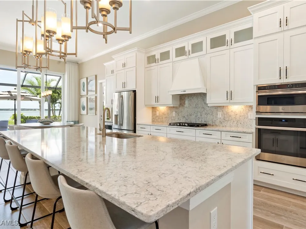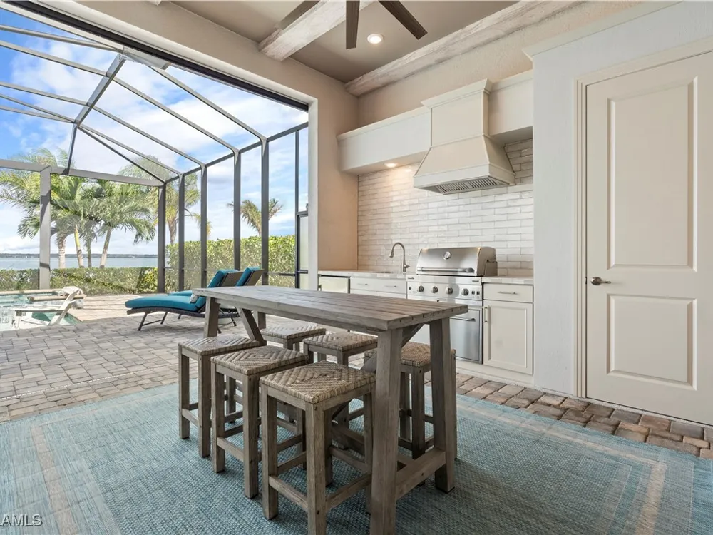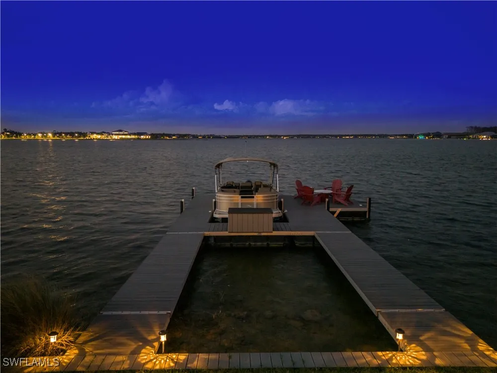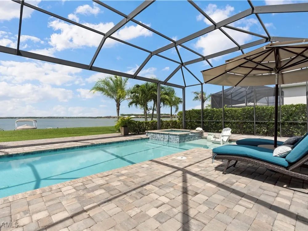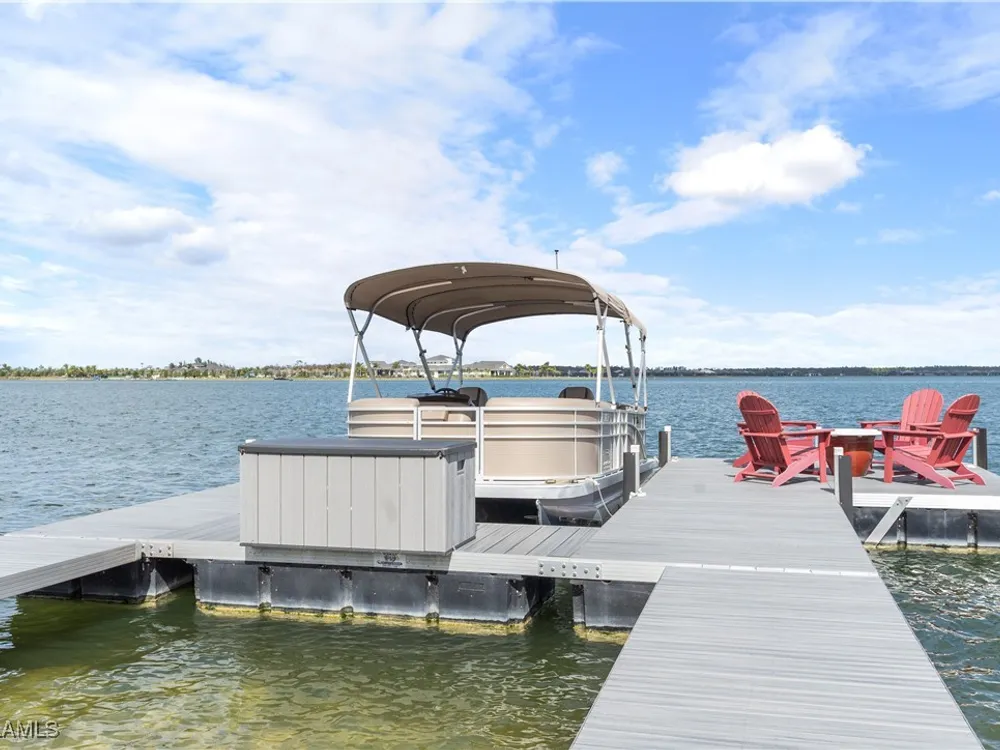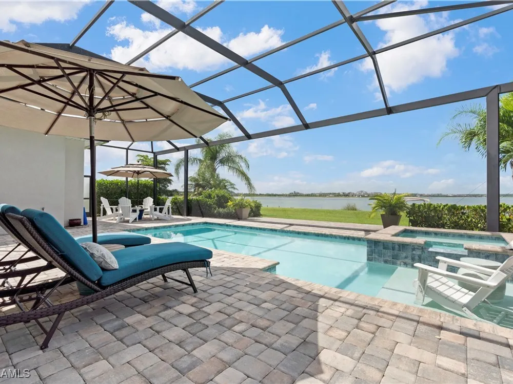 Welcome to this exceptional coveted Baneberry floor plan home, loaded with upgrades and located on the largest lake in the highly sought-after WildBlue community with a boat dock! Experience the ultimate Southwest Florida lifestyle with an expansive outdoor living space that offers the perfect setting for both relaxation and adventure. Enjoy multiple covered areas for dining, entertaining, and unwinding, including a full outdoor kitchen. Spend your days and nights soaking in the views, lounging on the sundeck, or taking a dip in the pool. For ultimate relaxation, unwind in the spa—all framed by breathtaking lake vistas through your picture-frame screen enclosure. Step outside to your private dock, where you can enjoy boating, waterskiing, or simply cruising on the lake just steps from your back door. This home offers nearly 3,200 square feet of beautifully appointed indoor living space with custom upgrades throughout. Upon entering, you are greeted by an elegant foyer, soaring ceilings, and the panoramic lake view that sets the tone for the entire home. The open-concept living, kitchen and dining areas create the perfect flow for entertaining family and friends. The gourmet kitchen is a chef's dream, featuring an oversized island, quartz countertops, built-in appliances, and beverage fridge. And yes, this is a natural gas community! The living area is designed for comfort and style, featuring a custom entertainment center, coffered ceilings, and an elegant fireplace. The thoughtfully designed split floor plan ensures privacy, with the primary suite offering dual walk-in closets, a custom reading nook, and a spa-like ensuite bathroom with a large walk-in shower, dual shower heads, a separate soaking tub, and dual vanities. Each guest bedroom is beautifully detailed with custom millwork and furniture, walk-in closets, and ensuite bathrooms. The fourth bedroom can also serve as a den or office, with a built-in desk, shelves, and closet. The oversized three-car garage provides ample space for vehicles, golf carts, toys, and more, including a dedicated Cadillac electric car charger. This home also offers impact windows and sliders, along with additional Storm Smart shutters on the lanai for peace of mind. WildBlue’s resort-style amenities await, just a short boat or bike ride away. The clubhouse features a lakeside beach, spa, a state-of-the-art fitness center with classes, indoor and outdoor dining options, a resort-style pool, a lap pool, and a racquets center with six Har-Tru tennis courts and eight pickleball courts with leagues and clinics. Other amenities include a basketball court, playground, bocce courts, and more. Conveniently located just minutes from premier shopping and dining destinations like Coconut Point, Gulf Coast Town Center, and Miromar Outlets, and with easy access to RSW airport, this home offers unparalleled convenience and lifestyle. Make this incredible home and lifestyle yours today!