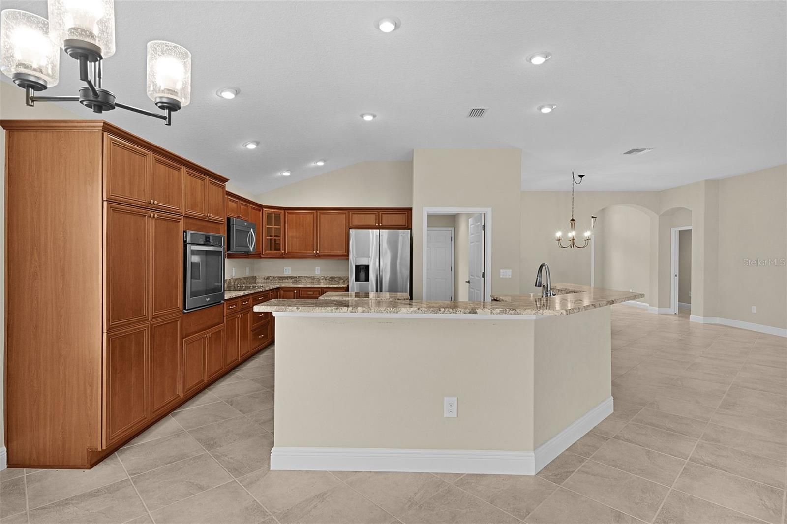 One or more photo(s) has been virtually staged. Welcome to this stunning Ivy model located in the desirable Village of Lake Deaton, nestled on a quiet cul-de-sac, approximately 2 miles from Brownwood Town Square. From the moment you arrive, the home impresses with its inviting entryway and elegant leaded glass front door. Step inside to discover a spacious layout featuring 4 bedrooms and 2 bathrooms, designed for both comfort and style. Notice the rounded corners throughout the home; a lovely high-end feature sure to impress. There is natural light throughout, giving the home a warm glow! This home was an infrequently used second home (total usage was 15 months). The heart of the home is the kitchen, showcasing granite countertops, stainless steel appliances, a separate island, built-in oven, and electric stove—a perfect setup for any home chef. A large breakfast nook and formal dining room provide plenty of space for casual meals or entertaining guests. Throughout the living areas, you’ll find ceramic tile flooring, while the bedrooms feature fresh, new carpet for added warmth and comfort. The master suite is a true retreat, highlighted by a rare garden tub, granite dual vanities, and a thoughtfully designed bath area—an uncommon luxury in The Villages. Relax and unwind in the expansive screened-in lanai, with ample room to add a pool if desired. Additional features include an extended 2-car garage PLUS a golf cart garage, offering plenty of storage and convenience. Lake Deaton is one of The Villages’ most sought-after locations, situated just north of Highway 44 and close to Brownwood Paddock Square, where you’ll enjoy shopping, dining, and nightly entertainment. This home combines elegance, space, and location—an exceptional opportunity to enjoy The Villages lifestyle to the fullest.
