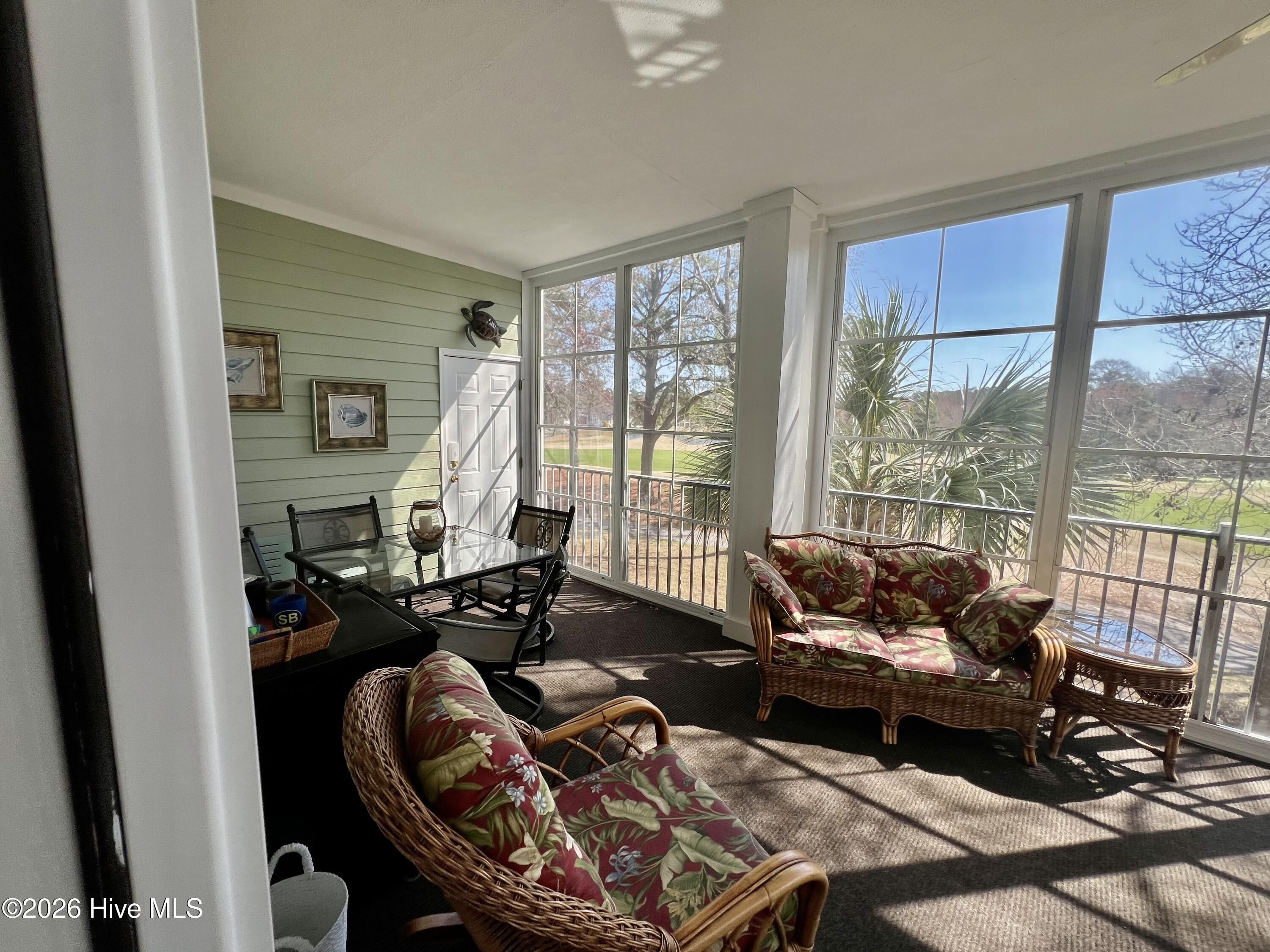 Beautifully decorated and fully furnished second-floor end unit offering breathtaking golf course and pond views in desirable Sea Trail Plantation. This spacious condo features 3 bedrooms and 3 full bathrooms, including a private guest suite with its own bath, making it ideal for full-time living, a second home, or investment property. The open living area showcases LVP flooring, crown molding, and a cozy gas fireplace, all positioned to take advantage of the stunning views of the Jones Course 5th fairway and tranquil pond. The kitchen offers Corian countertops, ample counter space, and a new stainless steel dishwasher, providing both style and functionality. The primary suite enjoys the same beautiful views and includes an updated bathroom with corian double vanity, attractive tiled walk-in shower, and his-and-her closets. Additional conveniences include a third full bath, stacked laundry area, elevator access, and two exterior storage closets. The highlight of this home is the impressive 11 x 23 three-season porch, offering one of the best golf and water views in Sea Trail, perfect for relaxing or entertaining while enjoying the peaceful coastal setting. Sea Trail Plantation offers exceptional amenities including three championship golf courses (Jones, Byrd, and Maples), two owner clubhouses, pools, indoor and outdoor hot tubs, fitness center, tennis and pickleball courts, meeting spaces, and private Sunset Beach parking. Enjoy nearby dining at Bistro 55 and Sunset Prime, all just minutes from the beautiful sands of Sunset Beach. With its spacious layout, impeccable condition, elevator access, and spectacular views, this condo presents a wonderful opportunity to own a piece of coastal living in one of Sunset Beach's premier communities.