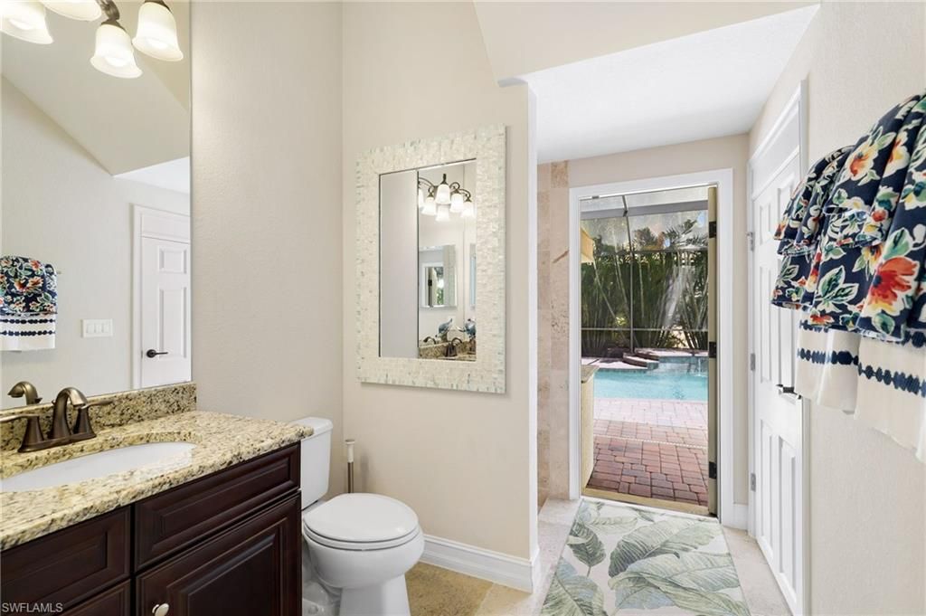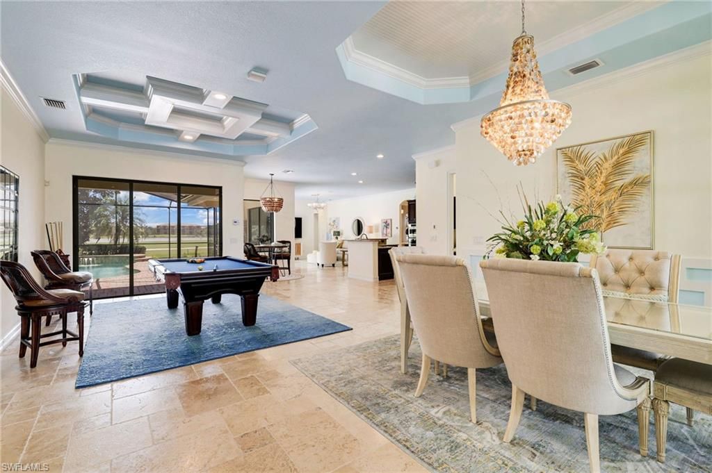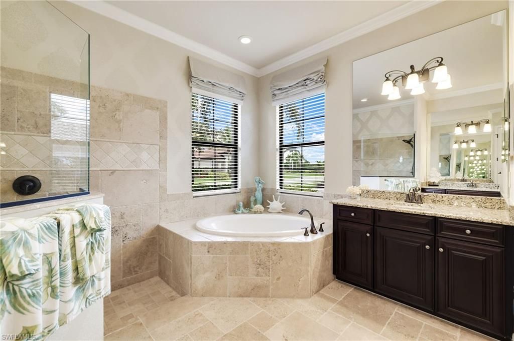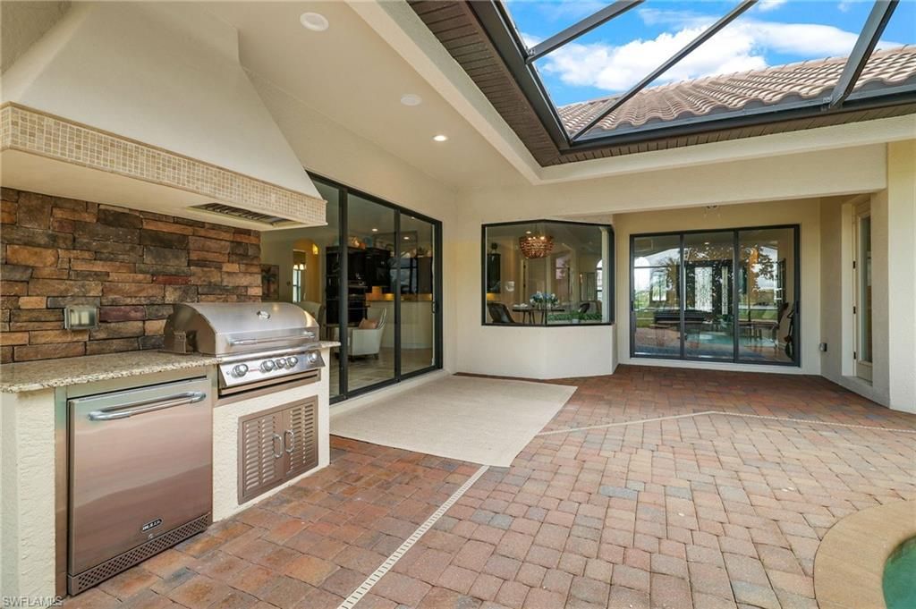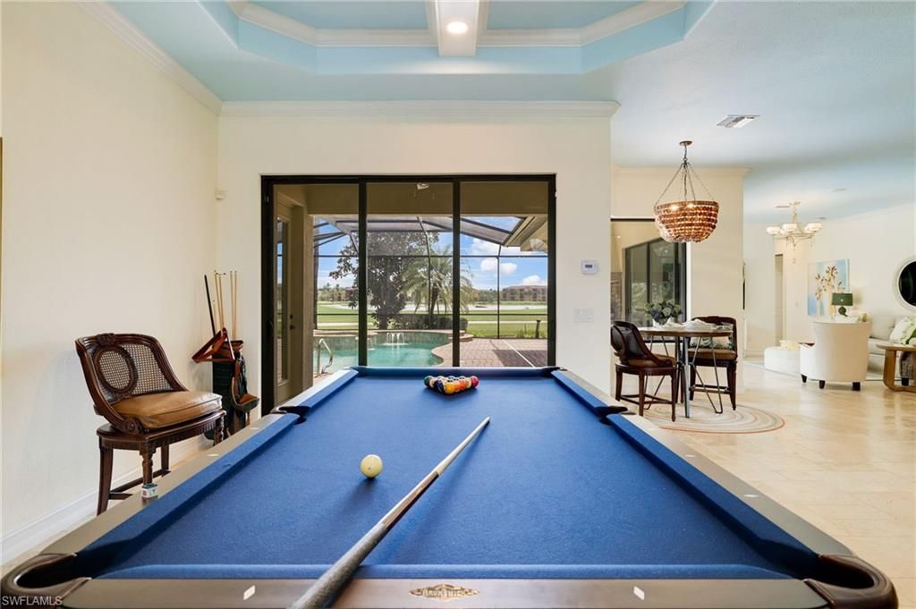 GOLF MEMBERSHIP INCLUDED. This "Toscana Grande" is perfectly located, offering easterly views of the main lake and 18th Hole, where you can enjoy a short walk to the clubhouse and amenities. The Toscana Grande is one of the largest homes that exists in Bonita National, perfect for large families, and this one is offered mostly FURNISHED. Boasting 3,301 sqft, 4 Bedrooms + Bonus Room Upstairs, 4 Full Bathrooms, 3 Car Garage, and Pool and Spa. The home offers a perfect blend of luxury, character, and comfort, with travertine flooring, custom wainscoting and mirrors, custom tray ceiling paneling, elegant light fixtures, a Kinetico Whole Home Water Purification System, "Photocatalytic" Air Purifiers on both HVAC Systems, and Impact Rated Windows and Doors. In the kitchen, the cooktop was replaced with a full-size range which is a chef's dream to have two ovens! An entire wall was removed to open the living space! Step outside to enjoy beautiful views of the golf course and main lake and effortlessly entertain with the built-in grill. BONUS: in flood-zone X so flood insurance is not mandatory. Bonita National has the best amenities in Southwest Florida highlighted by the resort-style pool with their showstopping rock waterfall and poolside bar and grill, championship-style golf with an over-sized practice facility and recently upgraded short game area, grand clubhouse with formal and informal dining, golf pro shop, card rooms, 8 Har-Tru lighted tennis courts, full service spa, and large fitness center. Pickleball and Bocce are coming soon to Bonita National! Located in the heart of SWFL, close to Bonita Beach, dining, shopping, RSW Airport, and the upcoming “Midtown at Bonita.”