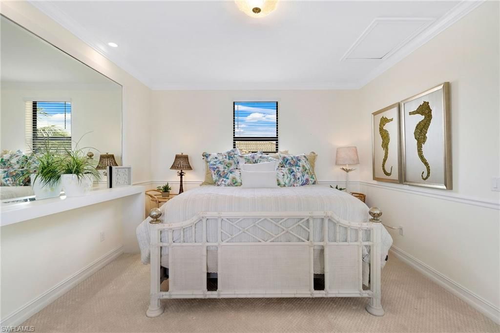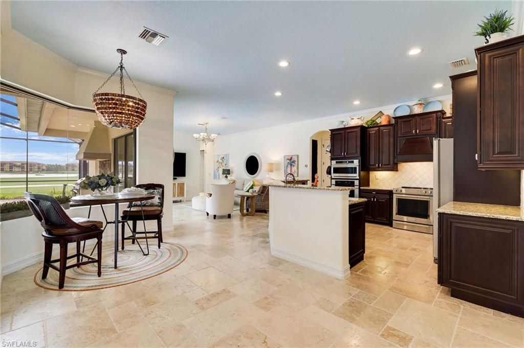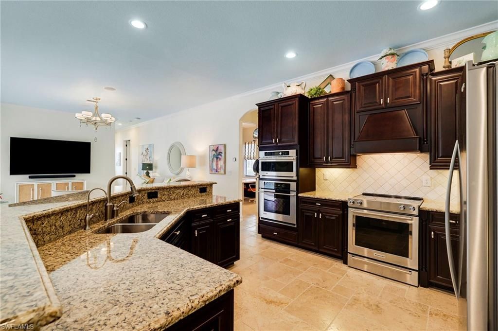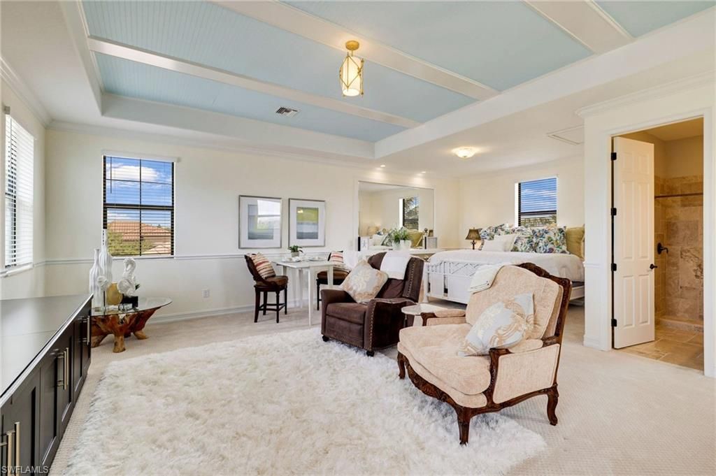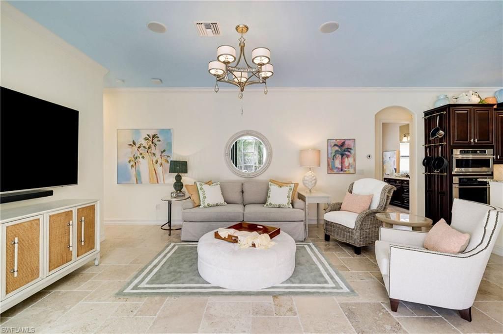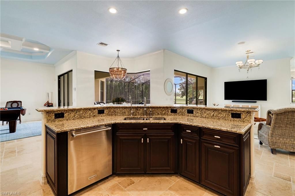 GOLF MEMBERSHIP INCLUDED. This "Toscana Grande" is perfectly located, offering easterly views of the main lake and 18th Hole, where you can enjoy a short walk to the clubhouse and amenities. The Toscana Grande is one of the largest homes that exists in Bonita National, perfect for large families, and this one is offered mostly FURNISHED. Boasting 3,301 sqft, 4 Bedrooms + Bonus Room Upstairs, 4 Full Bathrooms, 3 Car Garage, and Pool and Spa. The home offers a perfect blend of luxury, character, and comfort, with travertine flooring, custom wainscoting and mirrors, custom tray ceiling paneling, elegant light fixtures, a Kinetico Whole Home Water Purification System, "Photocatalytic" Air Purifiers on both HVAC Systems, and Impact Rated Windows and Doors. In the kitchen, the cooktop was replaced with a full-size range which is a chef's dream to have two ovens! An entire wall was removed to open the living space! Step outside to enjoy beautiful views of the golf course and main lake and effortlessly entertain with the built-in grill. BONUS: in flood-zone X so flood insurance is not mandatory. Bonita National has the best amenities in Southwest Florida highlighted by the resort-style pool with their showstopping rock waterfall and poolside bar and grill, championship-style golf with an over-sized practice facility and recently upgraded short game area, grand clubhouse with formal and informal dining, golf pro shop, card rooms, 8 Har-Tru lighted tennis courts, full service spa, and large fitness center. Pickleball and Bocce are coming soon to Bonita National! Located in the heart of SWFL, close to Bonita Beach, dining, shopping, RSW Airport, and the upcoming “Midtown at Bonita.”
