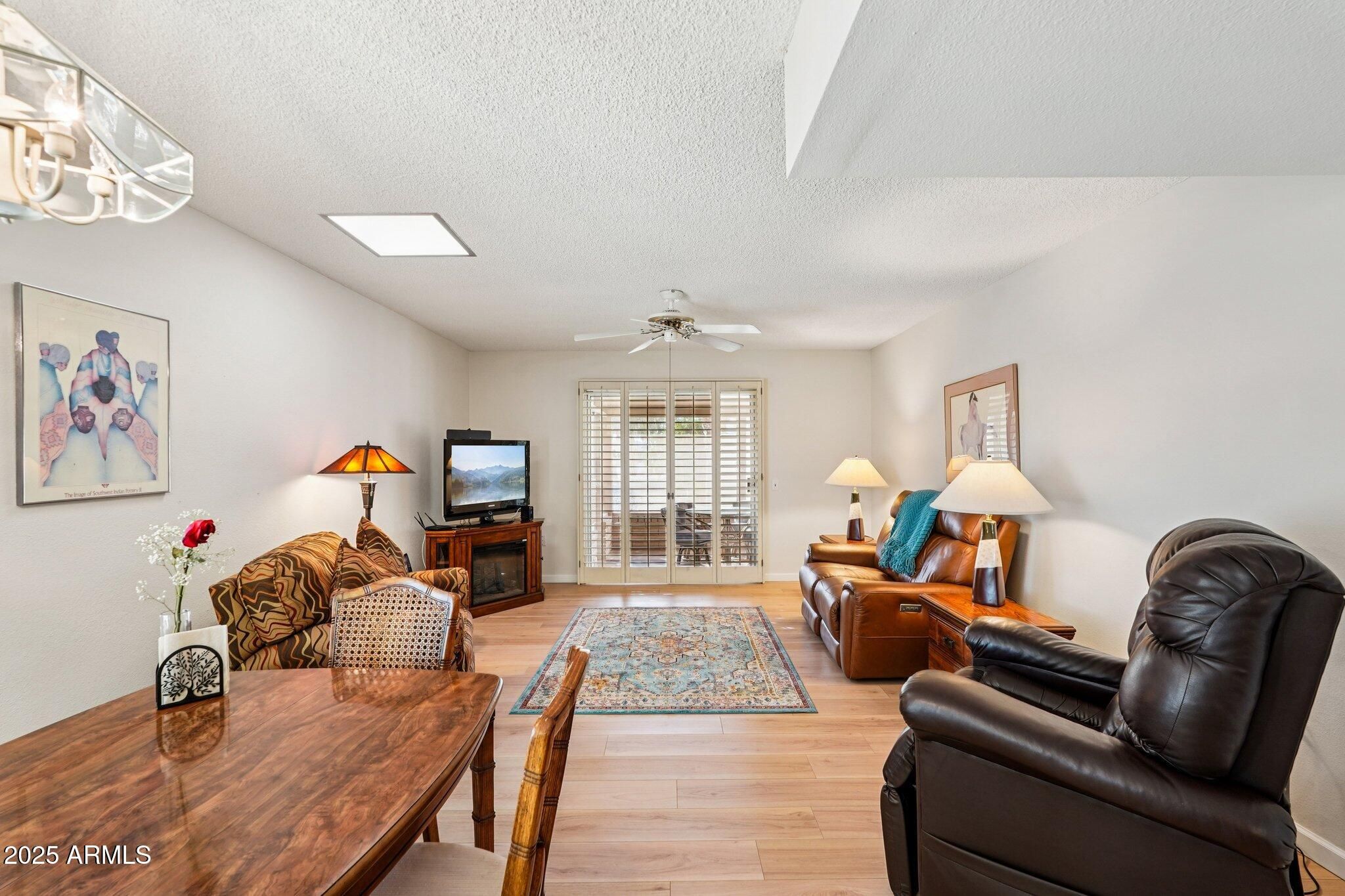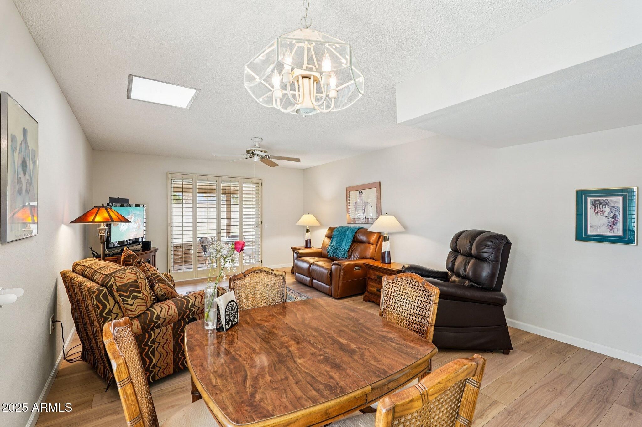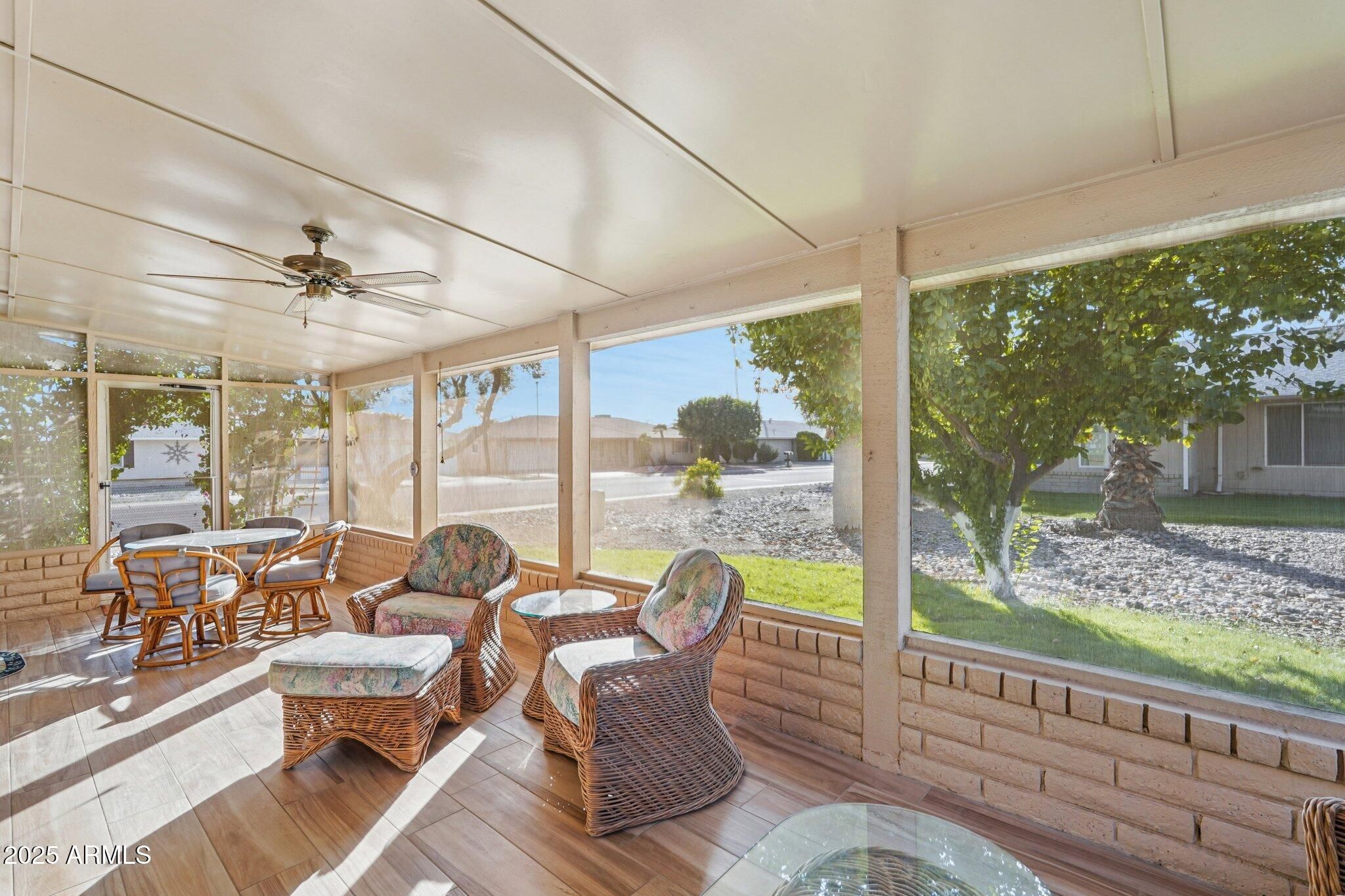 Welcome to this beautifully maintained home in the highly desirable active adult community of Sun City West! This home features woodgrain vinyl plank and tile flooring throughout, giving the home a warm, updated feel. The floor plan offers both a large living room and a separate family room, providing the perfect setup for entertaining guests or relaxing in multiple spaces. Enjoy meals in the formal dining room or the cozy breakfast nook just off the kitchen, which also includes a convenient pantry. The spacious primary suite features a three-quarter bath and a walk-in closet, while the guest bedroom and bath provide comfort and privacy for visitors. Step outside to enjoy two separate outdoor living areas—a welcoming front courtyard and a large screened-in back patio.