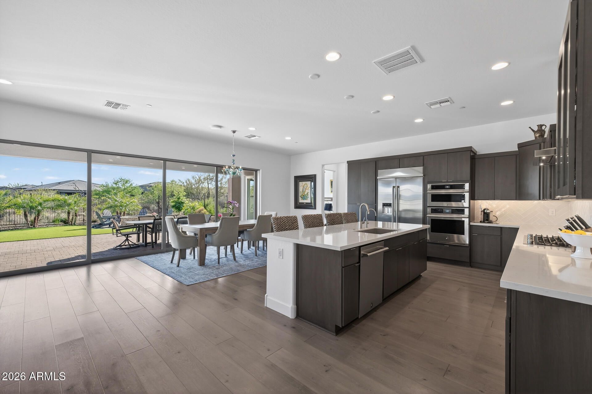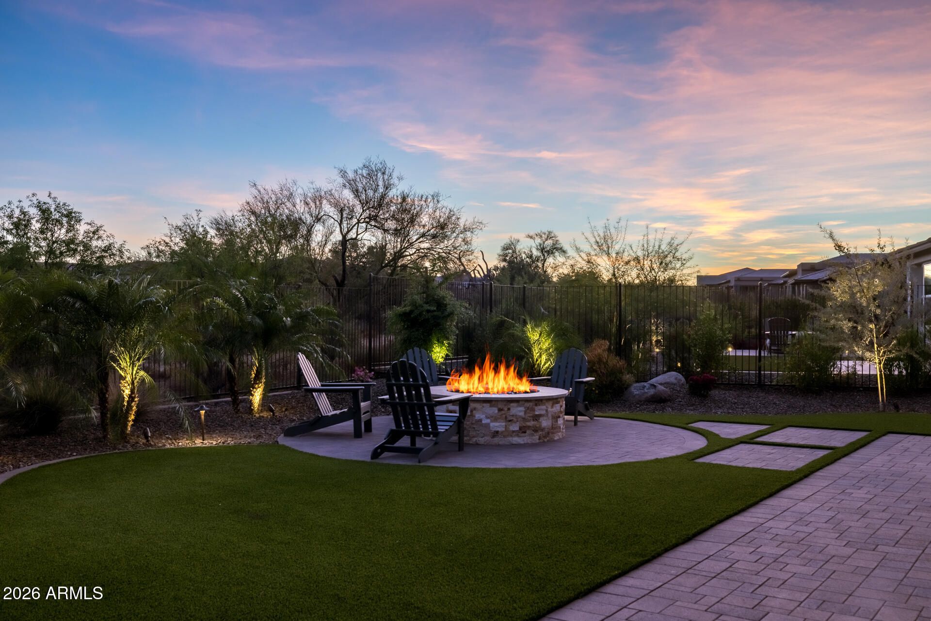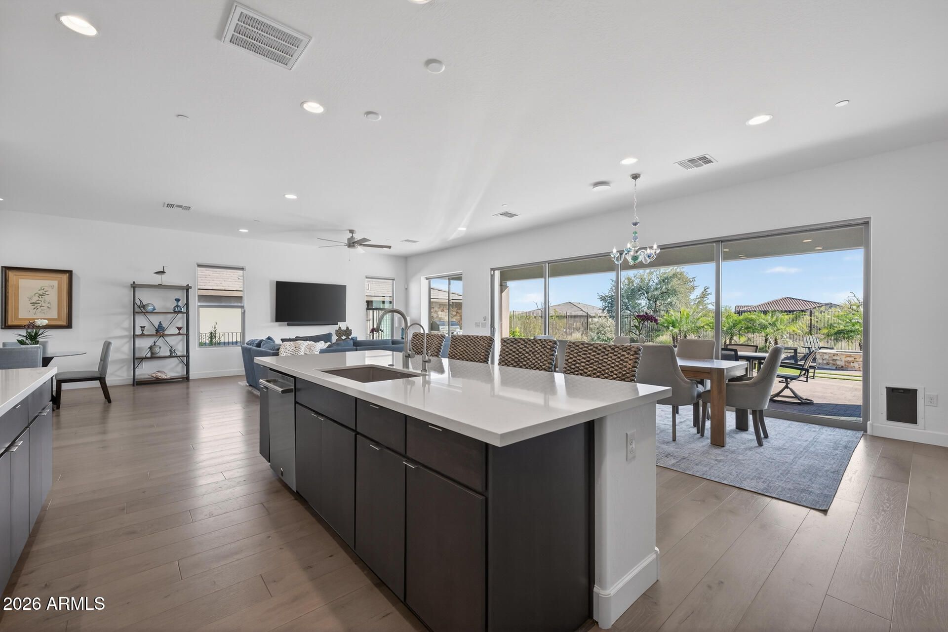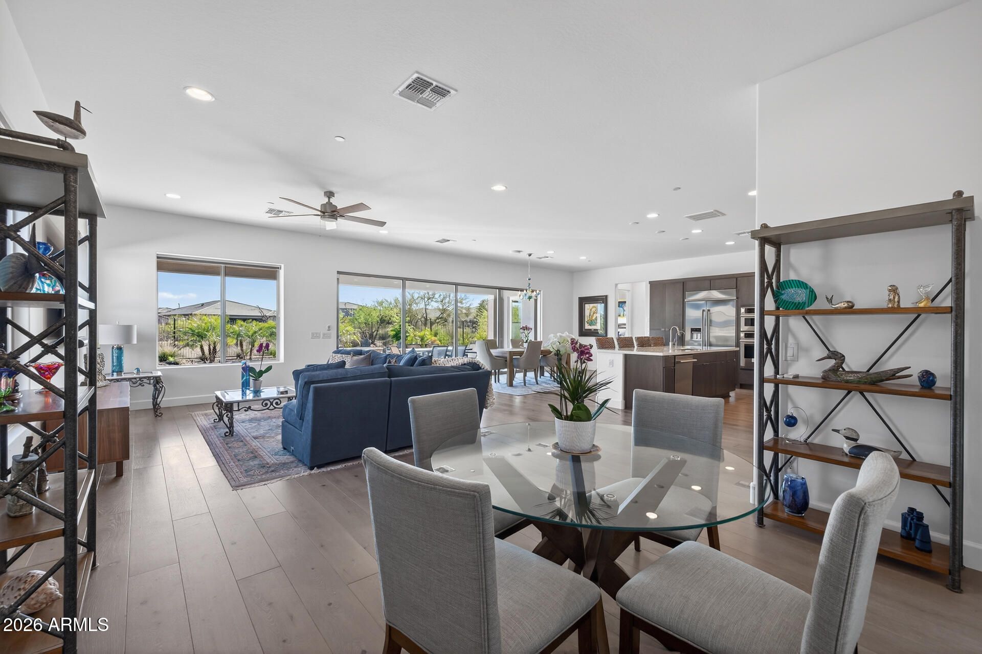Discover easy desert living in this Cordoba layout in Trilogy at Verde River. Set on an oversized lot with incredible views of Four Peaks, this 2,881 sq ft, 3-bedroom, 3-bath home also features a den and a private casita. The gourmet kitchen is beautiful with built-in stainless steel appliances, opening to a bright great room with a multi-panel slider leading to a large covered patio. Whether you're hosting or relaxing, you'll enjoy the built-in bar with beverage fridges and wine storage, plus an upgraded AV sound system throughout. The primary suite offers a peaceful escape with a soaking tub, dual sinks, and a beautifully tiled shower. A 4-foot extended garage adds extra flexibility and storage. Step outside to enjoy the extended patio, stacked stone built-in BBQ, and a thoughtfully designed backyard featuring Sonoran desert landscaping, artificial grass, ambient lighting, and a fire pit. This home truly has it all. The amenities at Verde River are World Class with Tom Lehman inspired eighteen-hole Golf course, tennis courts, pickleball courts, and bocce ball, heated lap pool and Resort style swimming pool, hot tub, Afterburn fitness center, Helen's demonstration Kitchen for cooking classes and a 7.5 acre dog park. The community center has casual poolside dining at Eddy's Diner and gourmet dining at award-winning Needle Rock Kitchen and Tap, Alvea Spa with full-service Salon and Spa amenities, Art Loft and events center. Trilogy at Verde River is adjacent to the Tonto National Forest and is situated in the middle of miles and miles of hiking and biking trails.