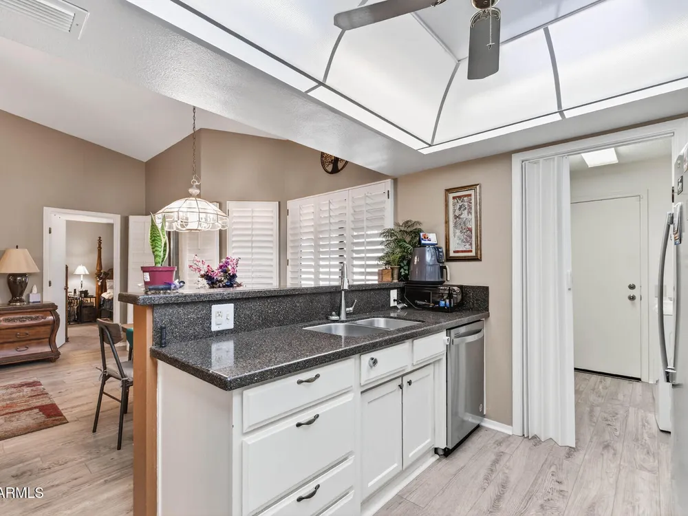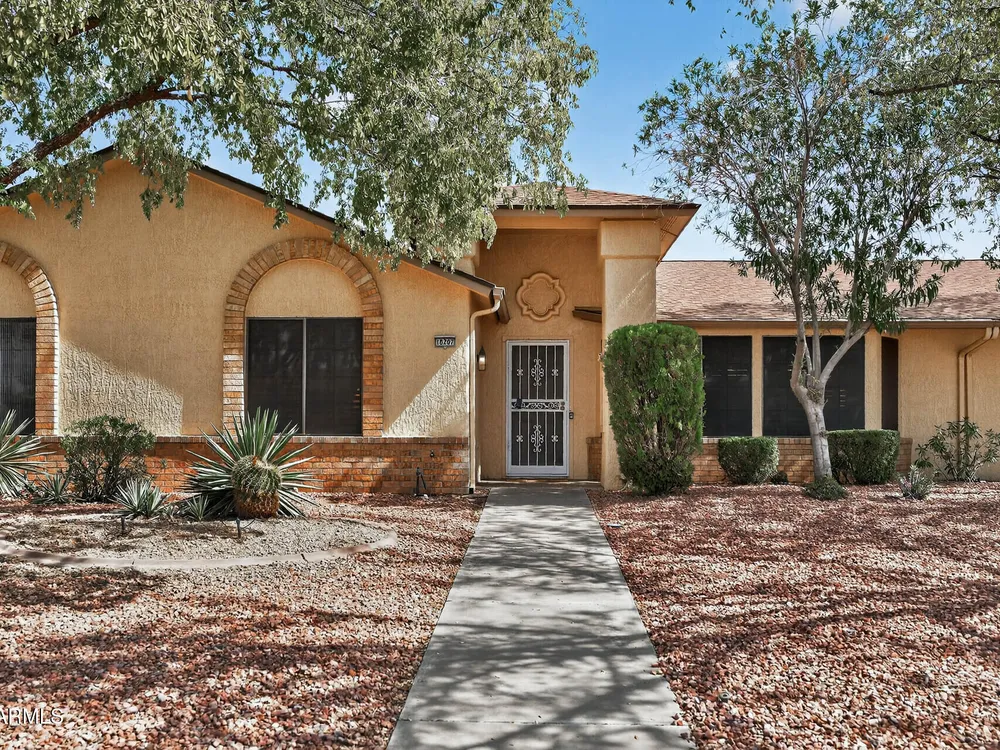 A lovely updated Pueblo model garden apartment in the heart of Sun City West, AZ! Enjoy modern touches throughout—quartz countertops, newer appliances, fresh paint, plantation shutters, updated flooring, and no popcorn ceilings. Major systems have been done too: newer HVAC, roof, (the Association covers the roof repairs and replacement) and dual-pane windows. Both bedrooms feature walk-in closets; the primary bath includes double sinks and a private toilet room. The inviting back courtyard offers a covered patio, double gate, and slab—perfect for golf cart or bike parking. With ample pantry and garage storage and a prime central location in this desirable 55+ community, this home is move-in ready and full of charm!