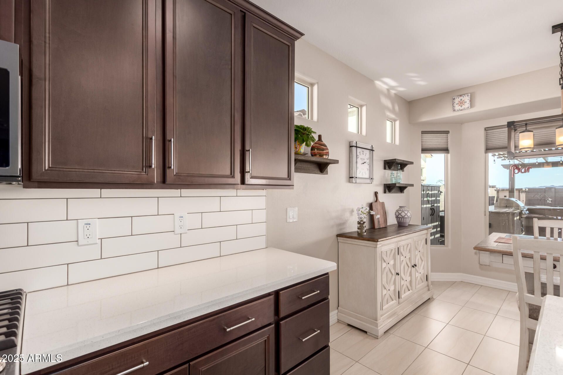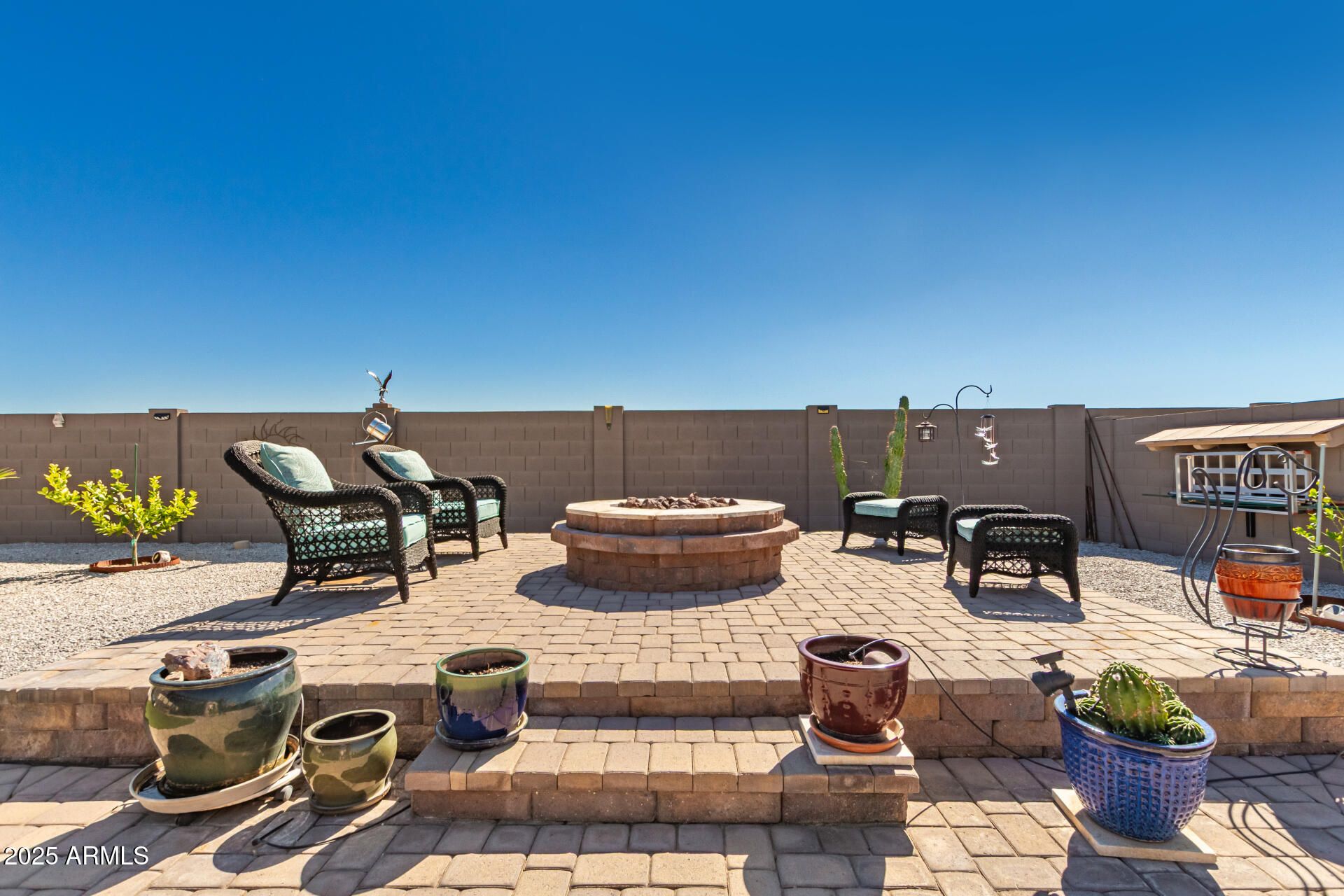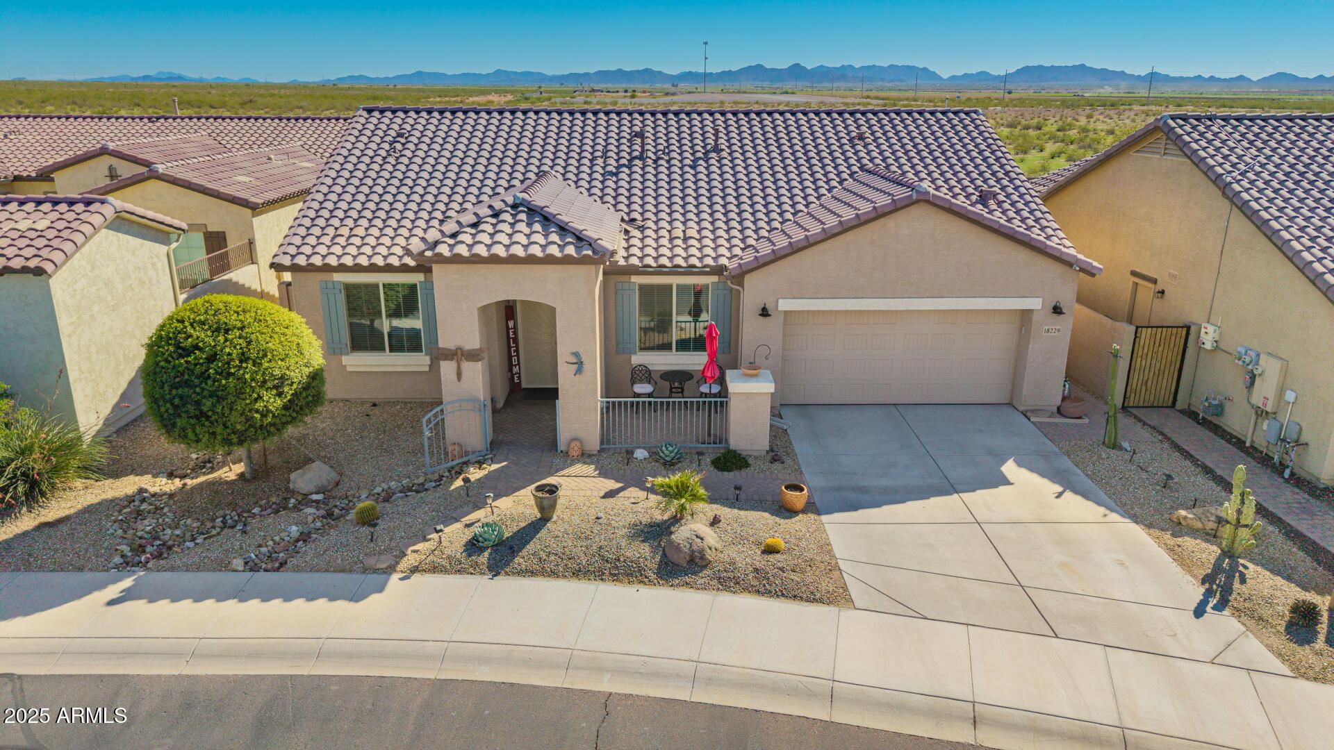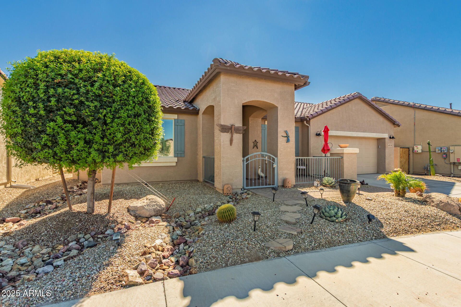 Welcome Home! Impeccable View Home in the desirable adult community of CantaMia! Inside you will find open bright living spaces with upgrades galore that include tile flooring, built in wine bar, entertainers kitchen complete W/ upgraded cabinetry, White Quartz countertops, tile backsplash, stainless steel appliances,and an island with a breakfast bar perfect for entertaining. The primary suite overlooks amazing yard and hosts a bathroom with double sinks and a walk-in closet. Step Outside to private oversized yard with no one behind, views galore - Relax with raised patio area, Entertain at this oversized built-in BBQ, island! Perfect for indoor outdoor living! Enjoy resort style living with access to lakes, fitness centers, community pools and a vibrant calendar of social events! Upgrade list for 18229 W. Cedarwood Goodyear View Lot Pergola with Oversized built in BBQ island Raised Paver patio with firepit Paver and Synthetic grass yard Upgraded Cabinetry throughout Upgraded Ceiling Fans throughout Upgraded Wood look tile flooring throughout Newer Carpet Upgraded window treatments and drapes Quartz island and counter tops Custom Tile backsplash Stainless appliances Pendant lighting Additional shelving installed in each closet Dual sink vanity in Ensuite w/ quartz counters Large walk in shower Laundry room has sink and built in cabinets RO water system Built in wine bar with matching cabinets, subway tile and built in frige Consistent flooring, paint, counters throughout Front paver courtyard Iron Security Door Surround sound system Upgraded mirrors and lighting fixtures in bathrooms Cabinets in Garage Storage shed