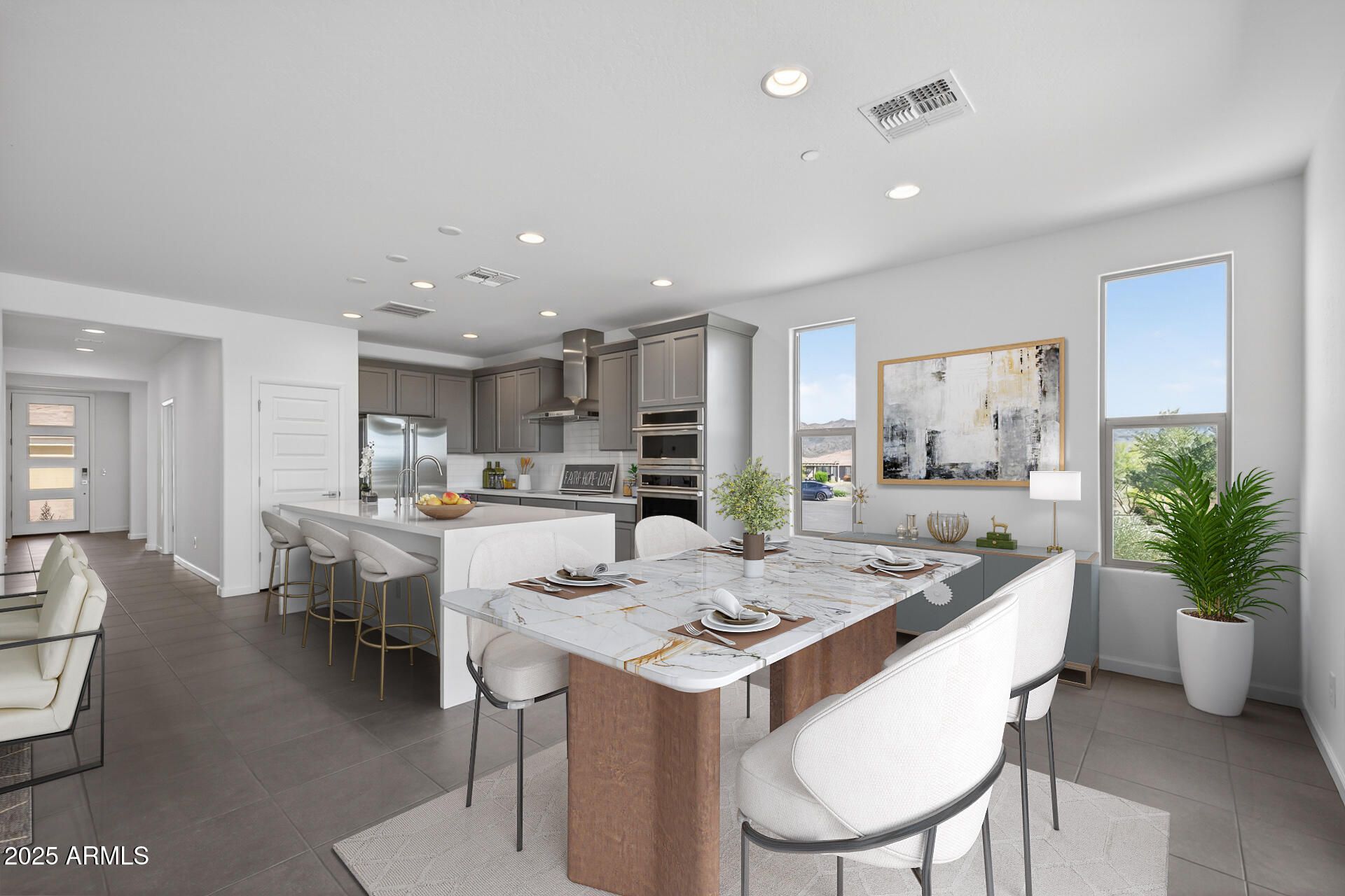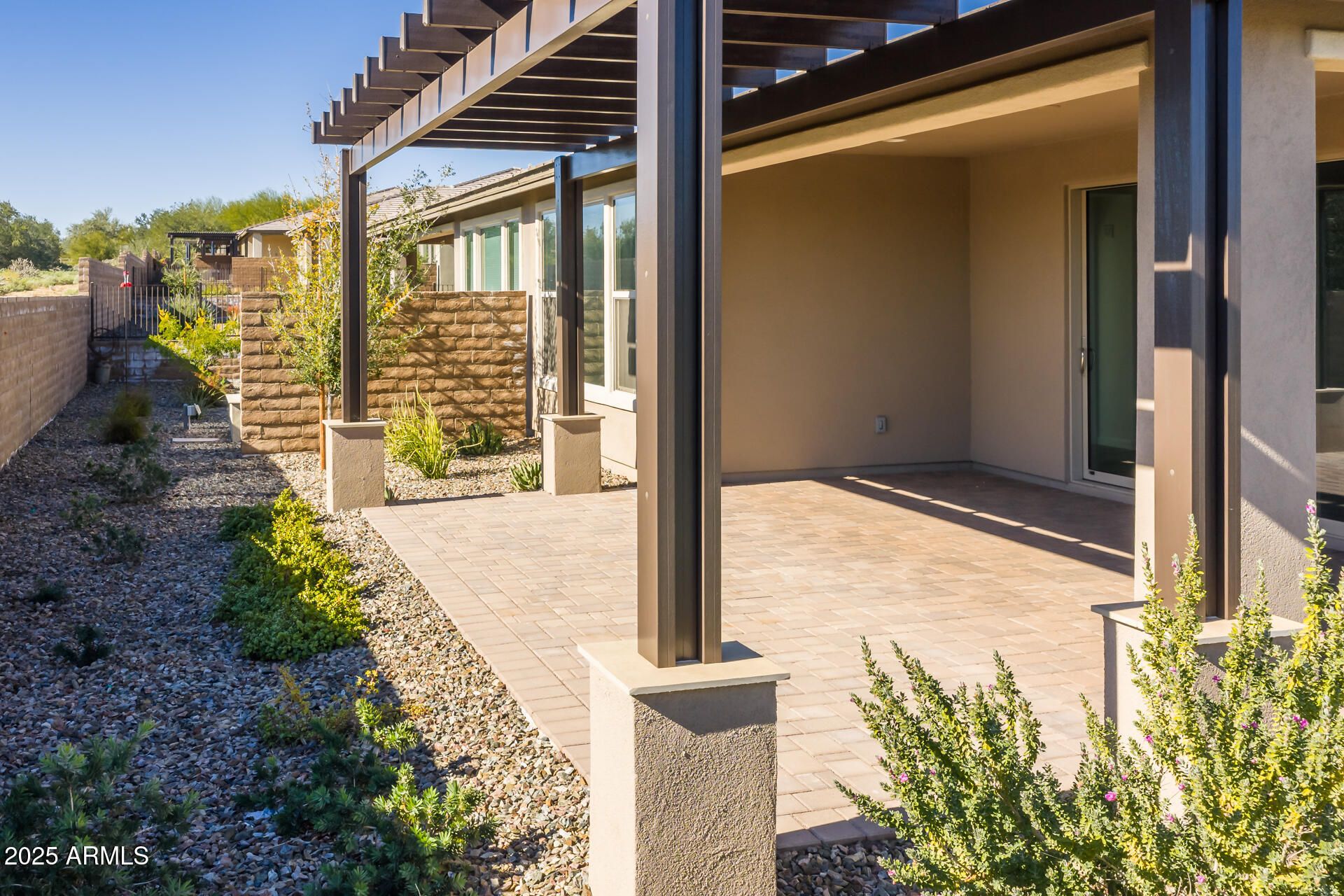 Discover refined luxury in this beautifully appointed Valletta floorplan. The great room features an impressive multi-slide door that opens to stunning mountain views, creating the perfect indoor-outdoor living experience. The gourmet kitchen is a showstopper with built-in Monogram stainless steel appliances, quartz countertops, a striking waterfall-edge island, soft-close cabinetry, and convenient roll-out drawers. Step outside to enjoy the elegant platinum pergola, ideal for relaxing or entertaining. Additional upgrades include both RO and soft water systems, enhancing everyday comfort. Thoughtfully designed with upscale finishes throughout, this home blends style, function, and scenic surroundings. The amenities at Verde River are World Class with Tom Lehman inspired eighteen-hole Golf course, tennis courts, pickleball courts, and bocce ball, heated lap pool and Resort style swimming pool, hot tub, Afterburn fitness center, Helen's demonstration Kitchen for cooking classes and a 7.5 acre dog park. The community center has casual poolside dining at Eddy's Diner and gourmet dining at award-winning Needle Rock Kitchen and Tap, Alvea Spa with full-service Salon and Spa amenities, Art Loft and events center. Trilogy at Verde River is adjacent to the Tonto National Forest and is situated in the middle of miles and miles of hiking and biking trails.