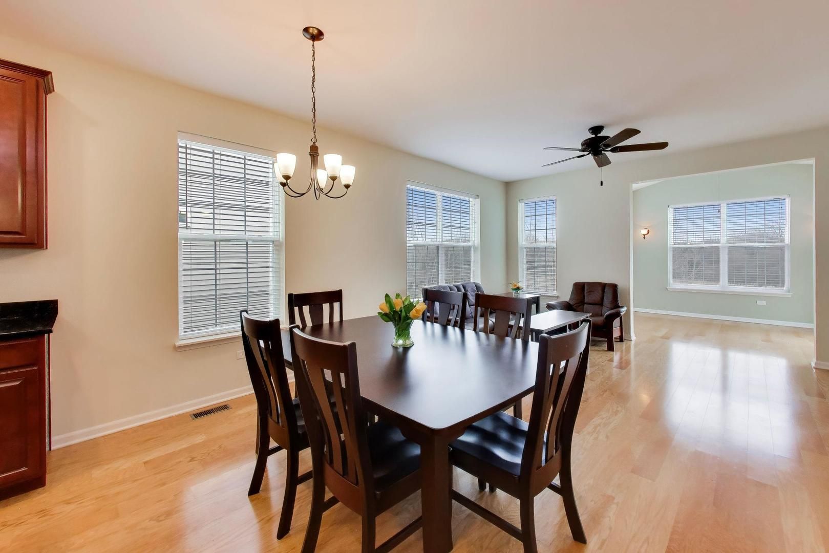 Welcome to your dream ranch home in the serene, 55+ community of Remington Point. This stunning brick-front, two-bedroom, two-bath residence features a versatile den and a partially finished walkout basement with a charming brick patio. Inside, hardwood floors flow seamlessly throughout, while the open-concept living and kitchen area boasts a central island, stainless steel appliances, and gorgeous cherry cabinets with granite countertops. Relax in the family room under vaulted ceilings, a ceiling fan, and expansive windows that overlook a peaceful nature area. The oversized deck, main floor laundry, and a spacious primary suite with a walk-in closet make this home perfect for comfortable, low-maintenance living. Plus, enjoy community amenities like pickleball courts, a clubhouse, fitness center, bocce and 1/4 mile walking path- everything you need to stay connected and active. The reasonable HOA also includes lawn care and snow removal, making life easy! Don't miss this gem!