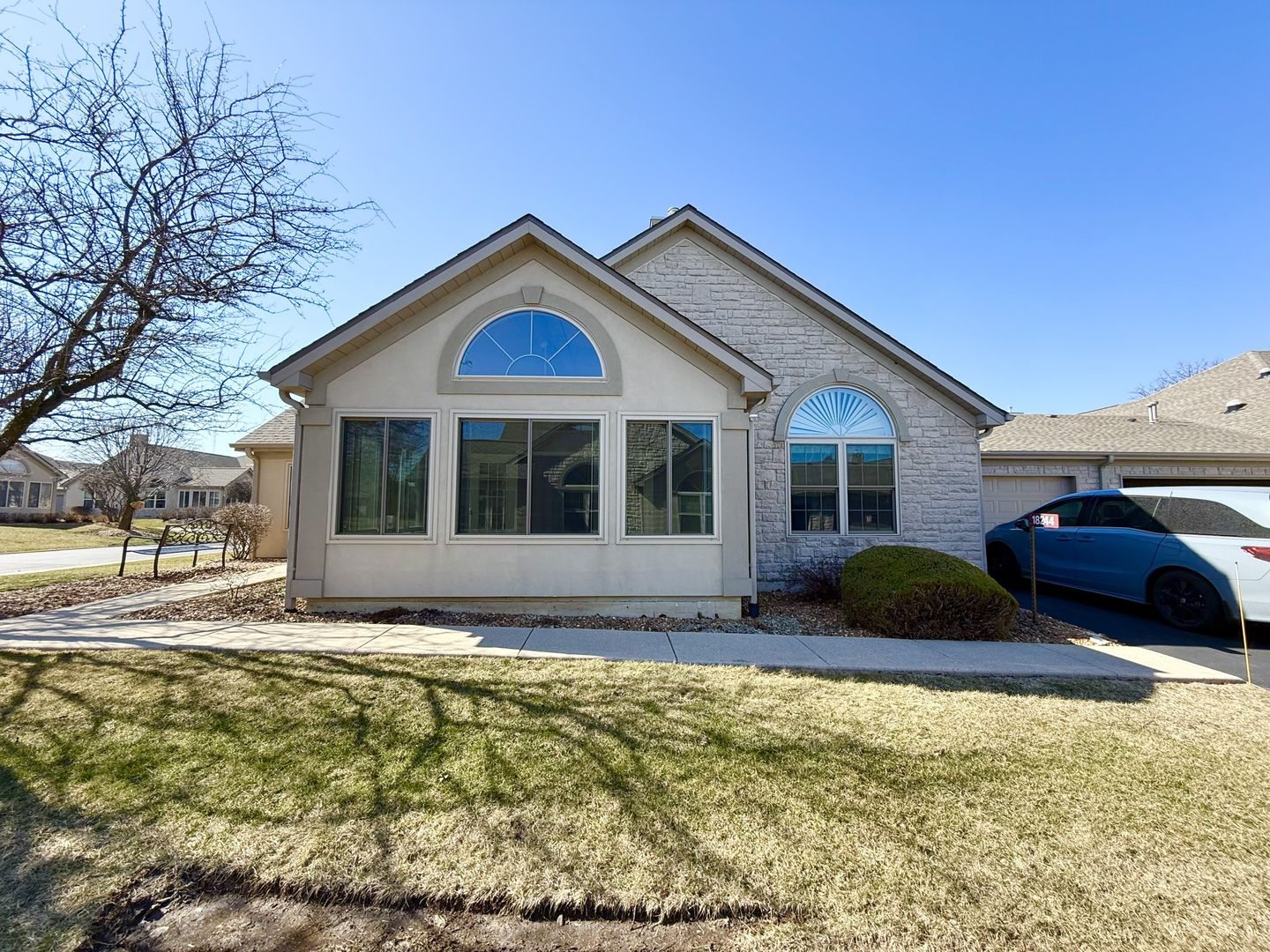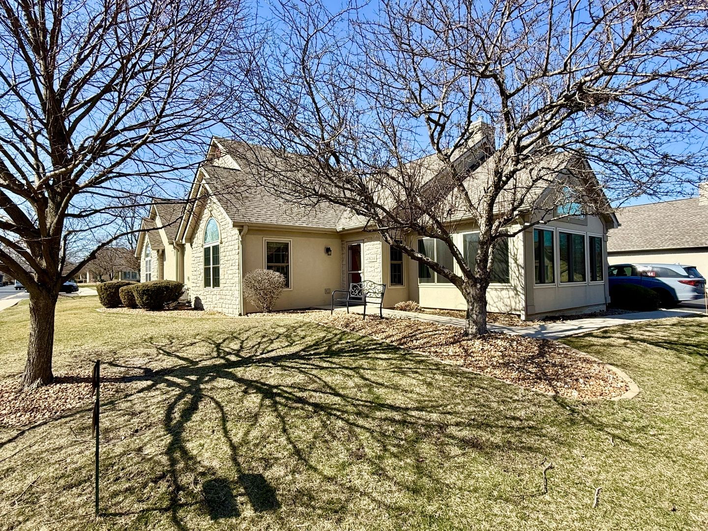 Welcome to Heritage Club Villas, a beautifully maintained ranch townhome-style condo offering easy, comfortable living in a peaceful 55+ community. This move-in ready 2-bedroom, 2-bath home features an open layout with vaulted ceilings, wood and wood-laminate flooring, and a cozy gas fireplace with Heatilator. The updated kitchen includes stainless steel appliances, quartz countertops, a breakfast bar, and abundant workspace-perfect for everyday living or entertaining. A bright four-season sunroom extends the living space year-round. The primary suite offers a private bath and generous walk-in closet, while the split bedroom design provides privacy for guests. The second bedroom is spacious and versatile. Enjoy the convenience of an attached 2-car garage and private driveway, along with recent updates to the appliances, furnace, and air conditioning. Residents enjoy an active yet peaceful lifestyle with access to the community clubhouse, outdoor pool, and exercise room. (55+ community; reserve for under-55 owners not met as of list date.) A truly well-cared-for home that is ready for its next owner.