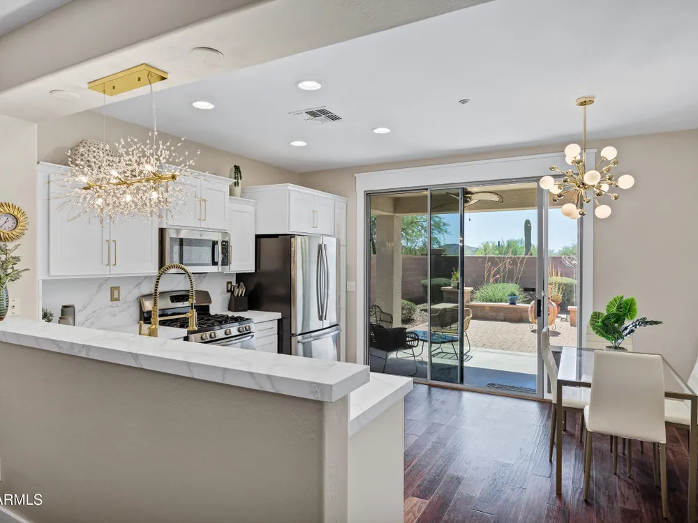 Discover this inviting 2-bedroom, 2-bath home nestled in the highly sought-after Anthem Country Club. Fresh exterior paint was completed in November 2023, enhancing the home's curb appeal. Inside, thoughtful updates completed in 2016 include custom soft-close cabinetry, lava stone countertops, stainless steel appliances with a gas range, warm wood flooring, and beautifully upgraded bathrooms with travertine stone and coliseum granite finishes. The north/south orientation of the backyard ensures privacy while offering peaceful mountain views, making it a perfect retreat. Living in Anthem Country Club means access to an unparalleled lifestyle—two premier golf courses, fitness centers, heated pools, tennis and pickleball courts, walking trails, parks, and more.
