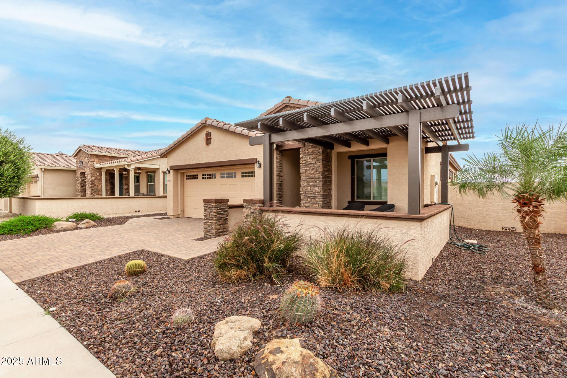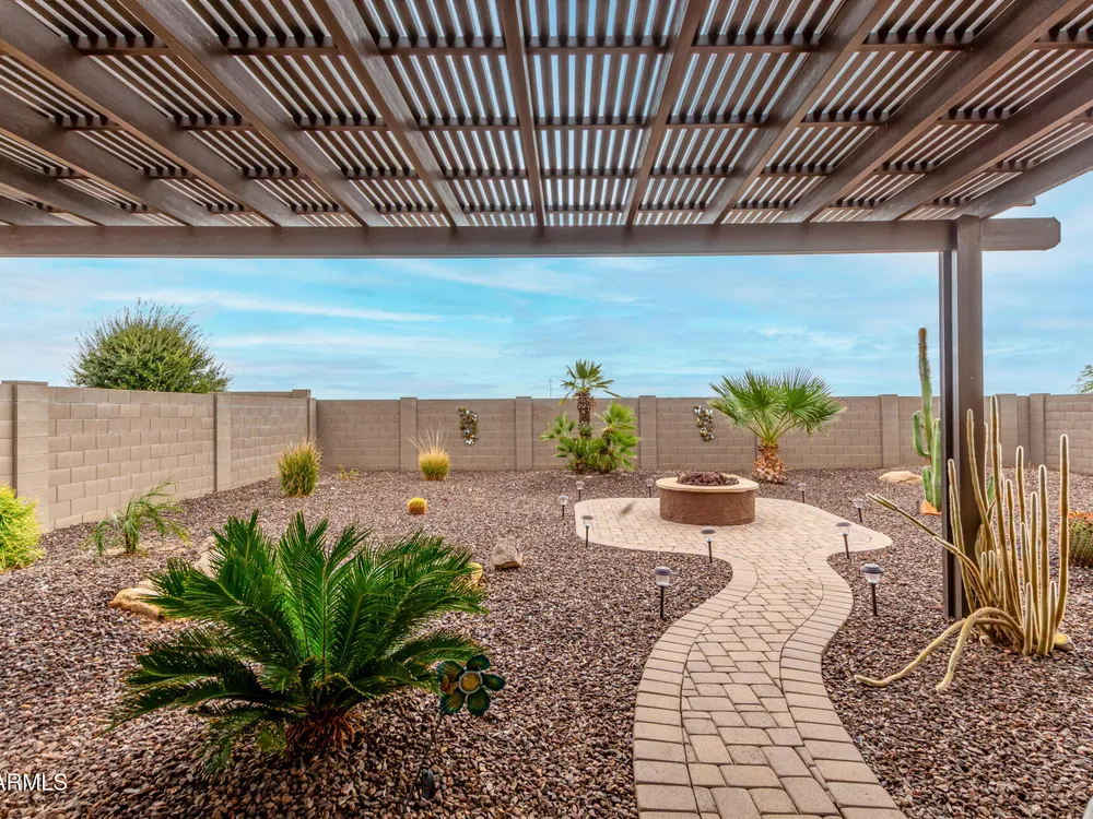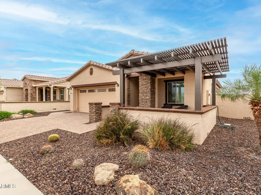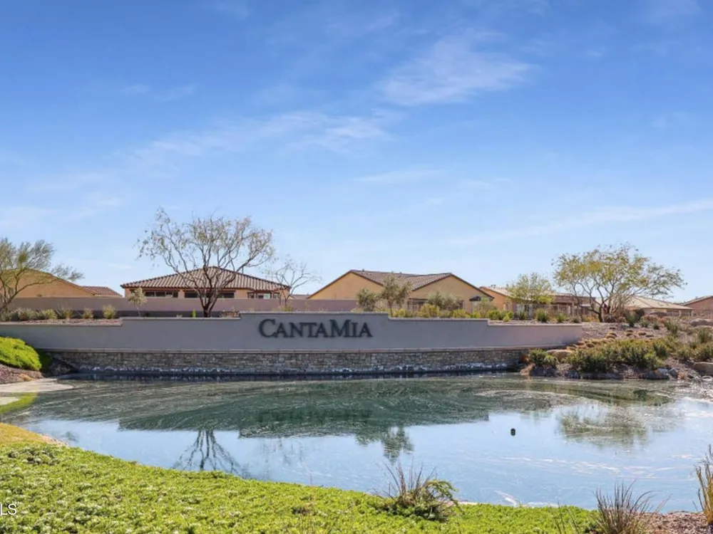 Experience vibrant adult living in CantaMia! This stunning 2-bedroom home welcomes you w/ a 2-car garage, stylish pavers, eye-catching stone accents, & an inviting front patio. Discover a serene great room w/ high ceilings, a soothing palette, classic plantation shutters, and wood flooring. The gourmet kitchen comes w/ granite counters, wood shaker cabinets w/ crown moulding, pendant/recessed lighting, a mosaic tile backsplash, stainless steel appliances, & an island w/ a breakfast bar for casual meals. The primary bedroom showcases a cozy sitting nook, an ensuite w/ dual sinks, & a walk-in closet. Imagine tranquil moments in the lovely backyard, boasting a covered patio, a picturesque desert landscape, breathtaking mountain views, & a fire pit for starlit evenings. Make this yours!