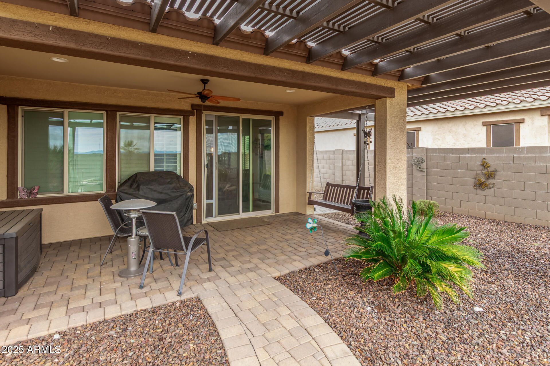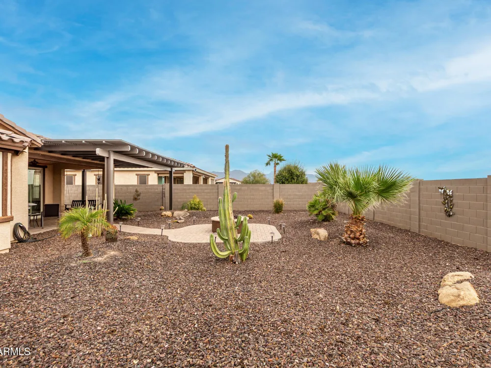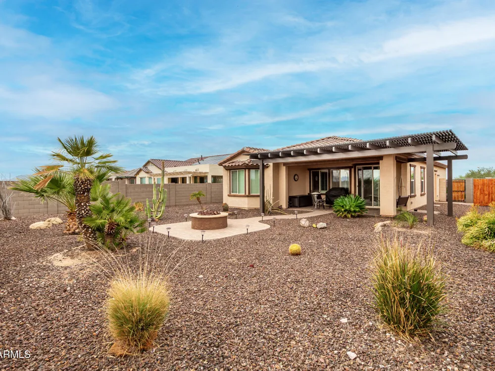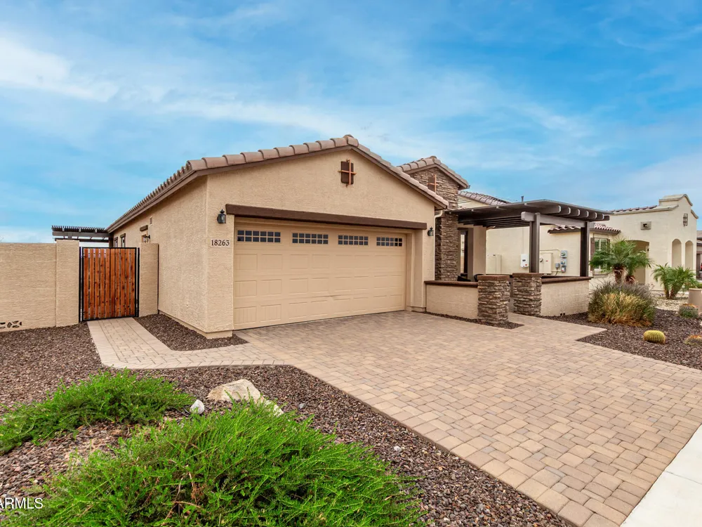 Experience vibrant adult living in CantaMia! This stunning 2-bedroom home welcomes you w/ a 2-car garage, stylish pavers, eye-catching stone accents, & an inviting front patio. Discover a serene great room w/ high ceilings, a soothing palette, classic plantation shutters, and wood flooring. The gourmet kitchen comes w/ granite counters, wood shaker cabinets w/ crown moulding, pendant/recessed lighting, a mosaic tile backsplash, stainless steel appliances, & an island w/ a breakfast bar for casual meals. The primary bedroom showcases a cozy sitting nook, an ensuite w/ dual sinks, & a walk-in closet. Imagine tranquil moments in the lovely backyard, boasting a covered patio, a picturesque desert landscape, breathtaking mountain views, & a fire pit for starlit evenings. Make this yours!