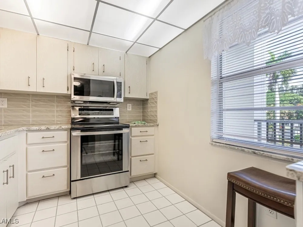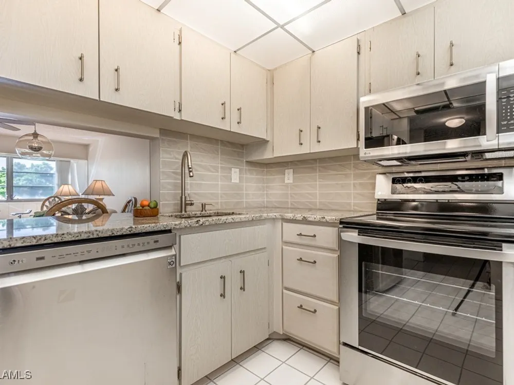 Move Right In just bring your personal possessions!!! This condo has been updated with an open floor plan with lots of natural light. One bedroom, one and a half bathrooms which makes this unit desirable. The Kitchen has newer Granite on countertops and tiled backsplash completed just 4 years ago, along with new stainless-steel appliances (2021). Brand new luxury vinyl in bedroom and walk in closet (2024). No carpet in this unit. Brand new Impact Resistant Windows throughout the unit (2023). The open lanai area has a sleeper sofa for your guest to come and visit. The Condo is offered Turnkey with a few electronic exceptions. This condo is conveniently located close to the laundry and elevator. Seven Lakes Community is an active 55+ community where your amenities are included in your condo fee: Which include bundled golf, for two unit owners, 6 Tennis Courts, Pickle Ball, 6 Heated Pools, Bocce, and Shuffleboard for your outdoor activities. Some other amenities include Billiards, Library, Exercise Room, Wood Shop, Craft and Card Rooms, a Large Auditorium that hosts Dinners and Dances, along with Bingo, and Trivia. Wonderful Full Time Staff includes a Recreation Department that organizes a huge variety of events. Dances, Socials, Live Music of all kinds, Parties, Movies, Outings. You haven't seen a community quite like this one!! Pro Shop, On Site Restaurant and Bar, Impeccable Grounds & Golf Course. Lots of opportunity to stay involved here! Gated, Patrolled Guard Gate manned 24 hours. Condo fees also cover your internet/cable, water/sewer, trash removal and lawn maintenance. As an owner you pay your electric service monthly and your annual property tax. Come see this condo you will love our community!!