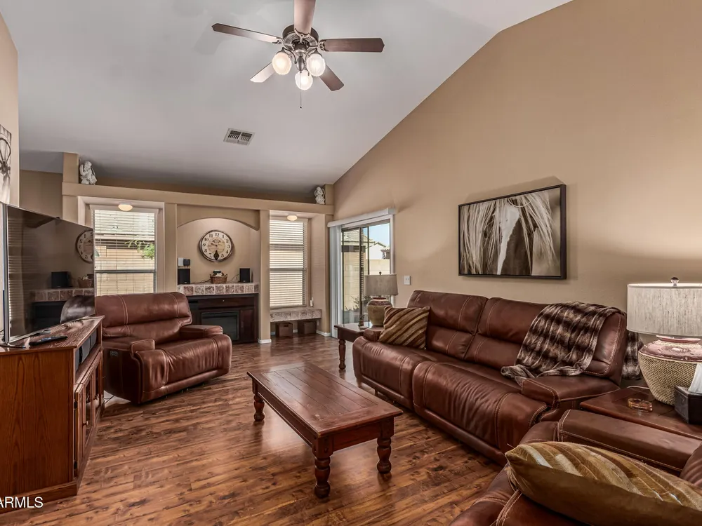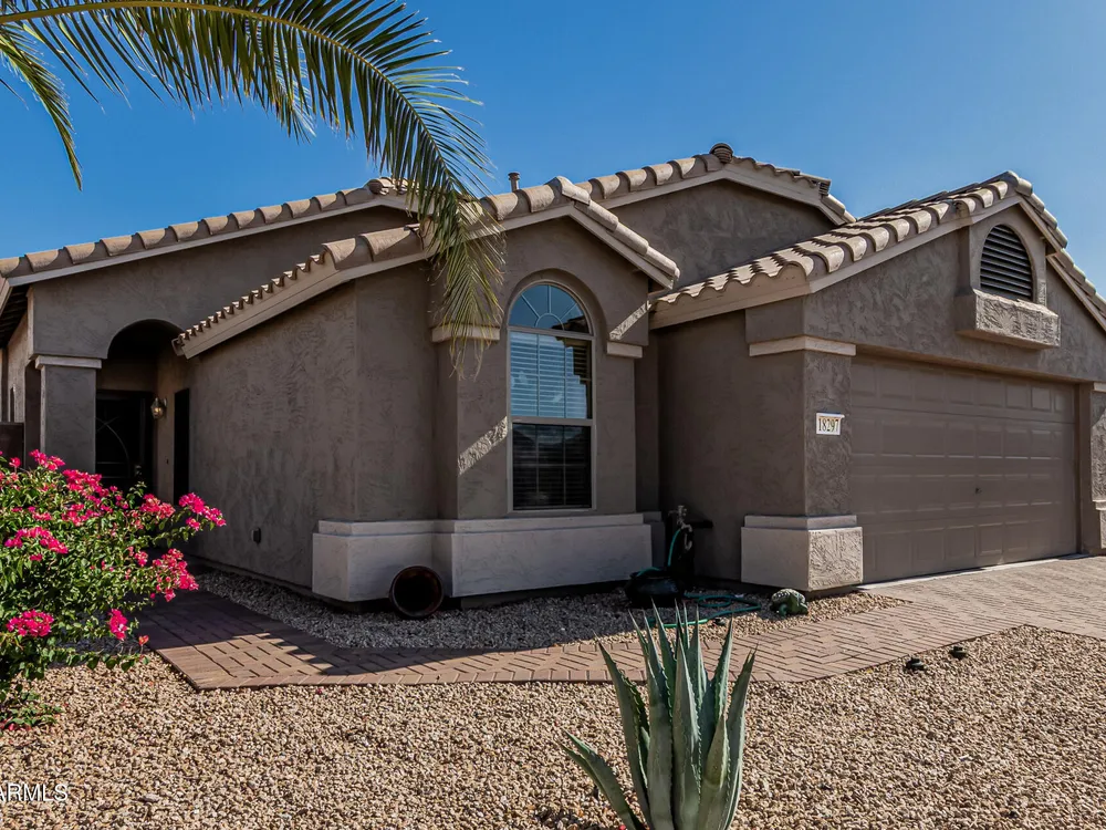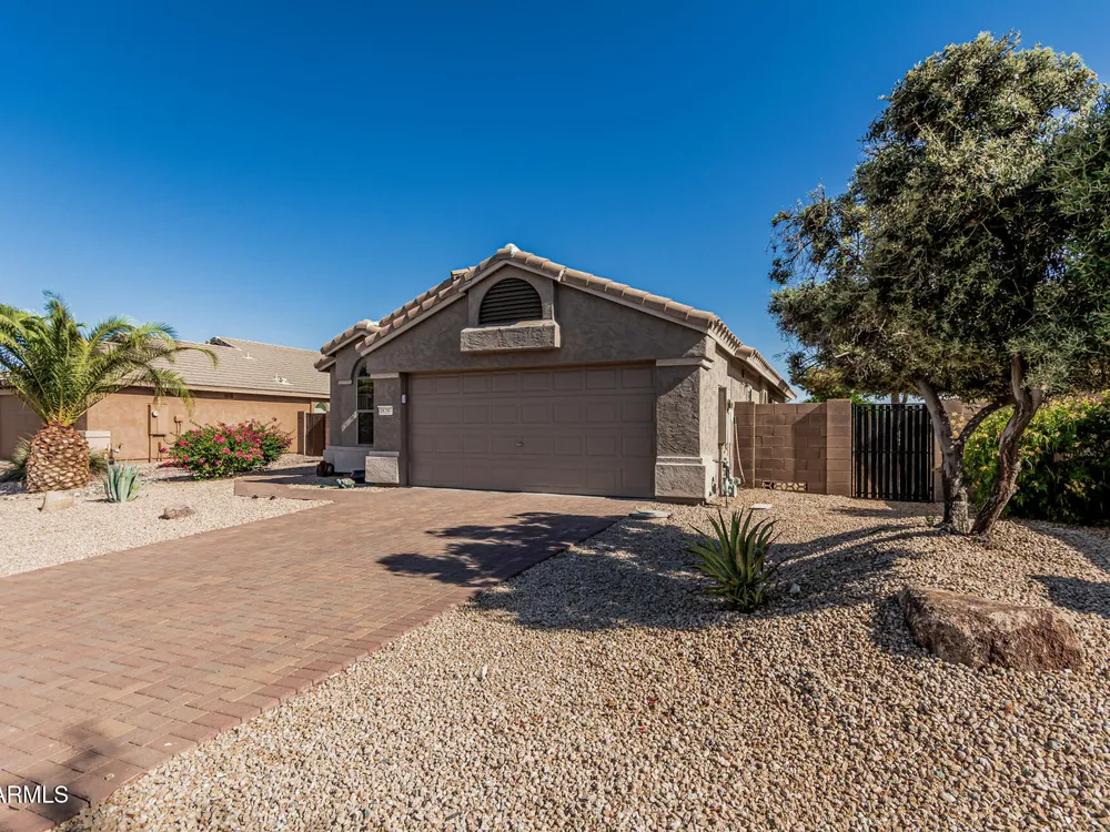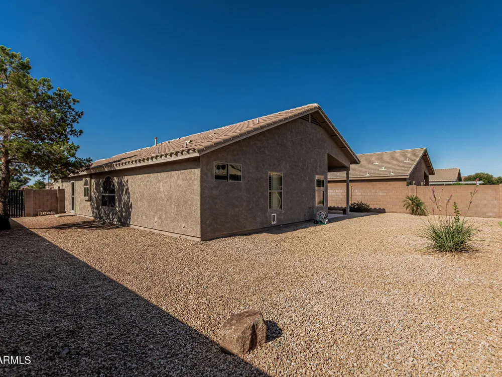 Home, sweet home! This gorgeous 2 bed, 2 bath property in Arizona Traditions is now for sale! Featuring great curb appeal, a low-care landscape, 2 car garage, and paver driveway. Inside you will find spacious dining & living areas w/vaulted ceilings, a warm fireplace, plantation shutters, and custom palette throughout. The kitchen is comprised of wood cabinetry w/crown moulding, ample counter space, built-in appliances, and a peninsula w/a breakfast bar. Double doors open up to the primary bedroom, showcasing a private ensuite w/dual sinks and a walk-in closet for all your belongings. Don't forget about the cozy den, ideal for an office or reading nook. Also including an expansive backyard w/a covered patio, this home is a true gem! Don't miss out!