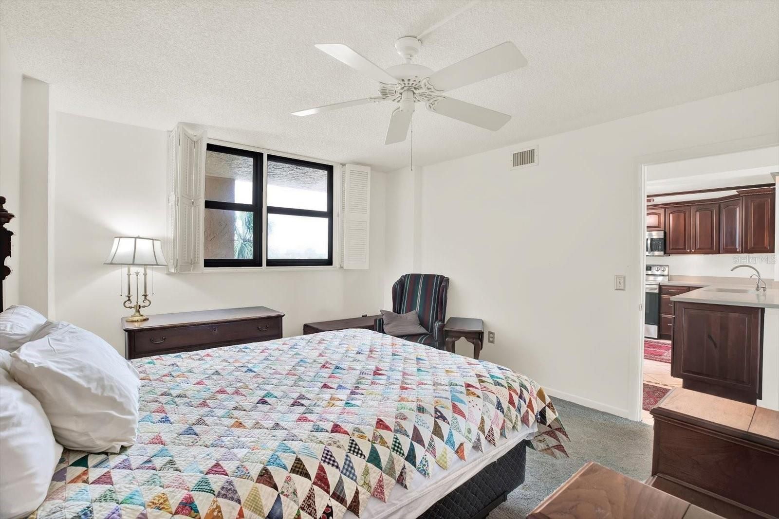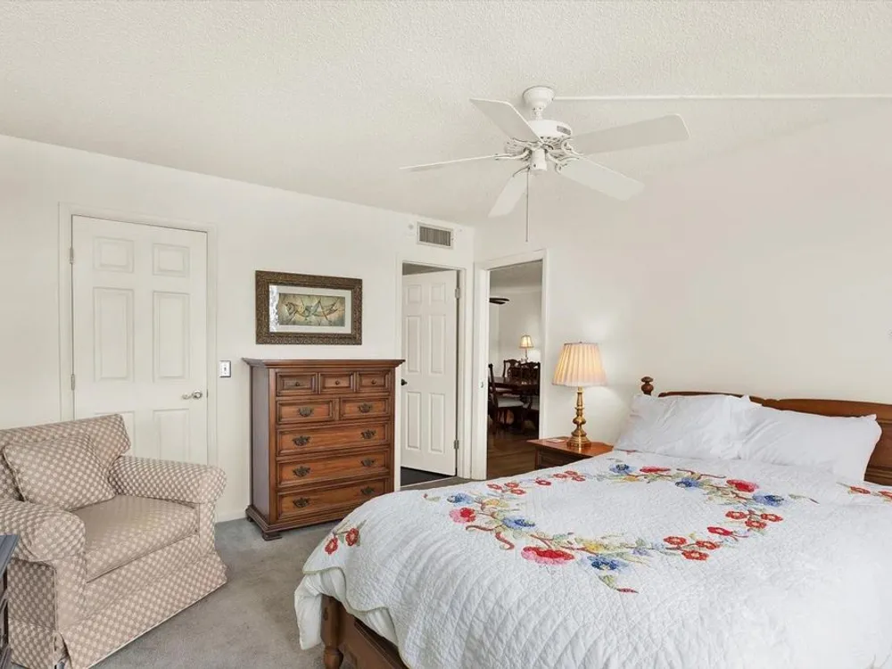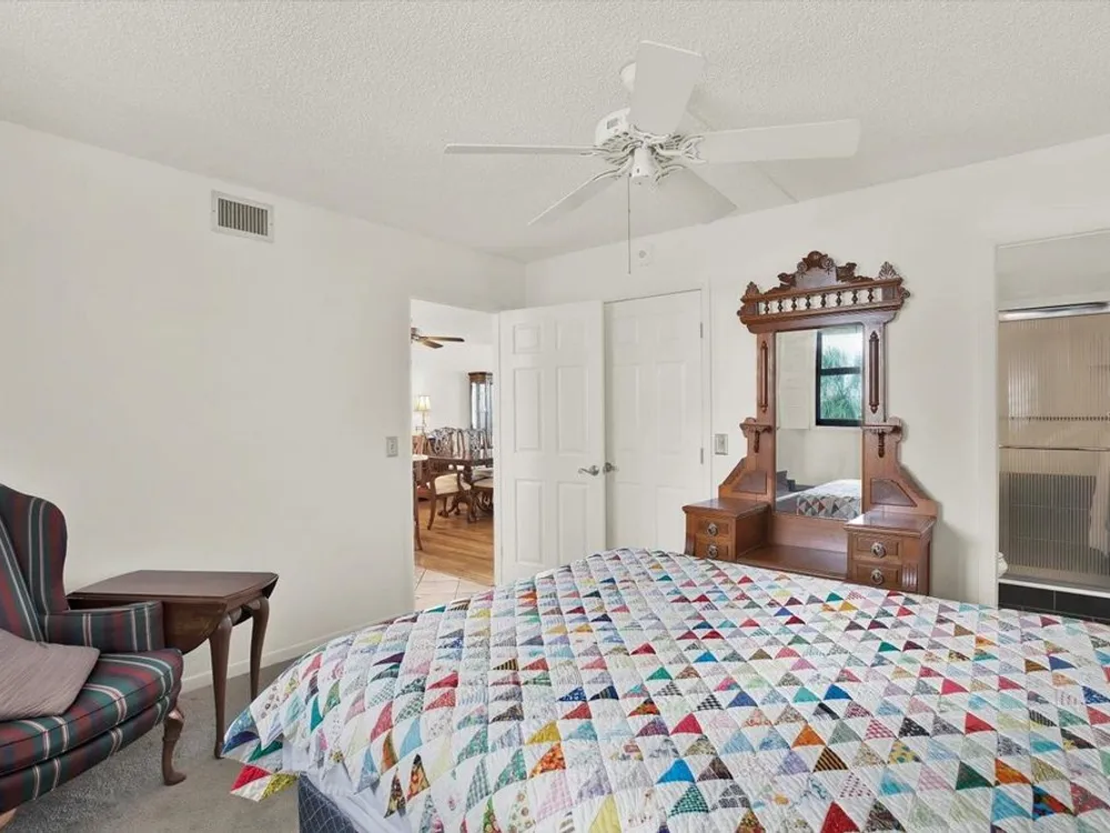- Ceiling Fan(s), Eat-in Kitchen, Living/Dining Room, Main Level Primary, Solid-Wood Cabinets, Split Bedrooms, Thermostat, Walk-In Closet(s)