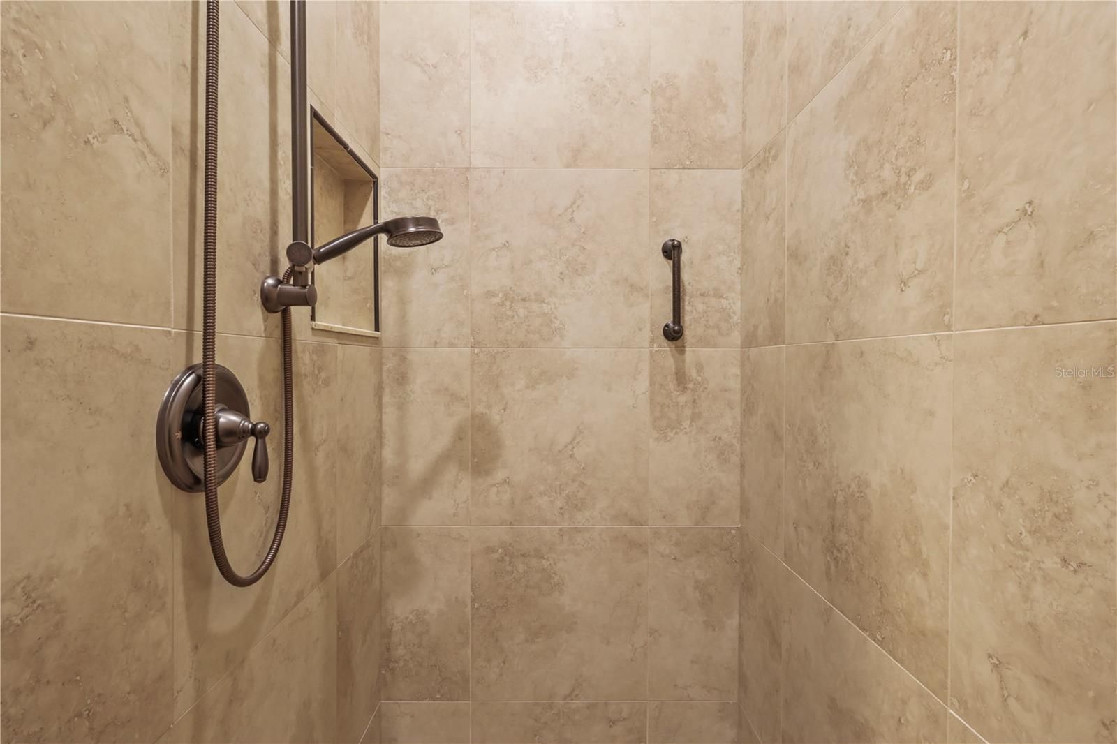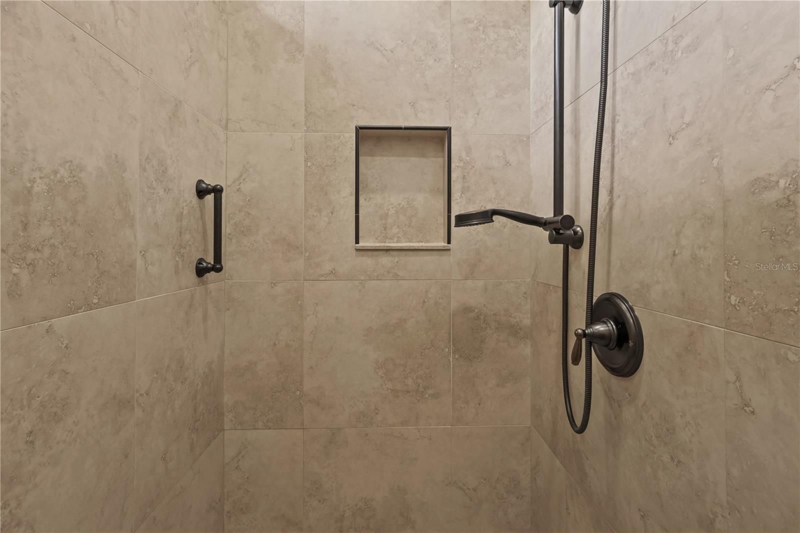 - Built-in Features, Ceiling Fan(s), Crown Molding, Eat-in Kitchen, High Ceilings, Living/Dining Room, Main Level Primary, Solid Surface Counters, Split Bedrooms, Stone Counters, Thermostat, Walk-In Closet(s), Window Treatments