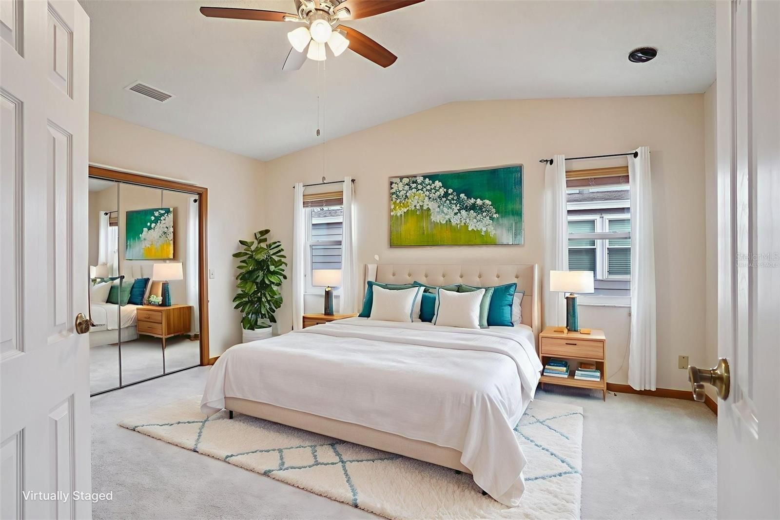 - Ceiling Fan(s), High Ceilings, Kitchen/Family Room Combo, Open Floorplan, Main Level Primary, Stone Counters, Thermostat, Vaulted Ceiling(s)