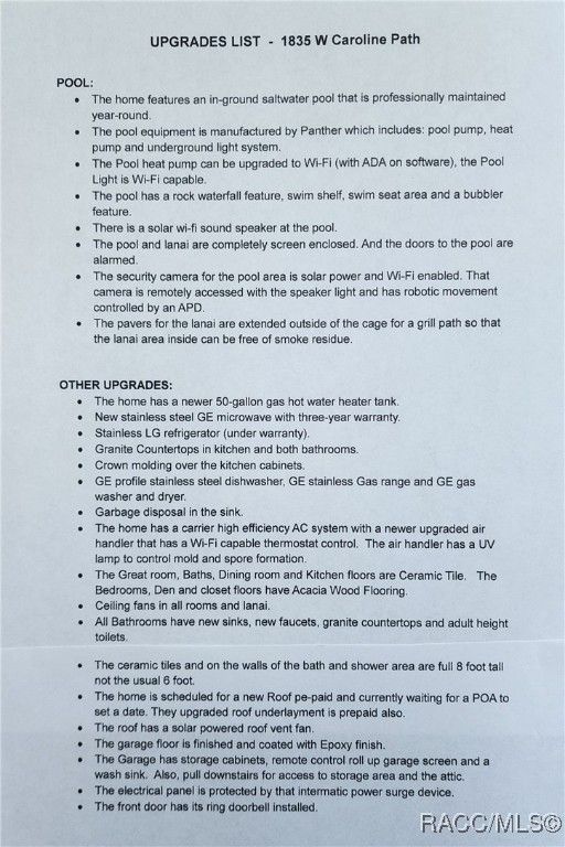 Lovely Carefree Pool-Home in Brentwood of Citrus Hills. This Home is move-in ready! 2 Bedrooms, Den, 2 Bath, 2 Car Garage & Pool. The Open Concept & the flow between the Great Room, Dining Room, and Lanai makes hosting effortless. The Glass Sliders lead from the Great Room out to the Lanai, & the spectacular saltwater & heated Pool w/rock waterfall & sound system for enjoyment all year-round, expanding the living space, great for grilling, entertaining and enjoying the Florida Sun. Master Suite with dual Closets & Walk-in shower. The Split Plan allows for a separate Guest Bedroom suite w/full Bath & plenty of room in the front of the home, the Den is used as an office, w/pullout couch for the option of a 3rd Bedroom. Inside Laundry Room w/Washer & Dryer, the Laundry Tub in the Garage. THIS HOME IS PRICED TO SELL! Upgrades include Tile & Acacia Wood Floors throughout for easy maintenance, Wood Cabinets, Stainless Appliances & Granite Countertops, NEW 50-gallon Gas Hot Water heater 2022, NEW Pool 2021, High efficiency AC system w/upgraded air handler w/UV light to control mold and spore formation. Plus Wi-Fi capable thermostat control. The home is scheduled for a NEW Roof currently waiting for the POA to set a date (the Seller pre-paid to upgrade the roof underlayment), solar power & Wi-Fi Security Camera in the pool area, The Garage floor is coated w/Epoxy finish, w/lots of storage & remote control roll up Screen and so much more, see attached list of upgrades. This Home is situated in a quiet/most desired street. The Villa Maintenance fee includes Roof replacement, irrigation, landscaping & exterior home painting...so sit back and enjoy the maintenance free living that allows you to relax and enjoy the many amenities the Club has to offer. The membership includes access to all the amenities of Brentwood, Terra Vista and Citrus Hills including: a state-of-the-art Fitness Center, Day Spa, Pools (indoor & Outdoor), Golf, Tennis, Tiki-Bar, Dining in beautiful Citrus Hills and in Terra Vista and other Club Amenities in the works, all waiting for you! Come and start enjoying your resort-style living!