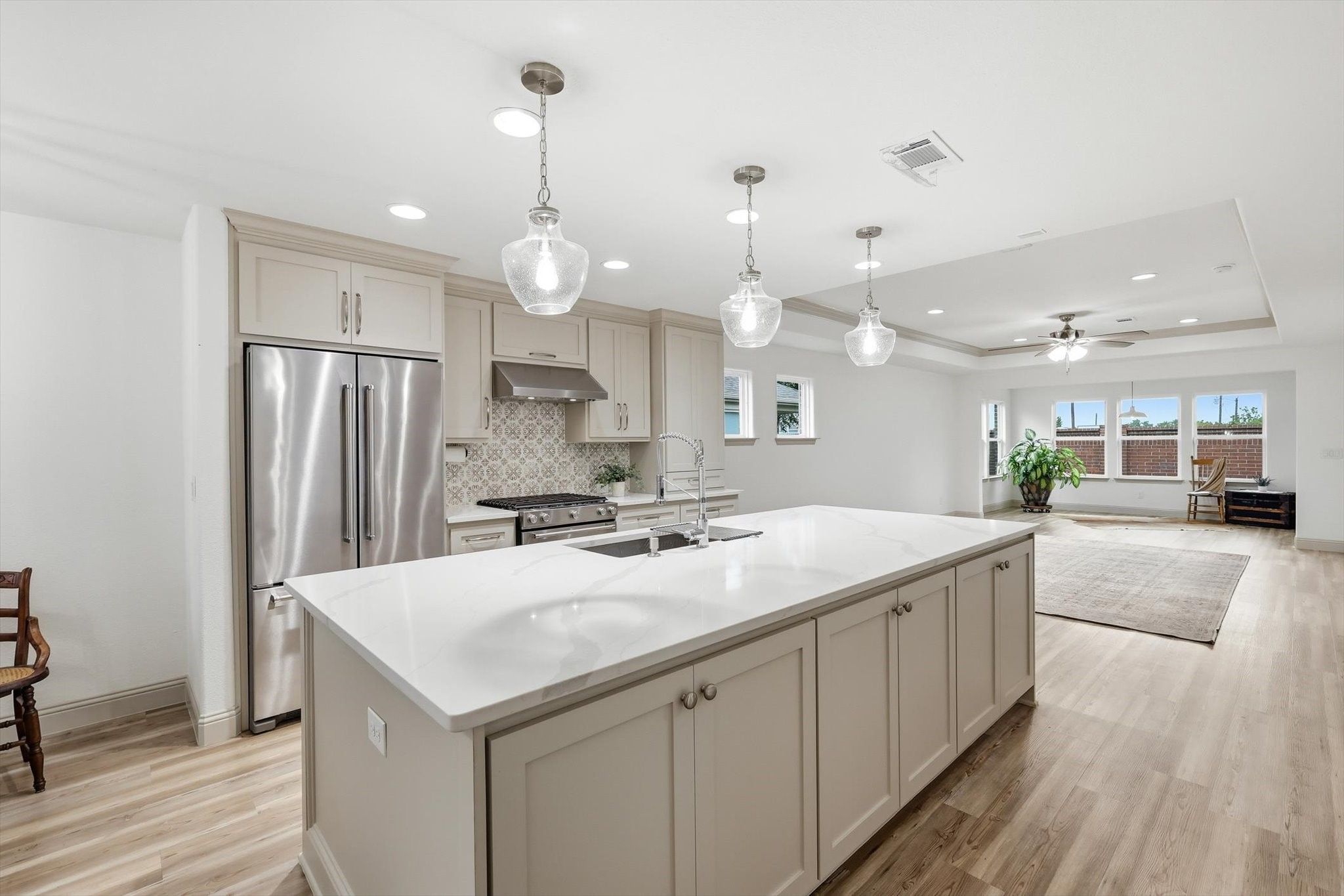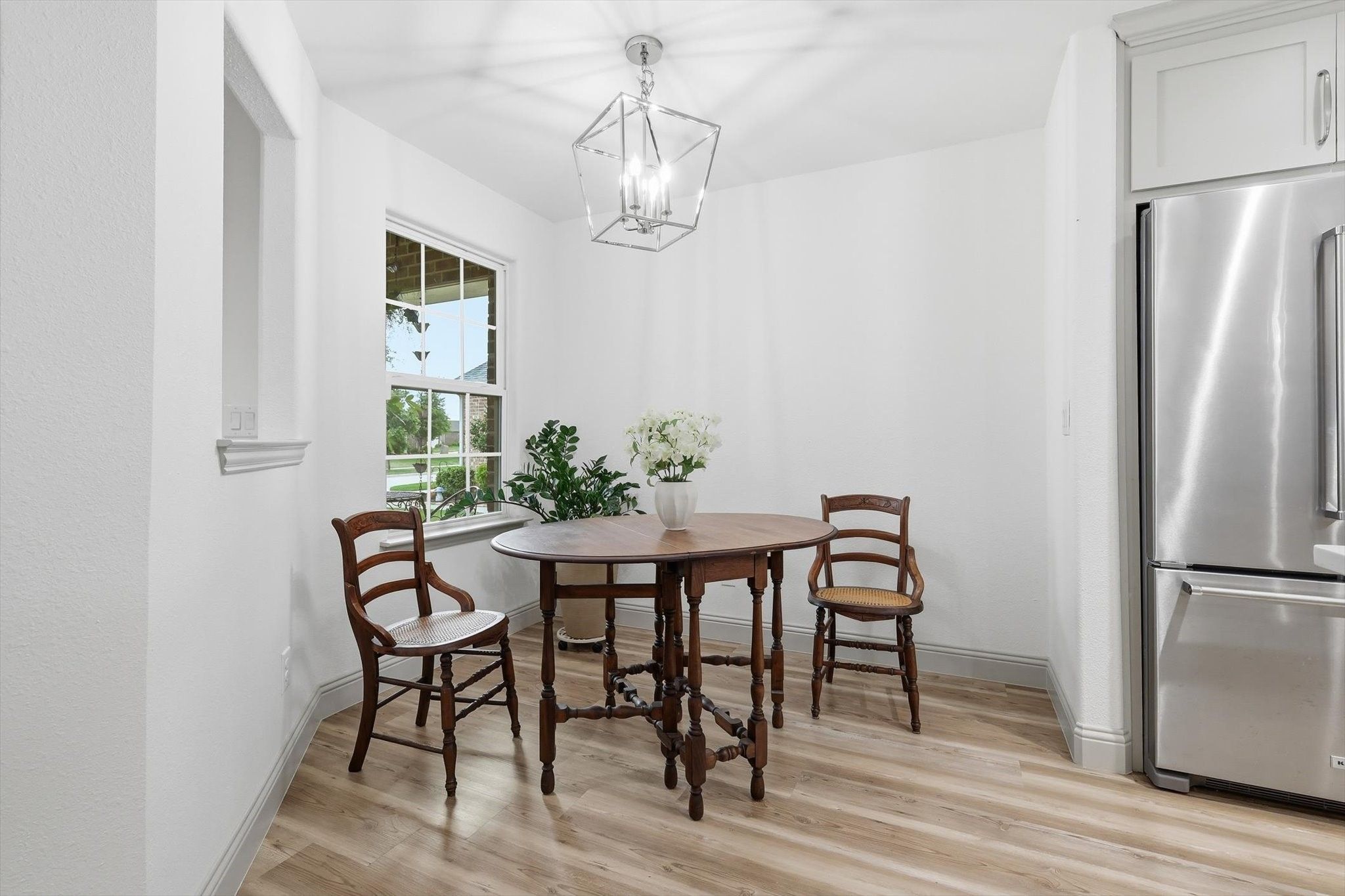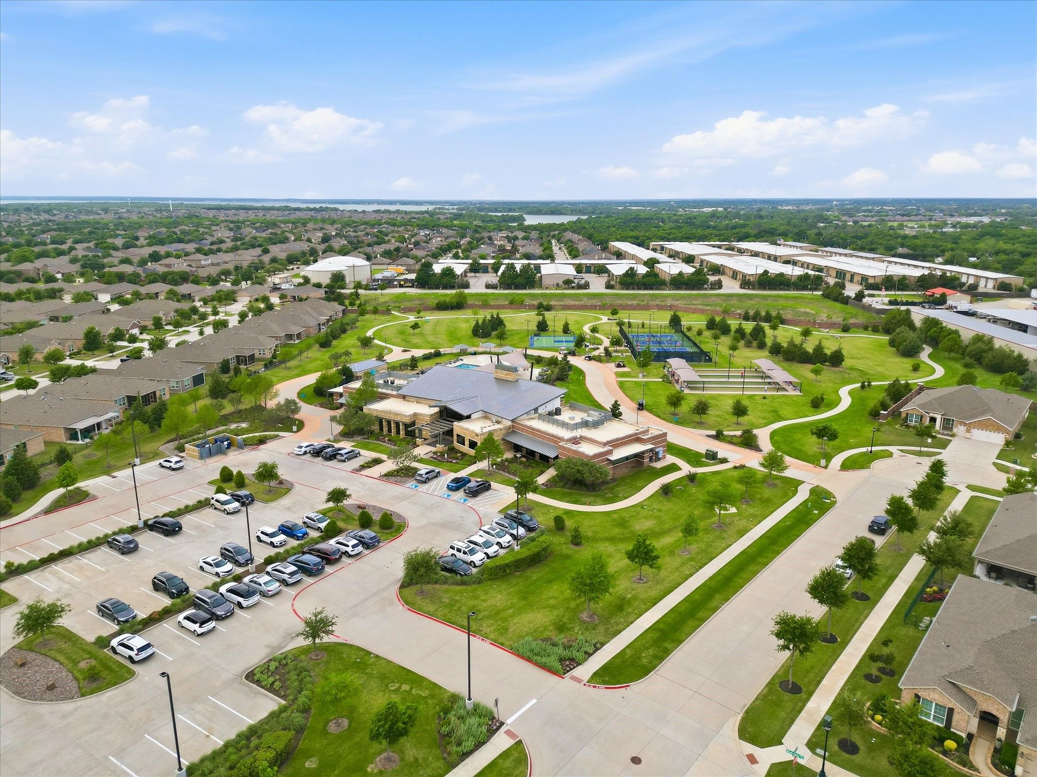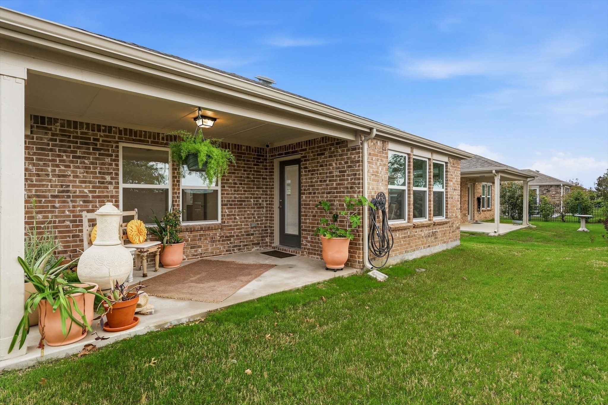 Welcome to your move-in ready sanctuary in Frisco Lakes by Del Webb — a vibrant 55+ active adult community of over 3,000 single-story homes on the eastern shores of Lake Lewisville. The stone and brick front porch with elegant arches invites you to slow down — perfect for morning coffee with French modern country charm. Inside, this upgraded 2-bed, 2-bath home with 2-car garage opens to an airy, open-concept layout with tray ceilings and crown molding. The kitchen features an oversized island with quartz counters, commercial pull-down faucet, and seeded glass pendants. KitchenAid appliances include a gas range with stainless hood, French door refrigerator, and third-rack dishwasher. A decorative tile backsplash ties into the custom beverage bar — a converted pantry with walnut shelving and brushed nickel pulls. Benjamin Moore Dove White walls and Revere Pewter cabinetry create a warm, timeless palette. The master suite features a spa-inspired bath with walk-in shower in marble-look tile and pebble stone floor with built-in niche. Dual vessel sinks on quartz vanity, crystal pulls, and open linen shelving complete the retreat. Crystal glass knobs grace every interior door. Step through the sunroom onto the sunset porch — your private retreat behind a brick privacy wall, perfect for quiet evenings. The sunroom fills with natural light and garden views. With select updated windows, roof, upgraded foam insulation, vinyl plank flooring, and updated light fixtures, this home offers peace of mind and beauty in equal measure. Frisco Lakes offers three amenity centers totaling 40,000+ square feet, resort-style pools, tennis, pickleball, bocce, scenic paths, public golf, on-site restaurant, and over 100 clubs. Lake Lewisville is steps away. Close to shopping and dining — your peaceful retreat awaits. This is not just a home. This is a fresh chapter — designed for the buyer who wants to feel like they’ve upgraded their life, not downsized it. Your sanctuary is ready.
