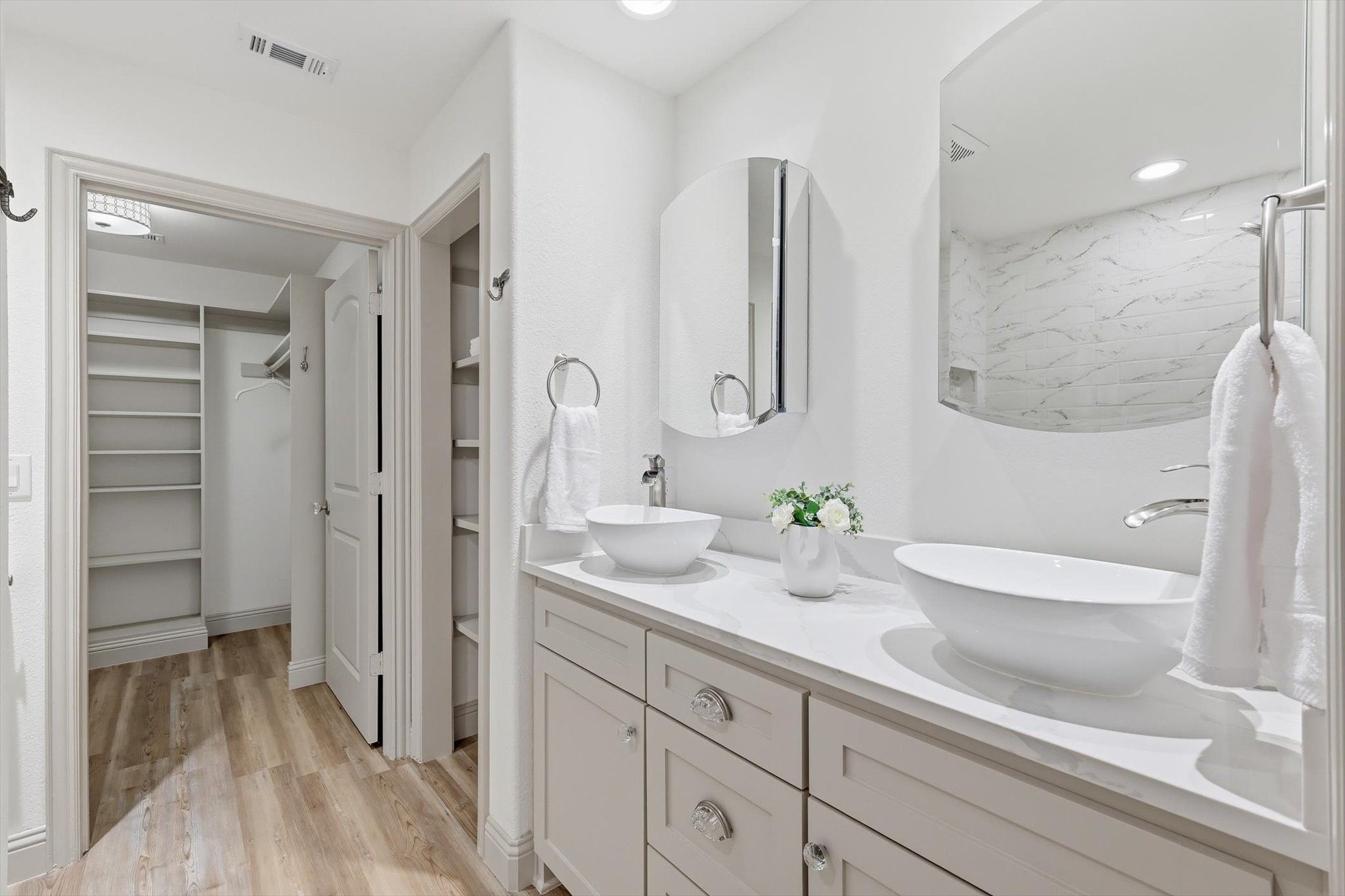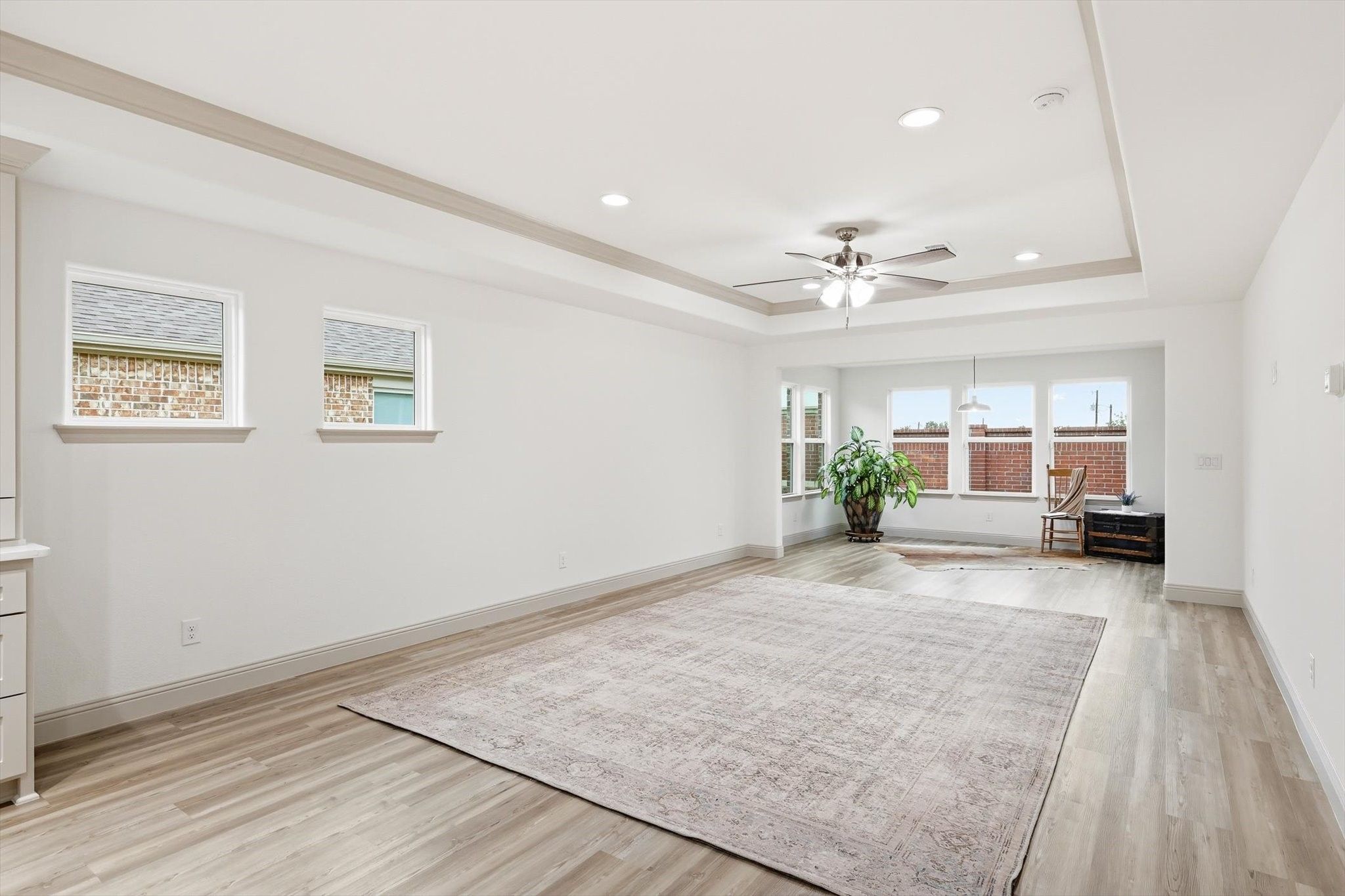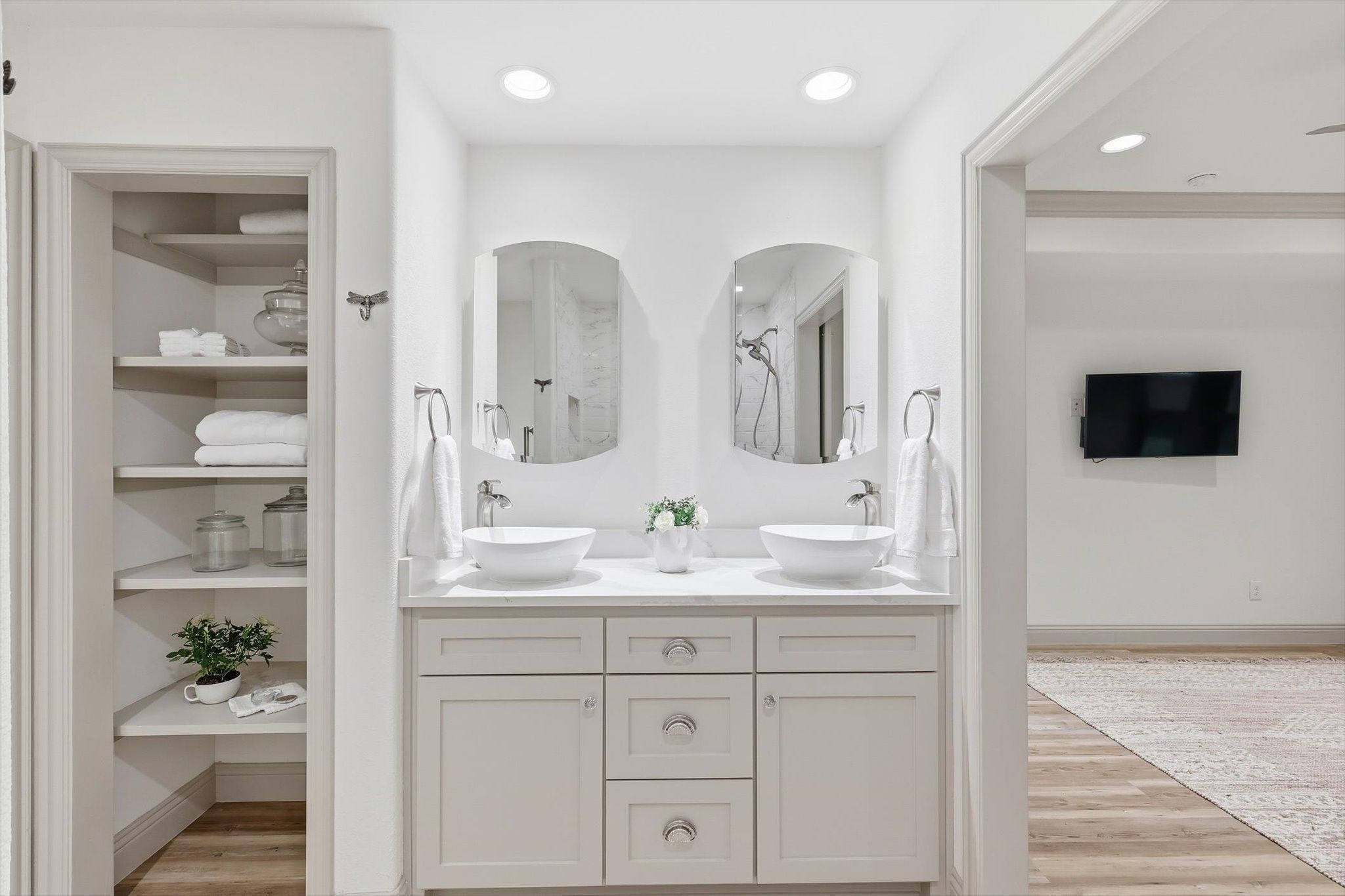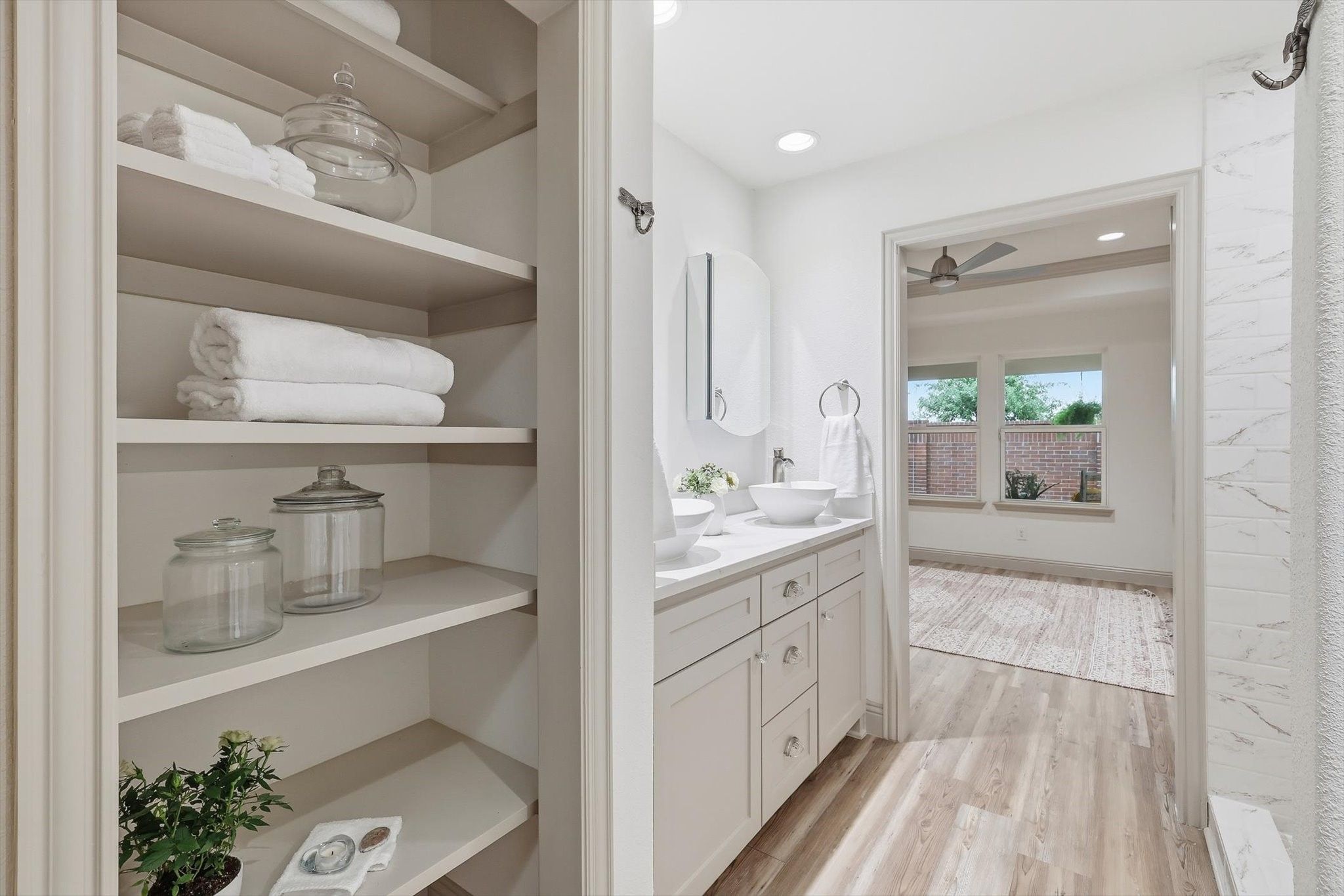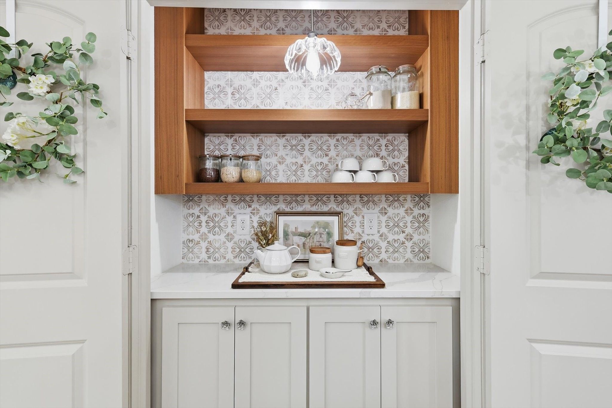 Welcome to your move-in ready sanctuary in Frisco Lakes by Del Webb — a vibrant 55+ active adult community of over 3,000 single-story homes on the eastern shores of Lake Lewisville. The stone and brick front porch with elegant arches invites you to slow down — perfect for morning coffee with French modern country charm. Inside, this upgraded 2-bed, 2-bath home with 2-car garage opens to an airy, open-concept layout with tray ceilings and crown molding. The kitchen features an oversized island with quartz counters, commercial pull-down faucet, and seeded glass pendants. KitchenAid appliances include a gas range with stainless hood, French door refrigerator, and third-rack dishwasher. A decorative tile backsplash ties into the custom beverage bar — a converted pantry with walnut shelving and brushed nickel pulls. Benjamin Moore Dove White walls and Revere Pewter cabinetry create a warm, timeless palette. The master suite features a spa-inspired bath with walk-in shower in marble-look tile and pebble stone floor with built-in niche. Dual vessel sinks on quartz vanity, crystal pulls, and open linen shelving complete the retreat. Crystal glass knobs grace every interior door. Step through the sunroom onto the sunset porch — your private retreat behind a brick privacy wall, perfect for quiet evenings. The sunroom fills with natural light and garden views. With select updated windows, roof, upgraded foam insulation, vinyl plank flooring, and updated light fixtures, this home offers peace of mind and beauty in equal measure. Frisco Lakes offers three amenity centers totaling 40,000+ square feet, resort-style pools, tennis, pickleball, bocce, scenic paths, public golf, on-site restaurant, and over 100 clubs. Lake Lewisville is steps away. Close to shopping and dining — your peaceful retreat awaits. This is not just a home. This is a fresh chapter — designed for the buyer who wants to feel like they’ve upgraded their life, not downsized it. Your sanctuary is ready.