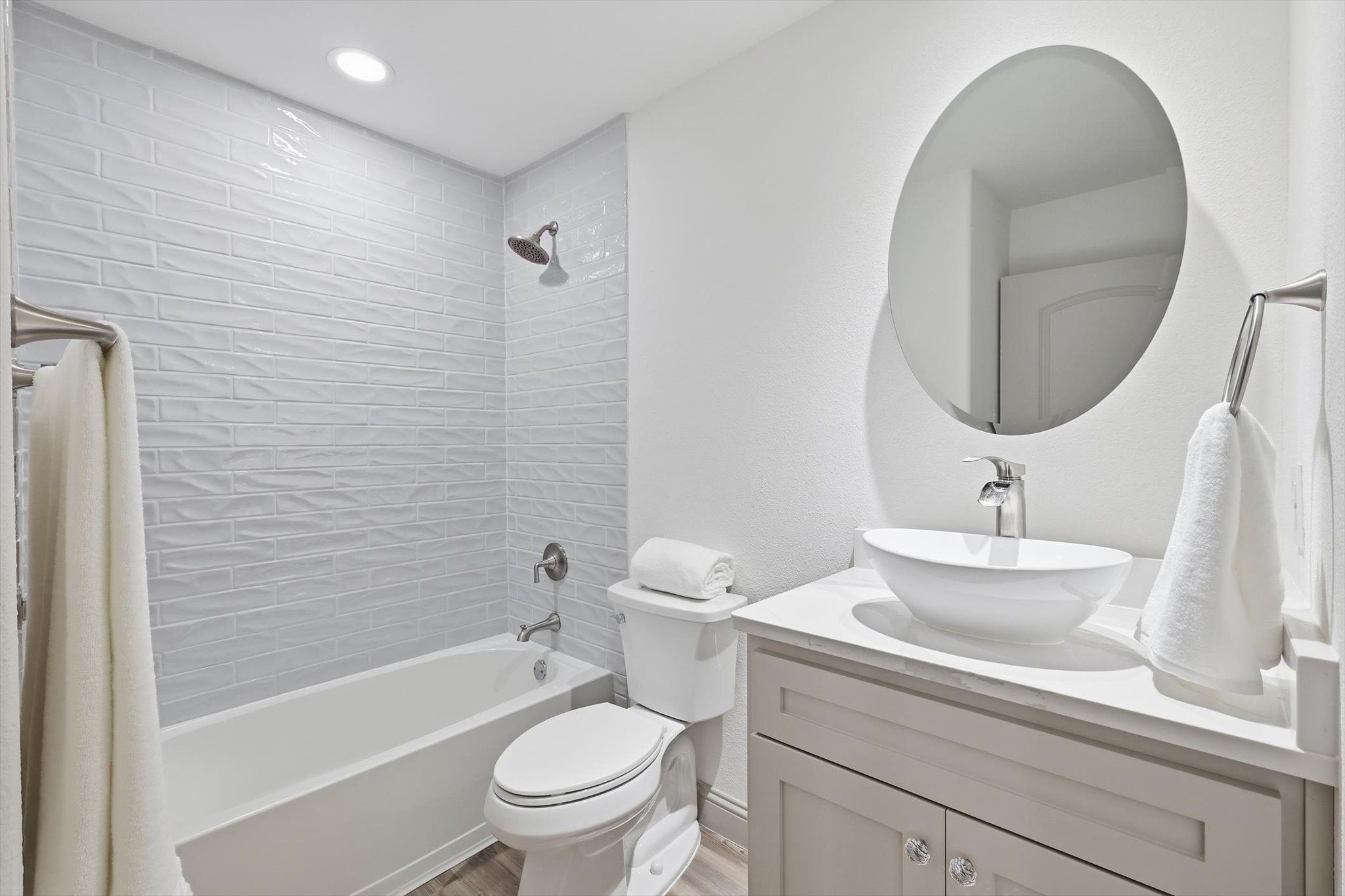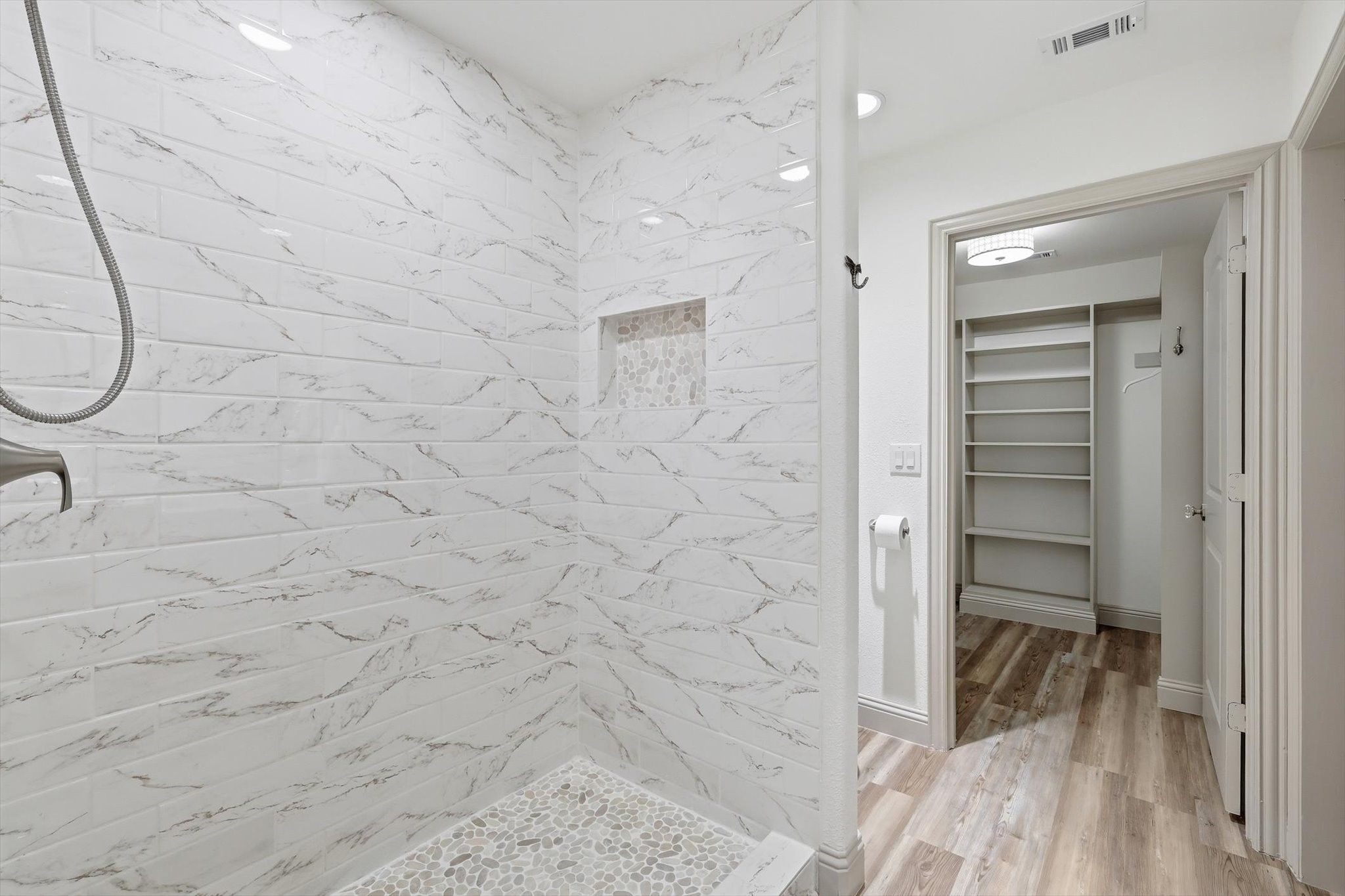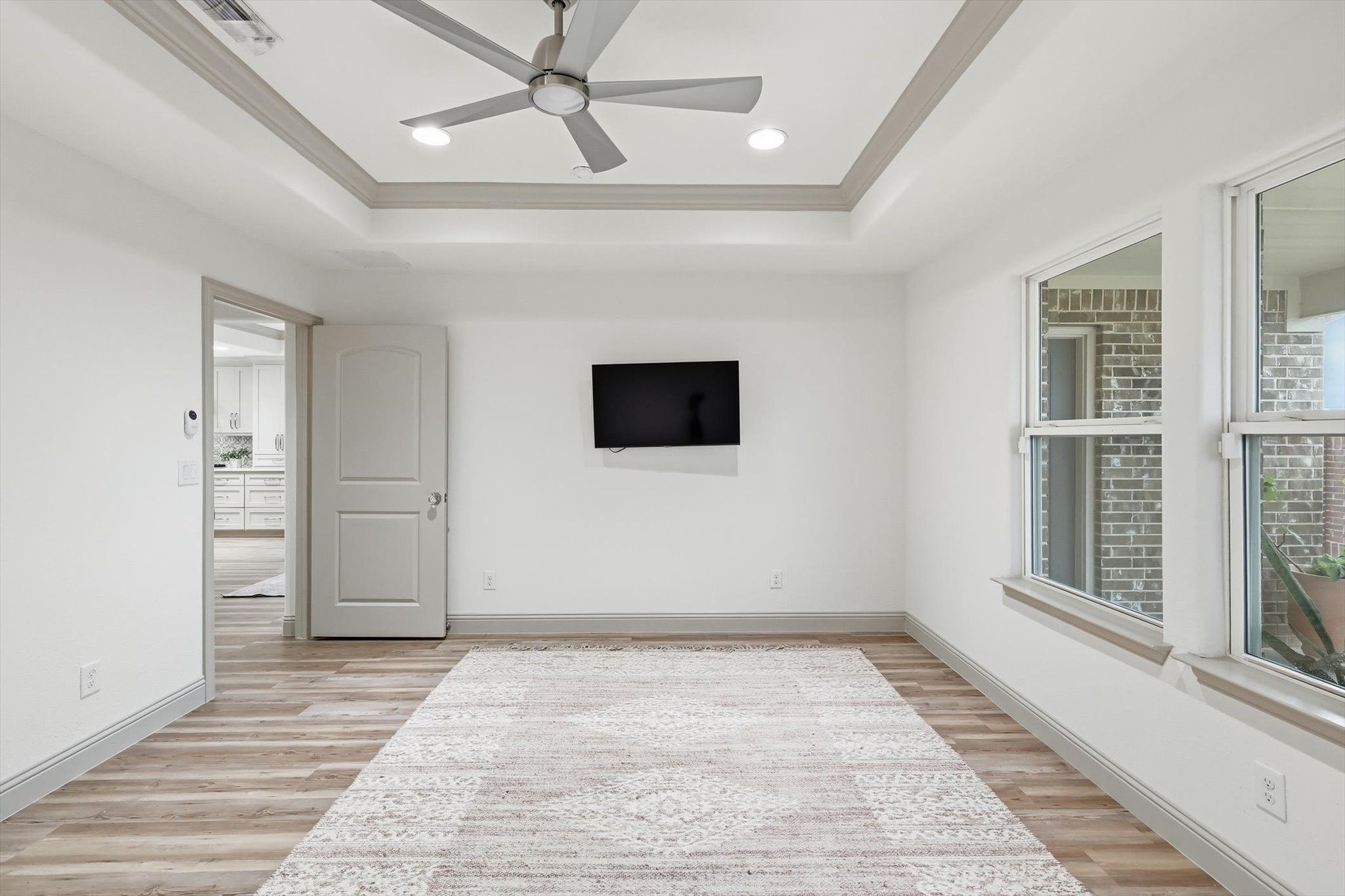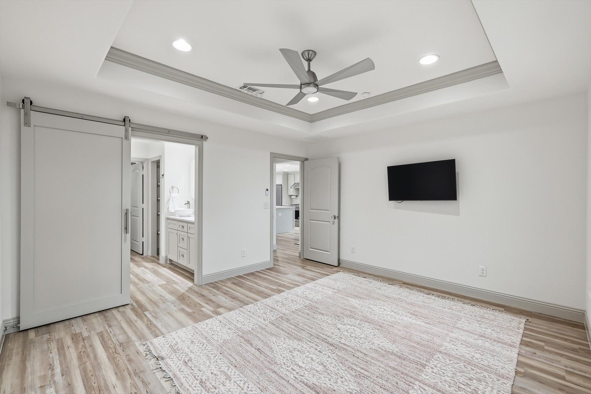 Welcome to your move-in ready sanctuary in Frisco Lakes by Del Webb — a vibrant 55+ active adult community of over 3,000 single-story homes on the eastern shores of Lake Lewisville. The stone and brick front porch with elegant arches invites you to slow down — perfect for morning coffee with French modern country charm. Inside, this upgraded 2-bed, 2-bath home with 2-car garage opens to an airy, open-concept layout with tray ceilings and crown molding. The kitchen features an oversized island with quartz counters, commercial pull-down faucet, and seeded glass pendants. KitchenAid appliances include a gas range with stainless hood, French door refrigerator, and third-rack dishwasher. A decorative tile backsplash ties into the custom beverage bar — a converted pantry with walnut shelving and brushed nickel pulls. Benjamin Moore Dove White walls and Revere Pewter cabinetry create a warm, timeless palette. The master suite features a spa-inspired bath with walk-in shower in marble-look tile and pebble stone floor with built-in niche. Dual vessel sinks on quartz vanity, crystal pulls, and open linen shelving complete the retreat. Crystal glass knobs grace every interior door. Step through the sunroom onto the sunset porch — your private retreat behind a brick privacy wall, perfect for quiet evenings. The sunroom fills with natural light and garden views. With select updated windows, roof, upgraded foam insulation, vinyl plank flooring, and updated light fixtures, this home offers peace of mind and beauty in equal measure. Frisco Lakes offers three amenity centers totaling 40,000+ square feet, resort-style pools, tennis, pickleball, bocce, scenic paths, public golf, on-site restaurant, and over 100 clubs. Lake Lewisville is steps away. Close to shopping and dining — your peaceful retreat awaits. This is not just a home. This is a fresh chapter — designed for the buyer who wants to feel like they’ve upgraded their life, not downsized it. Your sanctuary is ready.