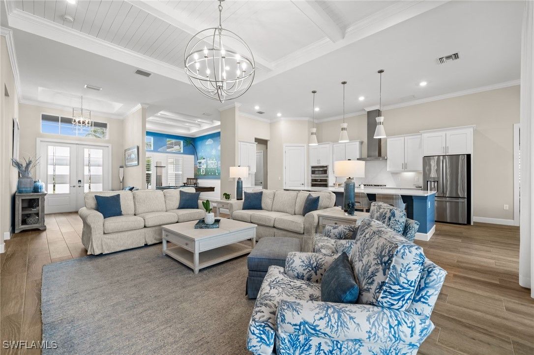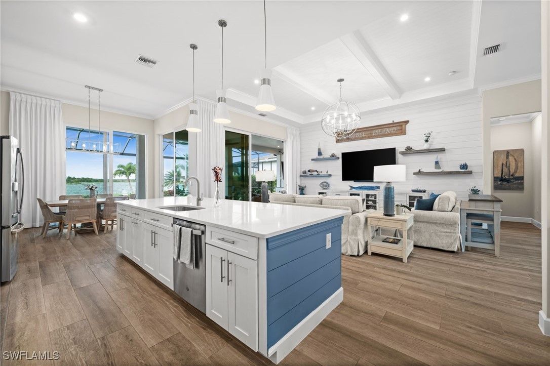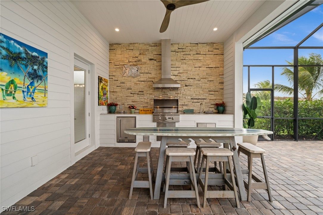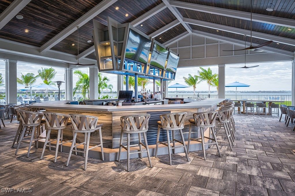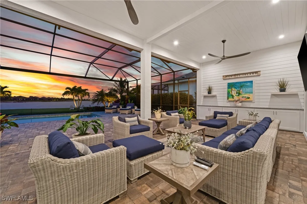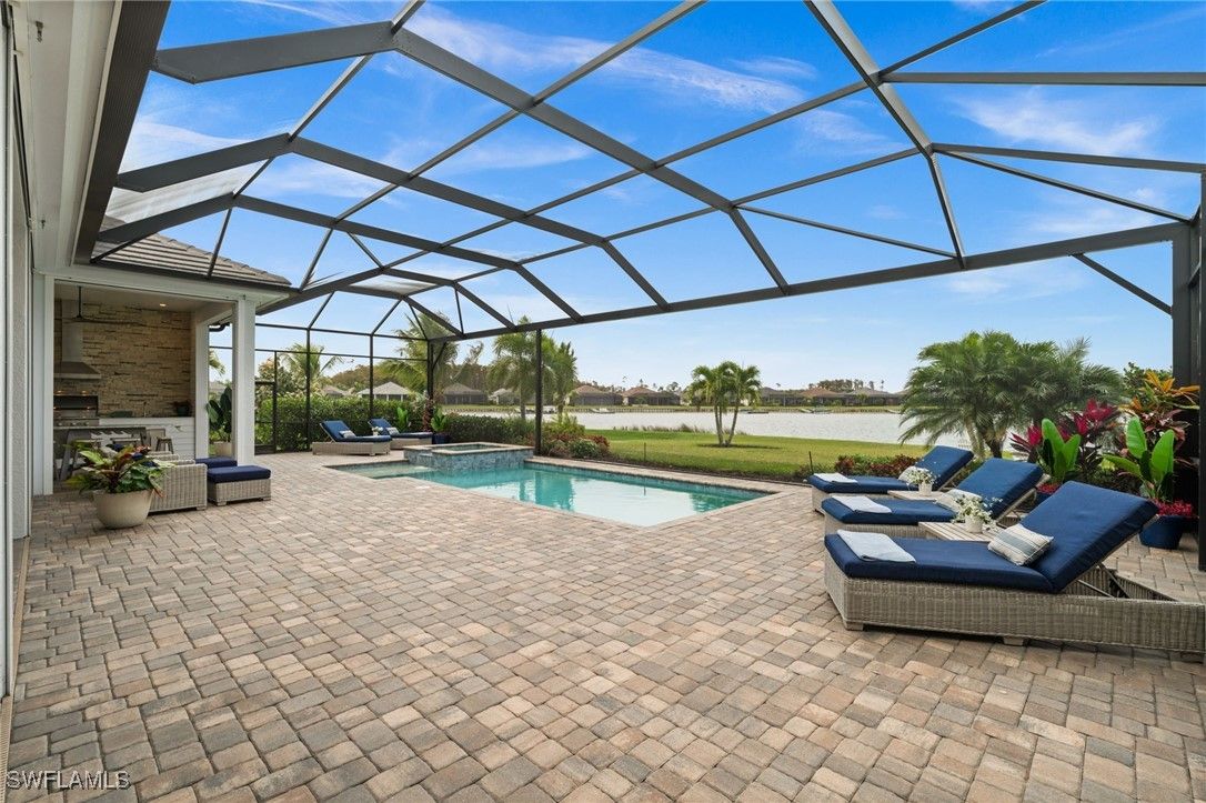 Located in the Luxury Waterfront community of WildBlue, this home has a perfect blend of coastal living, luxury comfort, and impressive energy efficiency! Designed to embrace its stunning lakefront setting, it captures the relaxed, boatable lifestyle that draws so many to SW Florida. Offering over 2,900 sqft, 4 bedrooms, 3 full bathrooms with thoughtfully curated décor makes this home move-in ready! Custom detailed woodwork, soaring 12-ft ceilings, and expansive 10-ft impact-rated windows and door walls create a light-filled interior that beautifully frames the water. The open-concept design is complemented by plank tile flooring throughout and a Gourmet Kitchen featuring an oversized island, quartz countertops, stainless steel appliances, natural gas, crown molding, elegant window treatments, and upgraded fixtures. Solar electricity enhances energy efficiency with an estimated $3,000 in annual savings! The outdoor living area is an entertainer’s dream, featuring a sparkling pool and spa, picture-frame lanai screen, oversized pool deck, built-in outdoor kitchenette, and custom tongue-and-groove ceiling, upgraded fans and lighting, also equipped with Storm Smart hurricane protection for added peace of mind. A truly unique highlight is the custom mural by DeMott Design, an artistic tribute to Andy Rossi Lane on Captiva Island and the iconic Mucky Duck, adding a distinctive island-inspired ambiance to the billiards room! Additional highlights include a well-appointed garage with epoxy flooring, custom cabinetry, overhead storage racks, and a 22KW whole-house Generac generator. Enjoy world-class resort amenities including boating, tennis, pickleball, fitness, indoor/outdoor dining and spa within the prestigious, gated WildBlue Community. Short drives to shopping, dining, RSW airport, beaches and I-75 make this location ideal for full and part-time homeowners!