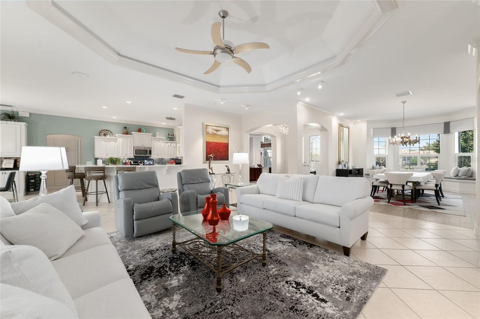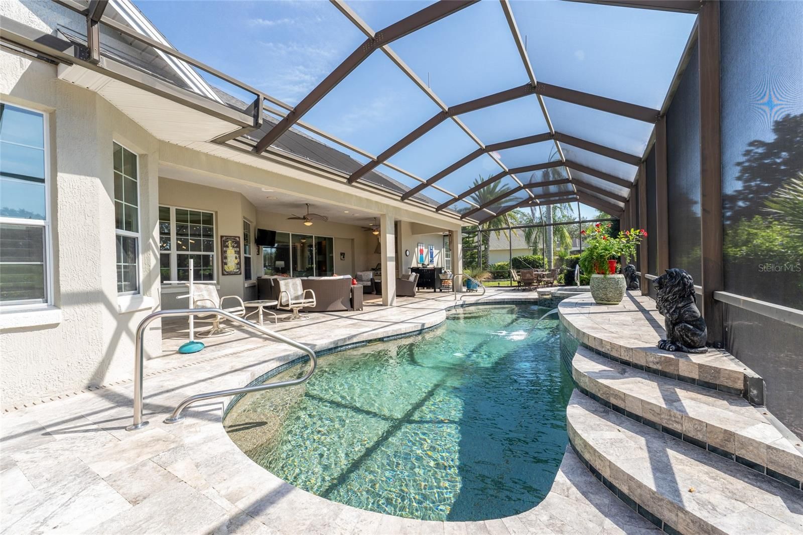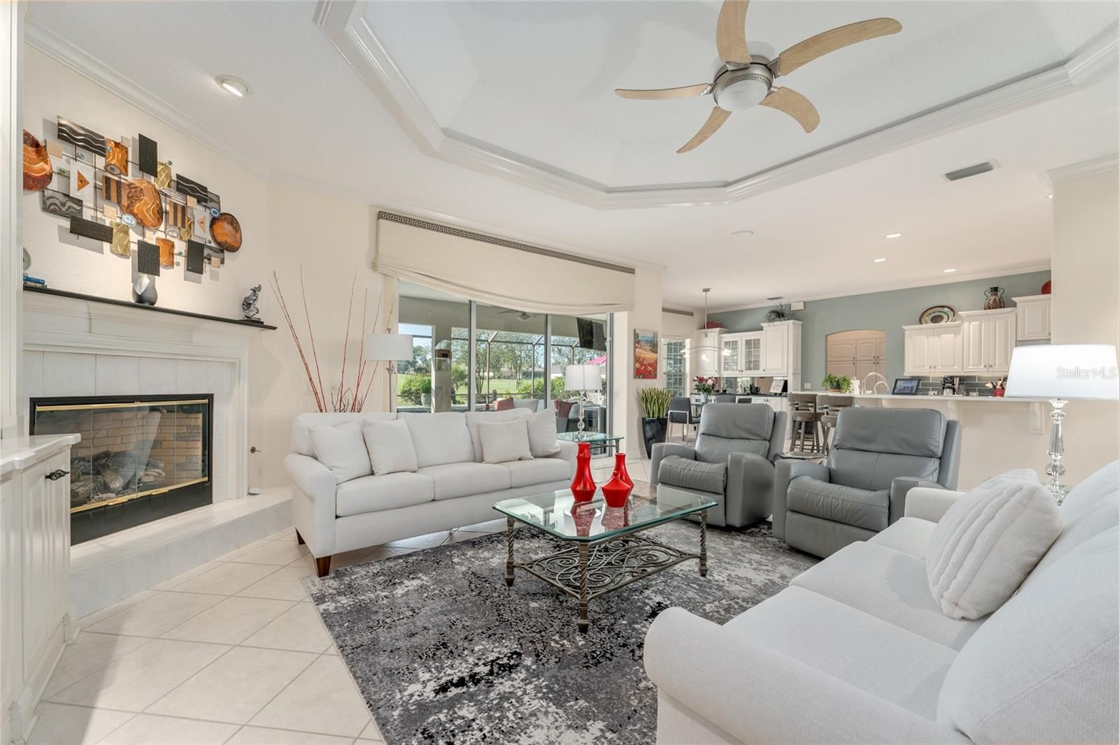 BOND PAID! Gorgeous Sanibel Premier Golf Front, Pool Home in Sunset Pointe! Welcome to this beautifully appointed 3-bedroom, 2-bath Sanibel Premier home nestled in the highly sought-after Village of Sunset Pointe. From the moment you arrive, you'll be greeted by the charming PARVERED driveway and walkway, the expanded side-loading 3-car garage, and lush, professionally maintained landscaping that create a warm and inviting first impression. Step inside to find an open welcoming layout featuring TILE flooring throughout (with cozy carpet in two bedrooms), a formal living room, a spacious family room, and a cozy GAS fireplace—perfect for both entertaining and relaxing.? The kitchen truly shines with QUARTZ countertops, a stylish TILE backsplash, a center island with pendant lighting, stainless steel appliances, pull-out drawers, a breakfast bar, an eat-in area that overlooks the outdoor space, and ample additional cabinets for all your storage needs. The split floor plan provides privacy for guests, with both guest bedrooms equipped with built-in closets. The nearby guest bathroom has been nicely updated with QUARTZ countertops, LED mirrors, and a walk-in TILED shower. Retreat to the luxurious primary suite featuring a tray ceiling, French doors opening to the lanai and pool, a generous walk-in closet, and a fully renovated en-suite bathroom showcasing a large walk-in shower, soaking tub, LED mirrors, a separate water closet, double sinks, and? QUARTZ countertops—adding a touch of modern elegance. The covered lanai opens up to a sparkling SALTWATER pool with a fountain, surrounded by new travertine tile and enclosed within a large birdcage, offering a peaceful and private outdoor haven. Additional features include: ROOF (2022), tankless water heater, MagicJack stairs, Versa Lift, and exterior paint (2025). This wonderful home truly combines elegance, comfort, and fantastic location—just minutes from Lake Sumter Landing, recreation centers, and championship golf courses. Don’t miss the chance to see it—schedule your private showing today!