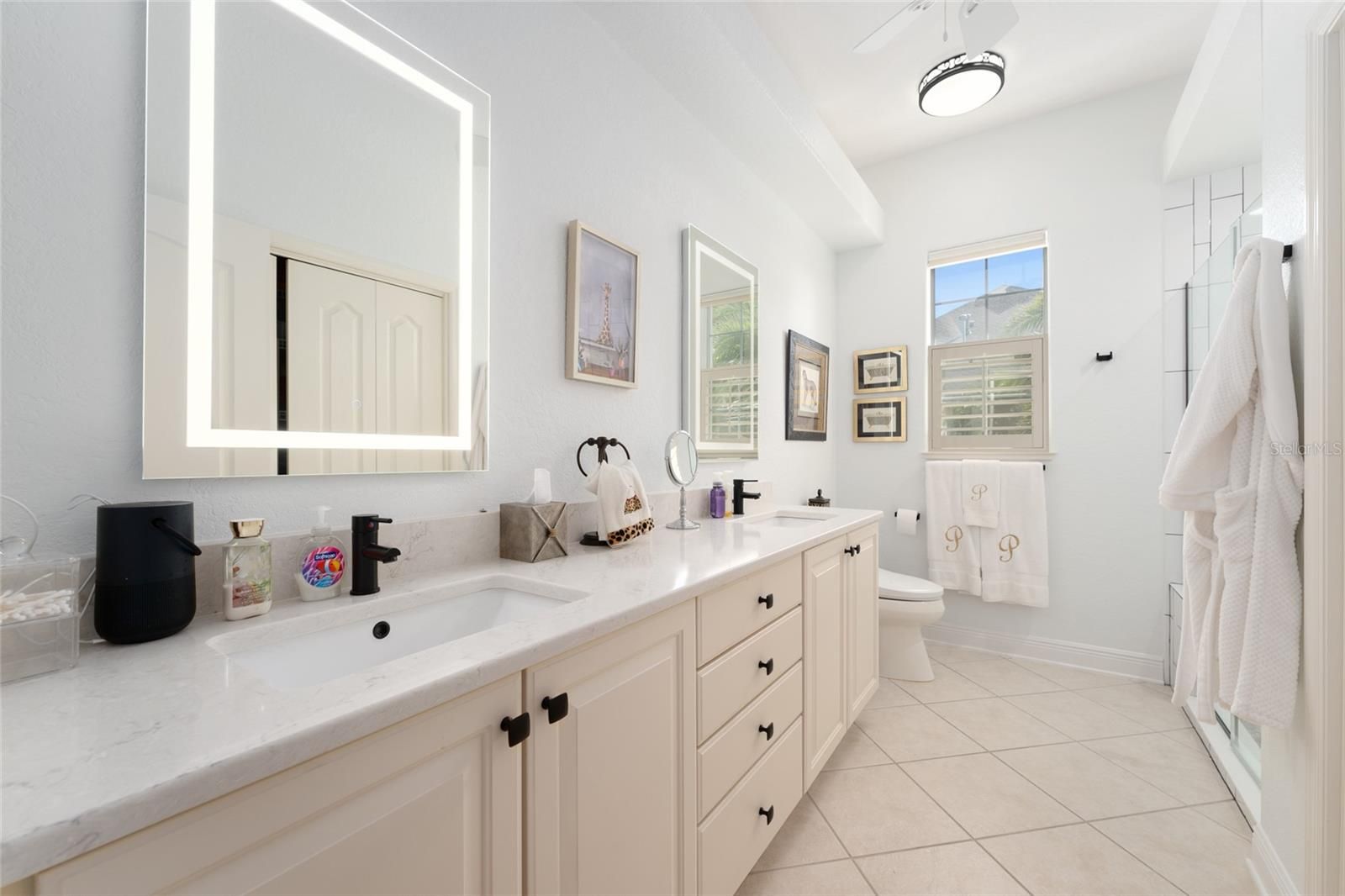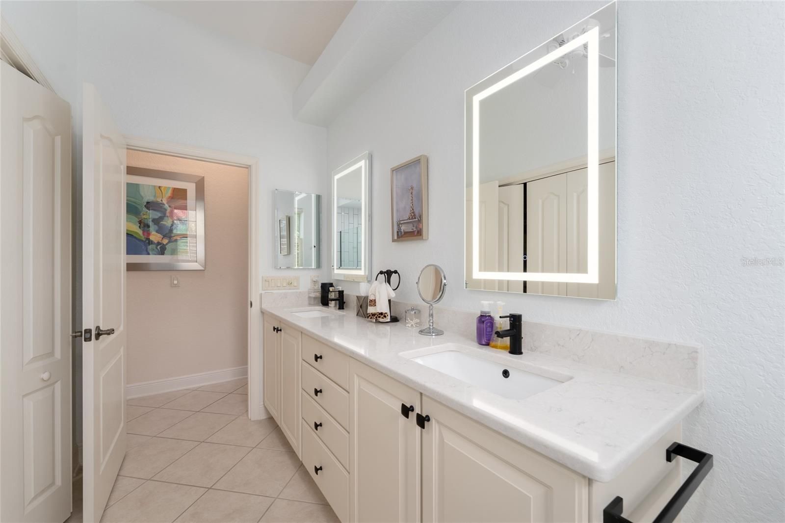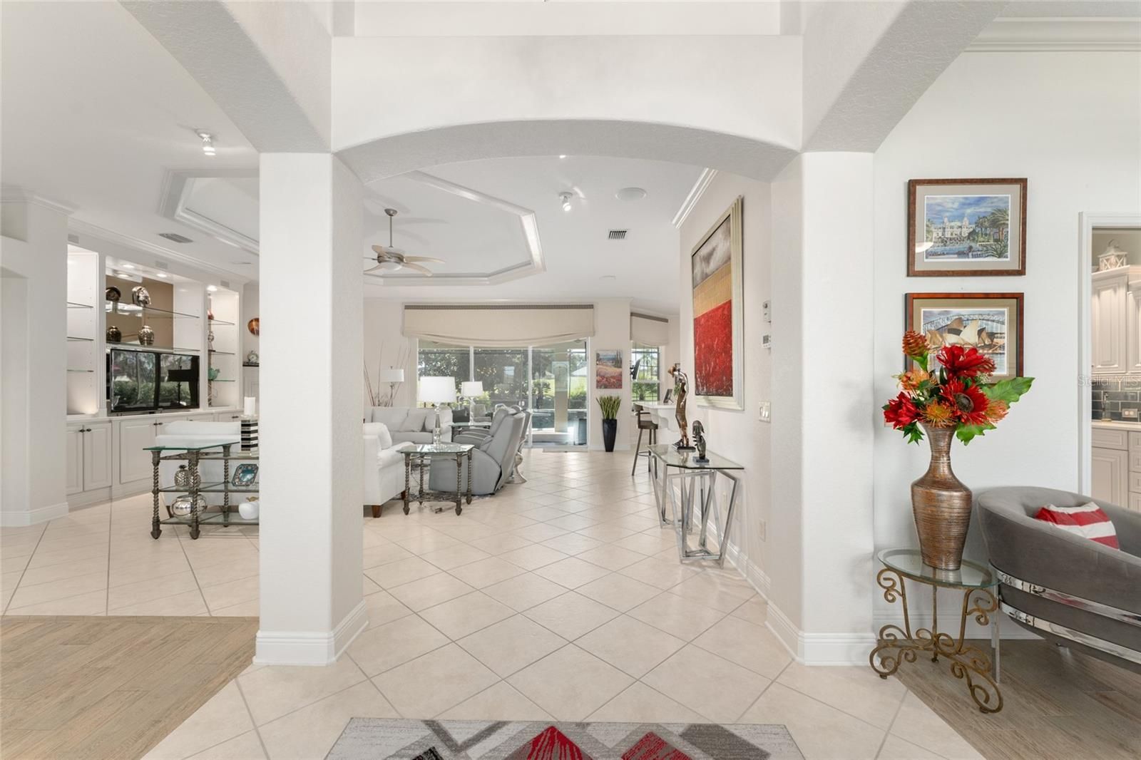 BOND PAID! Gorgeous Sanibel Premier Golf Front, Pool Home in Sunset Pointe! Welcome to this beautifully appointed 3-bedroom, 2-bath Sanibel Premier home nestled in the highly sought-after Village of Sunset Pointe. From the moment you arrive, you'll be greeted by the charming PARVERED driveway and walkway, the expanded side-loading 3-car garage, and lush, professionally maintained landscaping that create a warm and inviting first impression. Step inside to find an open welcoming layout featuring TILE flooring throughout (with cozy carpet in two bedrooms), a formal living room, a spacious family room, and a cozy GAS fireplace—perfect for both entertaining and relaxing.? The kitchen truly shines with QUARTZ countertops, a stylish TILE backsplash, a center island with pendant lighting, stainless steel appliances, pull-out drawers, a breakfast bar, an eat-in area that overlooks the outdoor space, and ample additional cabinets for all your storage needs. The split floor plan provides privacy for guests, with both guest bedrooms equipped with built-in closets. The nearby guest bathroom has been nicely updated with QUARTZ countertops, LED mirrors, and a walk-in TILED shower. Retreat to the luxurious primary suite featuring a tray ceiling, French doors opening to the lanai and pool, a generous walk-in closet, and a fully renovated en-suite bathroom showcasing a large walk-in shower, soaking tub, LED mirrors, a separate water closet, double sinks, and? QUARTZ countertops—adding a touch of modern elegance. The covered lanai opens up to a sparkling SALTWATER pool with a fountain, surrounded by new travertine tile and enclosed within a large birdcage, offering a peaceful and private outdoor haven. Additional features include: ROOF (2022), tankless water heater, MagicJack stairs, Versa Lift, and exterior paint (2025). This wonderful home truly combines elegance, comfort, and fantastic location—just minutes from Lake Sumter Landing, recreation centers, and championship golf courses. Don’t miss the chance to see it—schedule your private showing today!