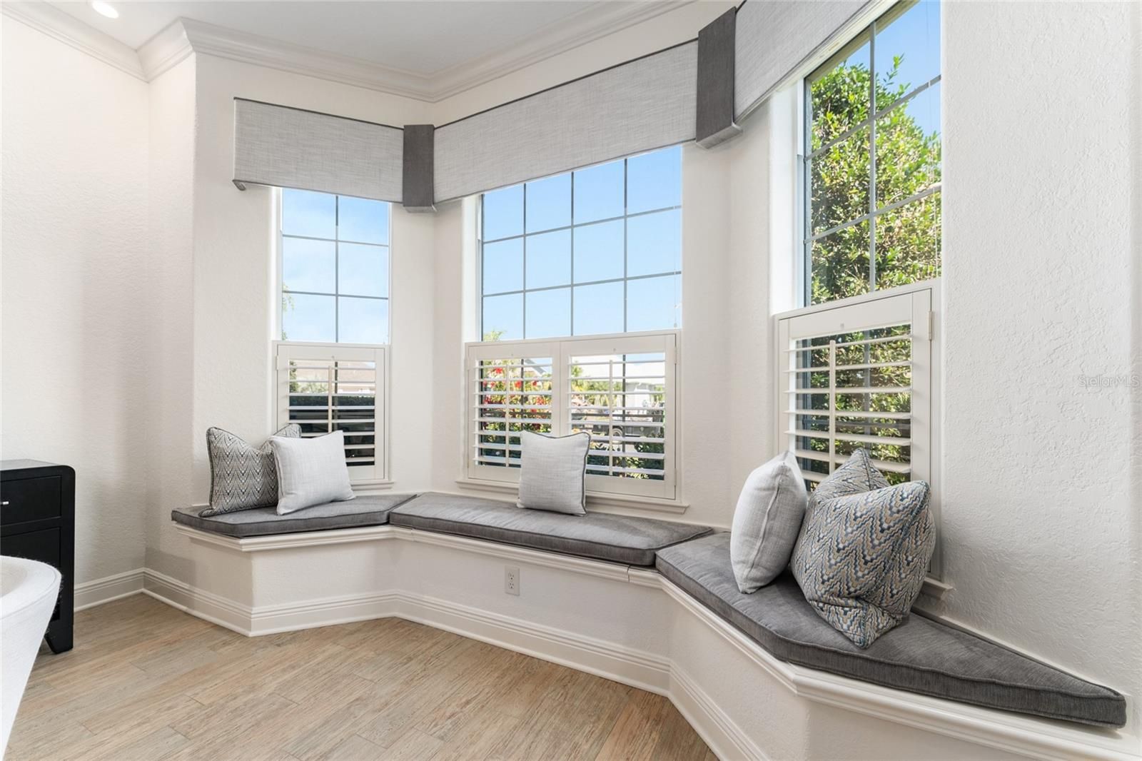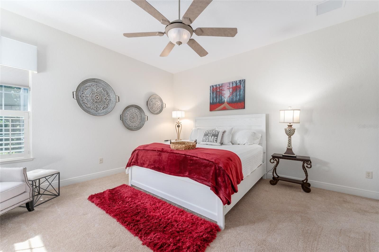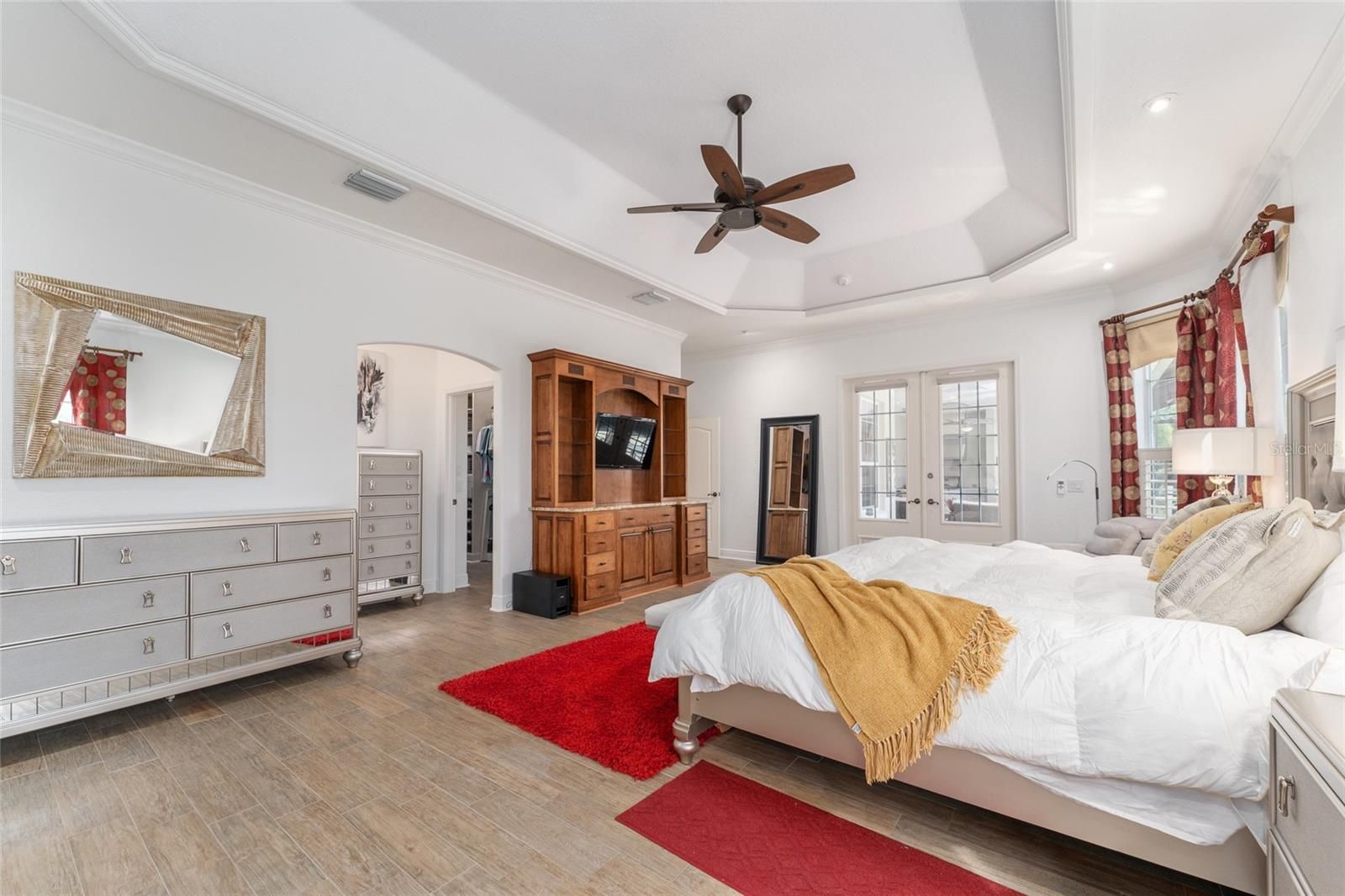 - Built-in Features, Ceiling Fan(s), Eat-in Kitchen, High Ceilings, Open Floorplan, Main Level Primary, Solid Surface Counters, Split Bedrooms, Tray Ceiling(s), Walk-In Closet(s)