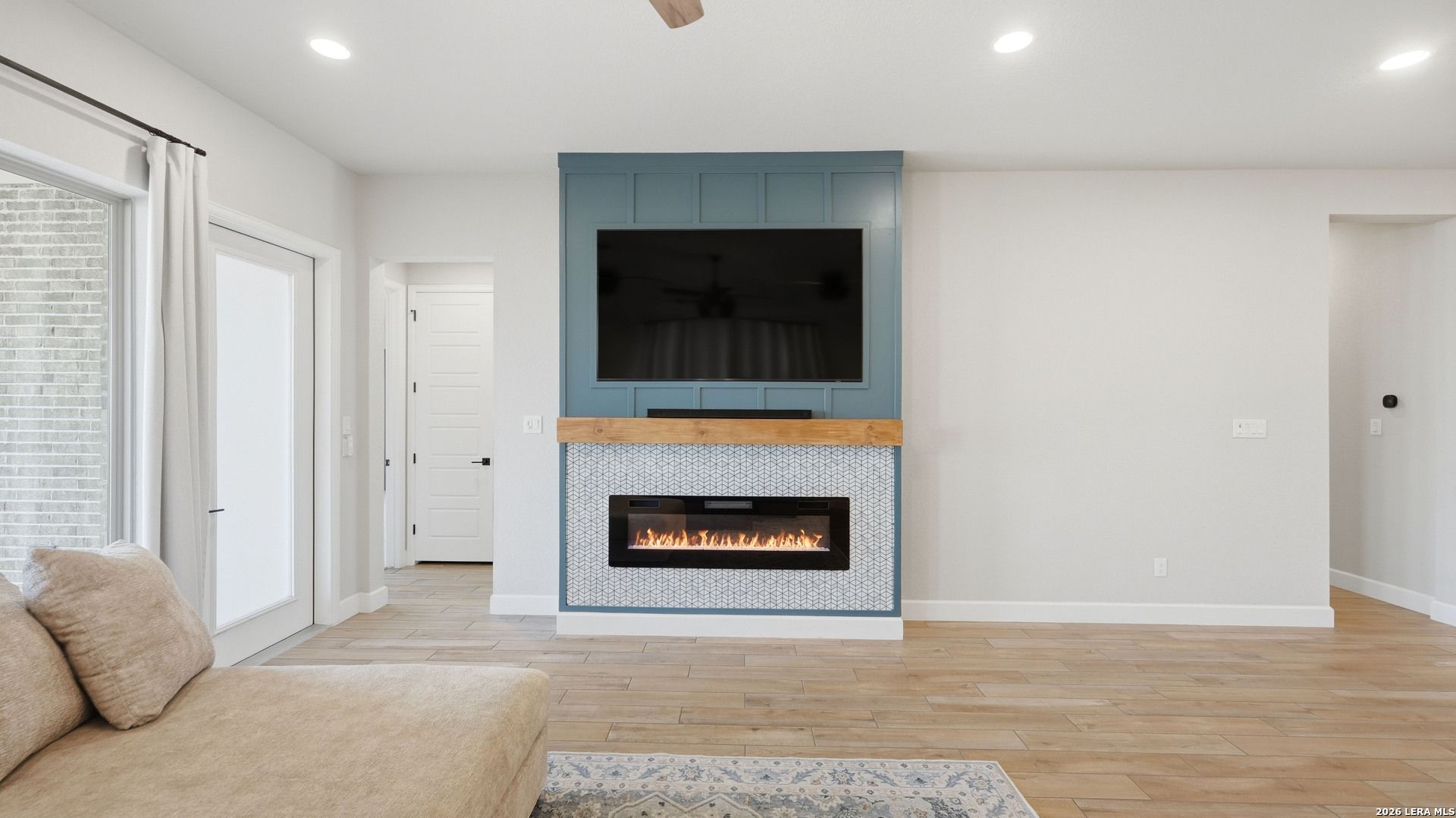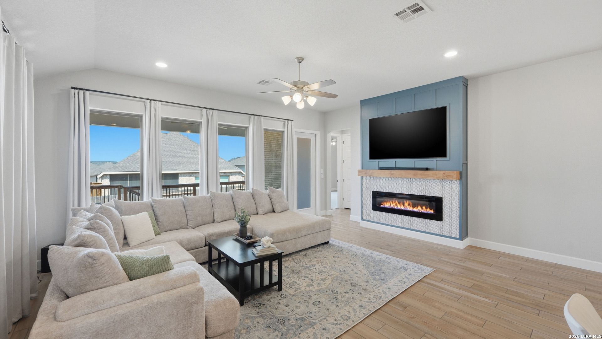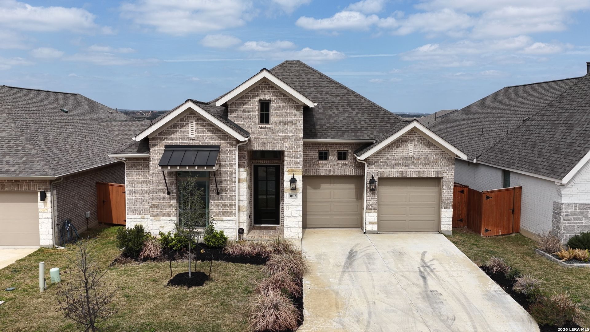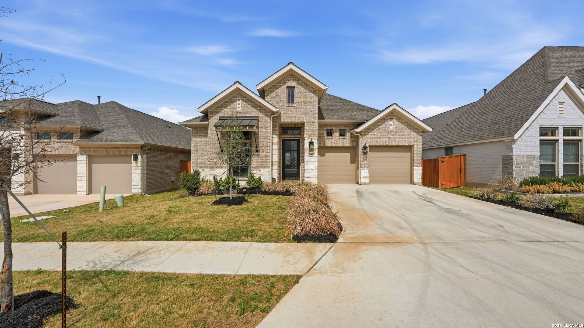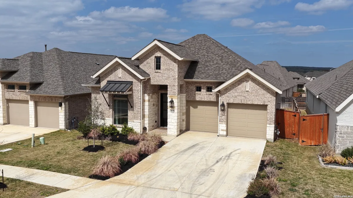 Luxury upgraded 3-bedroom, 2-bath home in the highly desirable Veramendi master-planned community in New Braunfels. Located on the hill, this thoughtfully designed home offers a semi-custom model home feel with premium finishes, smart home technology, and a modern open-concept layout. Interior features include 10' ceilings, 8' interior doors, quartz countertops throughout, and upgraded black hardware for a clean contemporary design. The spacious living room showcases a custom-built entertainment wall with storage, electric fireplace with heater, and built-in 75" Samsung TV with Bluetooth soundbar and subwoofer.The chef-style kitchen is designed for entertaining and everyday living with quartz countertops, built-in GE wall oven and microwave, WiFi-enabled vent hood, GE dishwasher, and a 5-burner gas cooktop. Additional upgrades include a hidden trash drawer, pantry shelving with jamb switch lighting, and a modern galley faucet. The primary suite retreat features a custom accent wall, custom-built closet, and spa-inspired bathroom with a frameless double shower and dedicated vanity space. Secondary bedrooms offer walk-in closets and ceiling fan pre-wiring, with fans installed in the primary bedroom and living room. Smart and energy-efficient upgrades include Ring doorbell, keyless entry, Ecobee smart thermostat, Leviton smart light switches, CAT6 wiring throughout, fresh air circulation system, and tankless water heater. The finished garage features epoxy flooring, storage organizers, built-in work desk with shelving, rough plumbing for a water softener, and garage door openers with exterior keypad. Enjoy outdoor living on the extended covered patio with a 72" smart fan, gas grill connection, electrical outlets, and paver walkway. Residents of Veramendi enjoy a lagoon-style pool, parks, trails, playgrounds, and convenient access to dining, shopping, and everything New Braunfels has to offer.