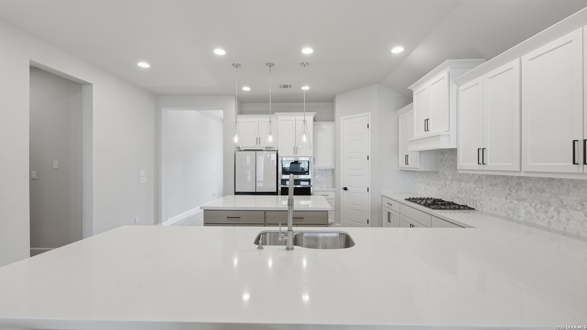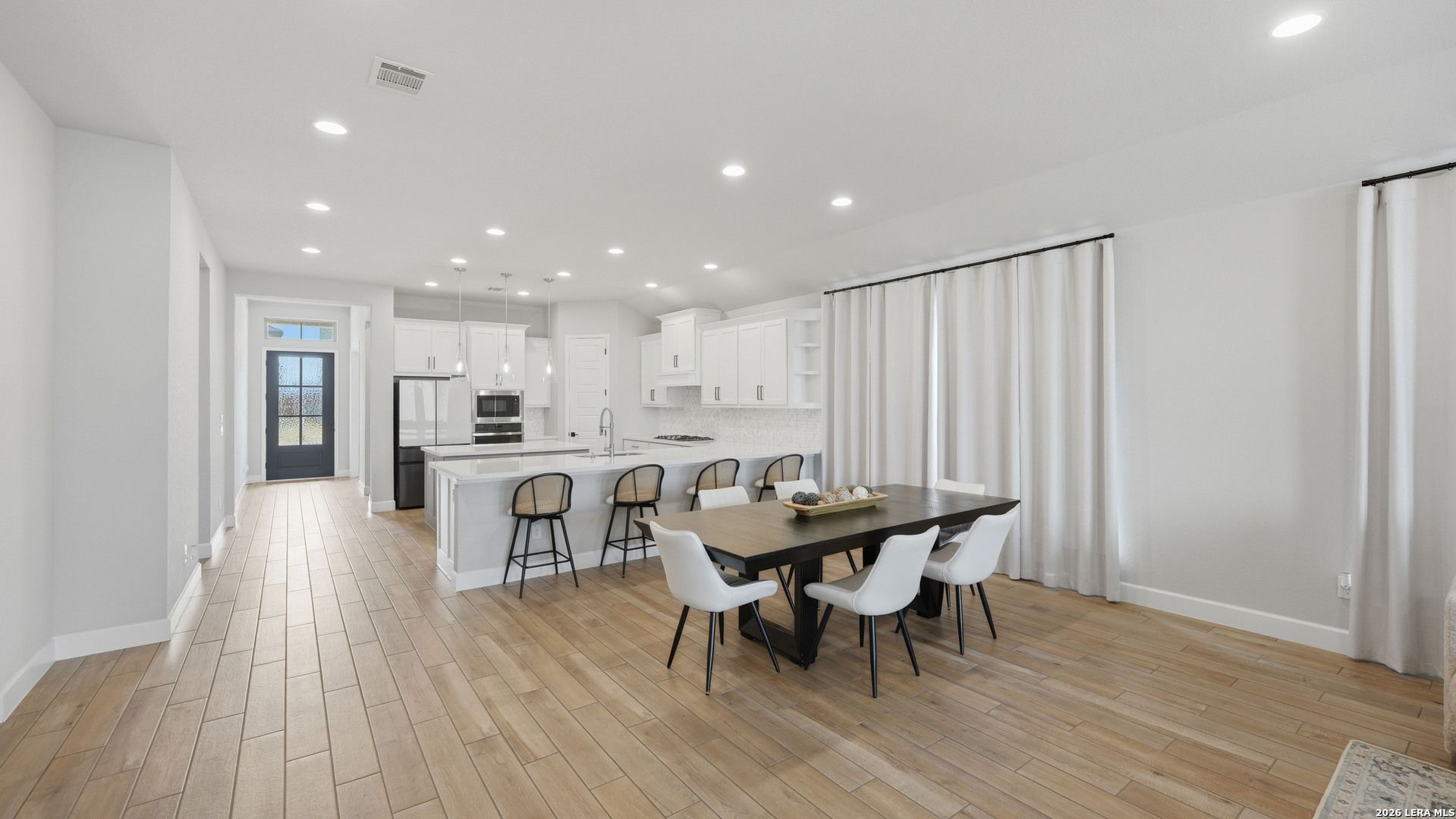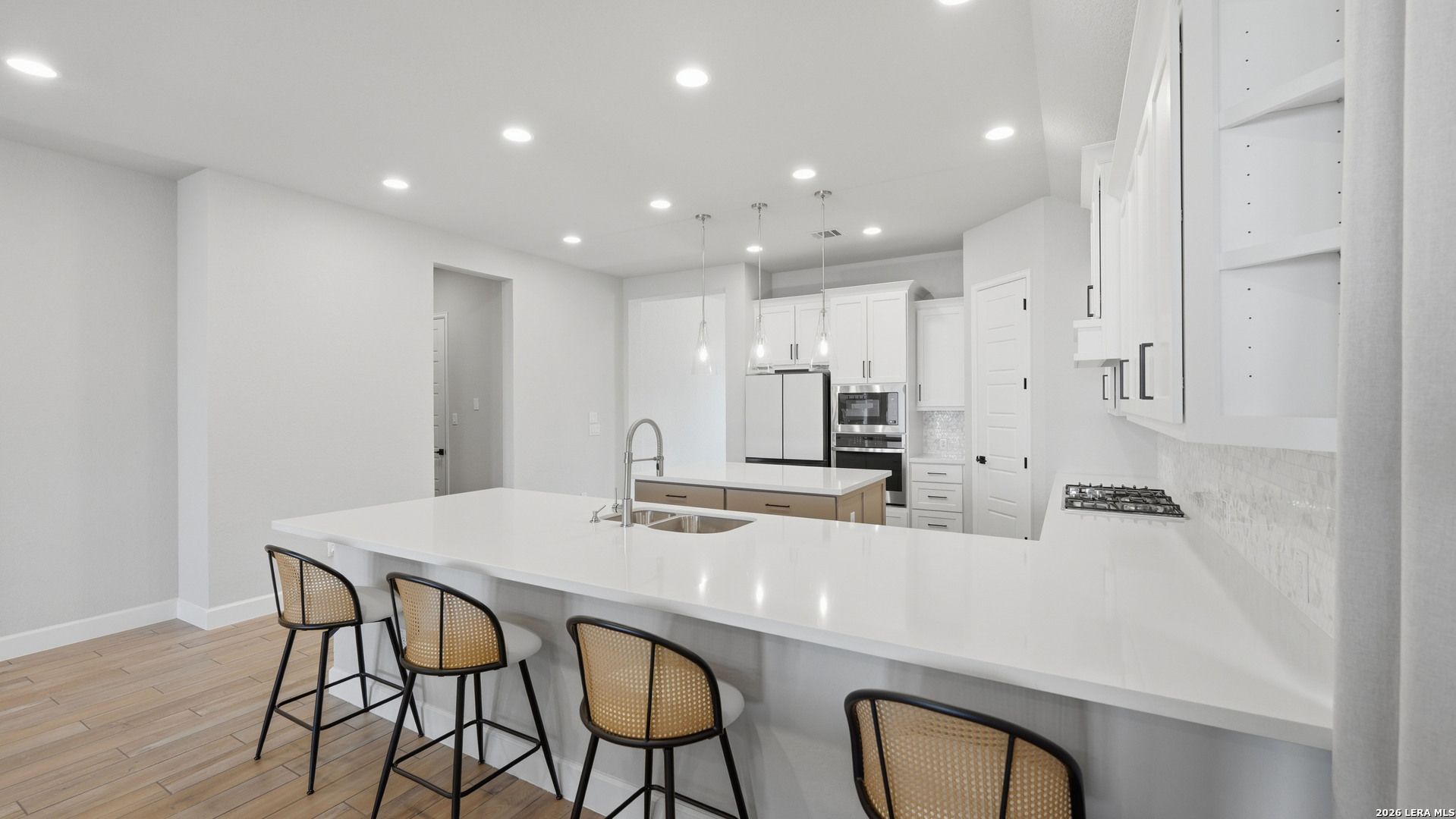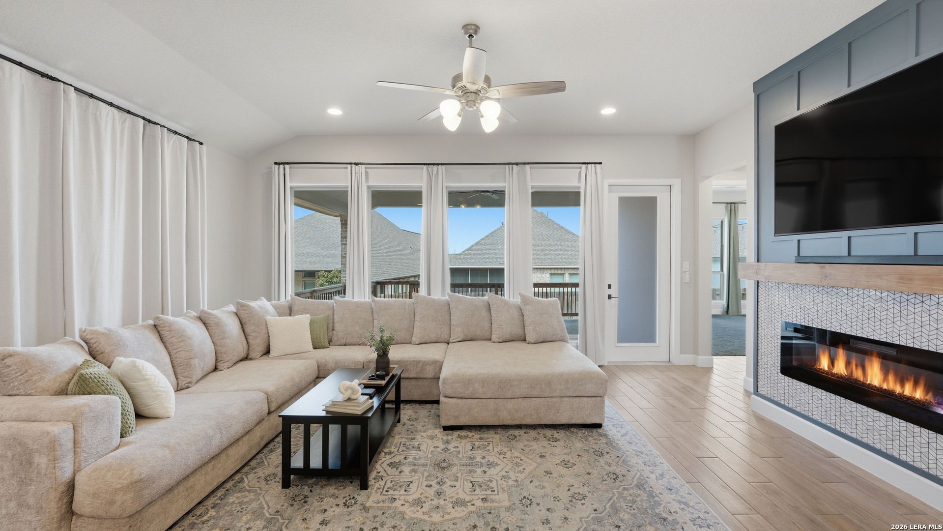 Luxury upgraded 3-bedroom, 2-bath home in the highly desirable Veramendi master-planned community in New Braunfels. Located on the hill, this thoughtfully designed home offers a semi-custom model home feel with premium finishes, smart home technology, and a modern open-concept layout. Interior features include 10' ceilings, 8' interior doors, quartz countertops throughout, and upgraded black hardware for a clean contemporary design. The spacious living room showcases a custom-built entertainment wall with storage, electric fireplace with heater, and built-in 75" Samsung TV with Bluetooth soundbar and subwoofer.The chef-style kitchen is designed for entertaining and everyday living with quartz countertops, built-in GE wall oven and microwave, WiFi-enabled vent hood, GE dishwasher, and a 5-burner gas cooktop. Additional upgrades include a hidden trash drawer, pantry shelving with jamb switch lighting, and a modern galley faucet. The primary suite retreat features a custom accent wall, custom-built closet, and spa-inspired bathroom with a frameless double shower and dedicated vanity space. Secondary bedrooms offer walk-in closets and ceiling fan pre-wiring, with fans installed in the primary bedroom and living room. Smart and energy-efficient upgrades include Ring doorbell, keyless entry, Ecobee smart thermostat, Leviton smart light switches, CAT6 wiring throughout, fresh air circulation system, and tankless water heater. The finished garage features epoxy flooring, storage organizers, built-in work desk with shelving, rough plumbing for a water softener, and garage door openers with exterior keypad. Enjoy outdoor living on the extended covered patio with a 72" smart fan, gas grill connection, electrical outlets, and paver walkway. Residents of Veramendi enjoy a lagoon-style pool, parks, trails, playgrounds, and convenient access to dining, shopping, and everything New Braunfels has to offer.