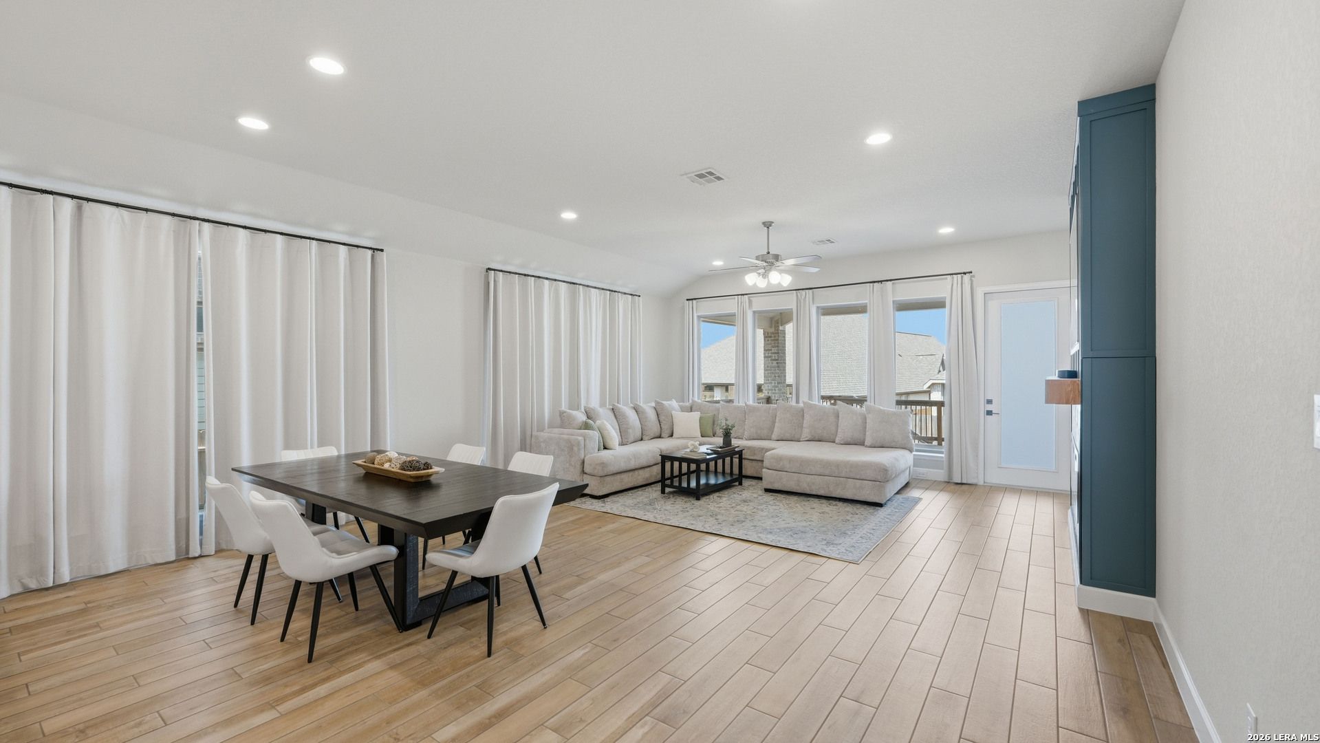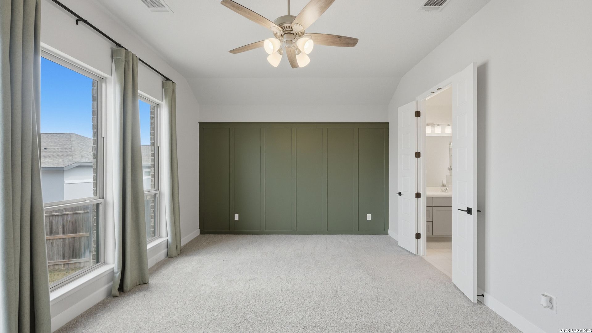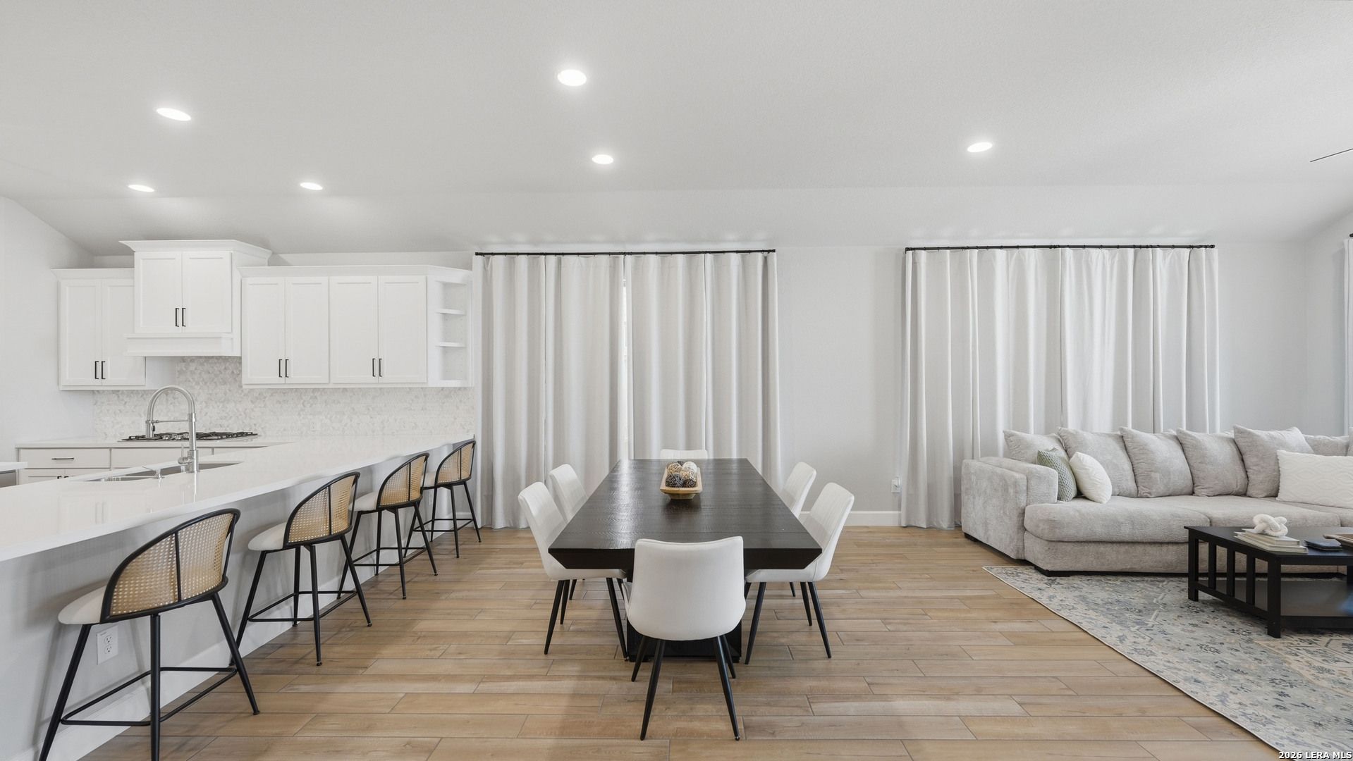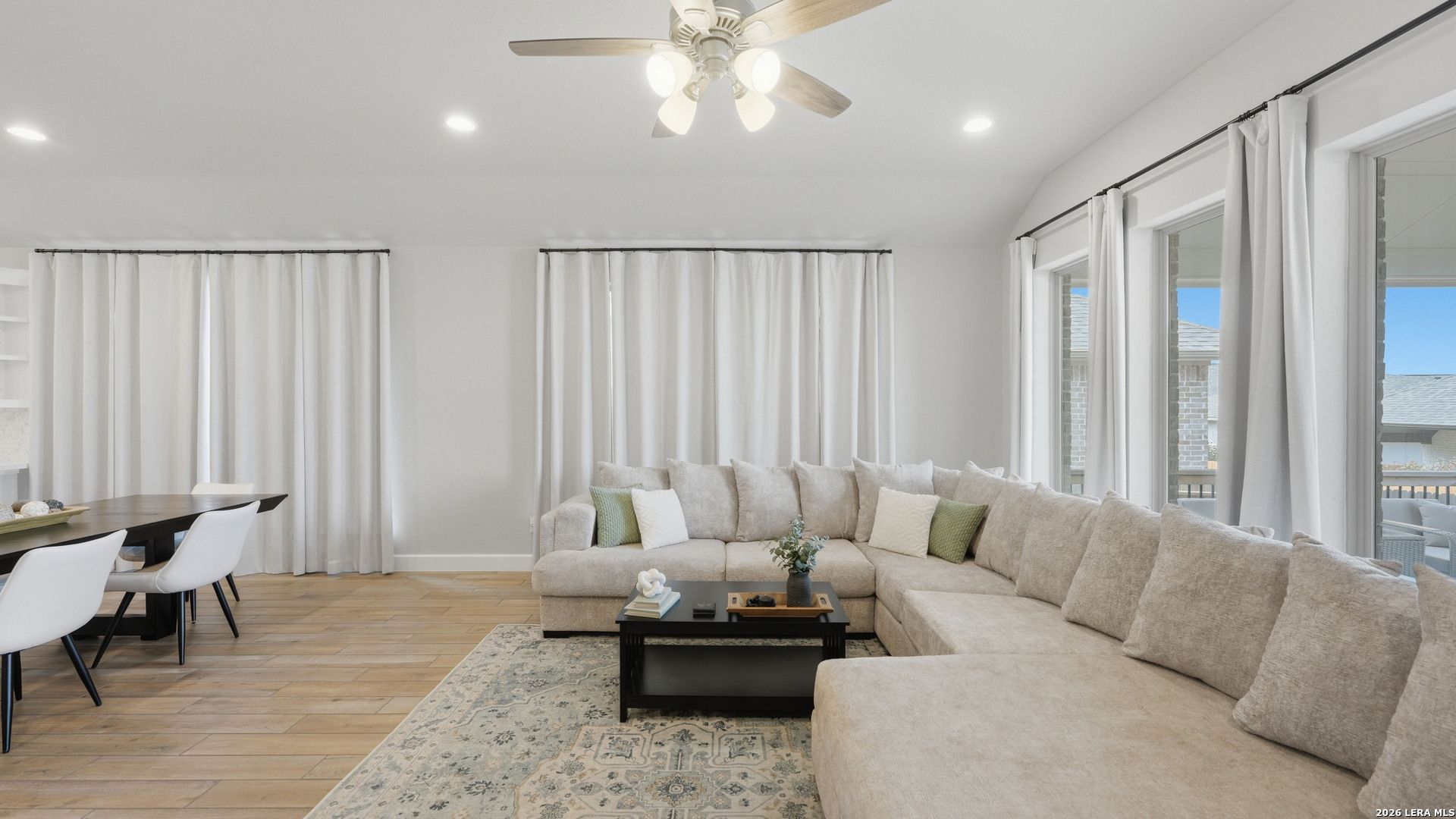 Luxury upgraded 3-bedroom, 2-bath home in the highly desirable Veramendi master-planned community in New Braunfels. Located on the hill, this thoughtfully designed home offers a semi-custom model home feel with premium finishes, smart home technology, and a modern open-concept layout. Interior features include 10' ceilings, 8' interior doors, quartz countertops throughout, and upgraded black hardware for a clean contemporary design. The spacious living room showcases a custom-built entertainment wall with storage, electric fireplace with heater, and built-in 75" Samsung TV with Bluetooth soundbar and subwoofer.The chef-style kitchen is designed for entertaining and everyday living with quartz countertops, built-in GE wall oven and microwave, WiFi-enabled vent hood, GE dishwasher, and a 5-burner gas cooktop. Additional upgrades include a hidden trash drawer, pantry shelving with jamb switch lighting, and a modern galley faucet. The primary suite retreat features a custom accent wall, custom-built closet, and spa-inspired bathroom with a frameless double shower and dedicated vanity space. Secondary bedrooms offer walk-in closets and ceiling fan pre-wiring, with fans installed in the primary bedroom and living room. Smart and energy-efficient upgrades include Ring doorbell, keyless entry, Ecobee smart thermostat, Leviton smart light switches, CAT6 wiring throughout, fresh air circulation system, and tankless water heater. The finished garage features epoxy flooring, storage organizers, built-in work desk with shelving, rough plumbing for a water softener, and garage door openers with exterior keypad. Enjoy outdoor living on the extended covered patio with a 72" smart fan, gas grill connection, electrical outlets, and paver walkway. Residents of Veramendi enjoy a lagoon-style pool, parks, trails, playgrounds, and convenient access to dining, shopping, and everything New Braunfels has to offer.