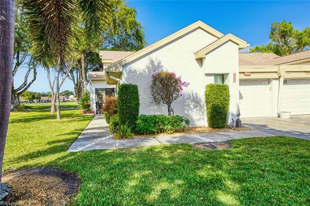Welcome to an exceptional waterfront residence within the prestigious 55+ bundled golf community of Seven Lakes Golf & Tennis Community. Perfectly positioned along the tranquil lake and overlooking fairway #9, this beautifully updated “Coronado” villa captures breathtaking sunset views and the essence of refined Florida living.Spanning 1,400 plus square feet, this thoughtfully designed home blends comfort and sophistication. The open-concept kitchen is appointed with gleaming granite countertops, stainless steel appliances, and an inviting island bar ideal for casual gatherings. Custom blinds and elegant tile flooring enhance the main living spaces, while expansive sliding doors open to a screened lanai with removable acrylic windows—creating a seamless indoor-outdoor retreat for year-round enjoyment. This villa sits on an over sized lot that adjoins additional parking for visiting guests. Full Size stacked interior washer and dyer. Meticulously maintained and offered partially furnished, the residence reflects pride of ownership throughout. Recent enhancements include a 2023 roof and 2023 AC/furnace, ensuring modern efficiency and peace of mind. Golf cart space #36 and golf cart are included, completing the effortless lifestyle this home provides.All assessments are paid. Seven Lakes is a bundled golf, 55+ active adult community featuring a newer executive golf course and resort-style amenities: • 6 heated pools • 6 Har-Tru tennis courts • Pickleball, shuffleboard & bocce ball • Fitness center, billiards, wood shop, library & card rooms • On-site restaurant • Full-time recreational staff with dinners, movies & dances. Pet-friendly (1 pet under 25 lbs) with a 24-hour manned guard gate. The monthly fee includes bundled golf for two, cable, Wi-Fi, water, sewer, trash, building maintenance, and structure insurance—you only pay for electricity! No golf transfer fees, no green fees, and no food minimums. Conveniently located just minutes from restaurants, beaches, and RSW Airport. Come experience the lifestyle—this is Florida living at its finest!