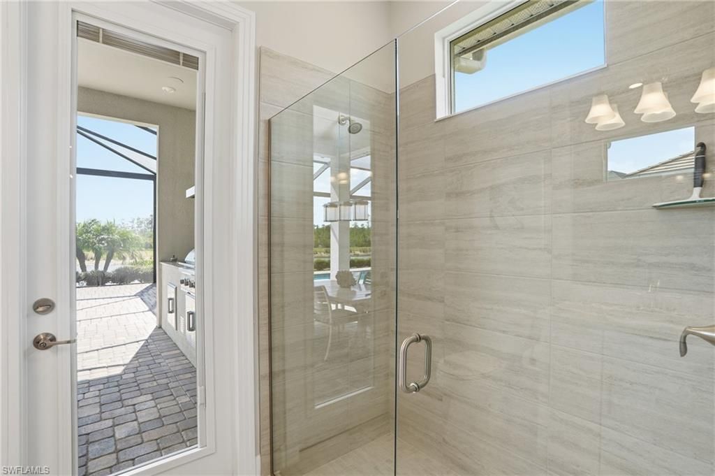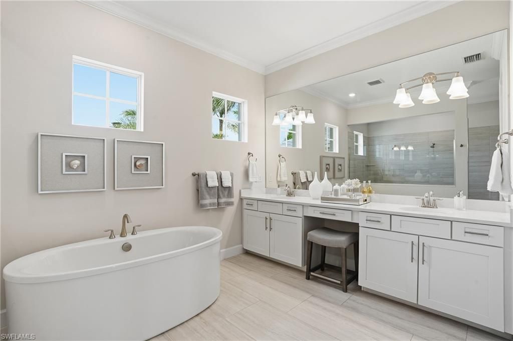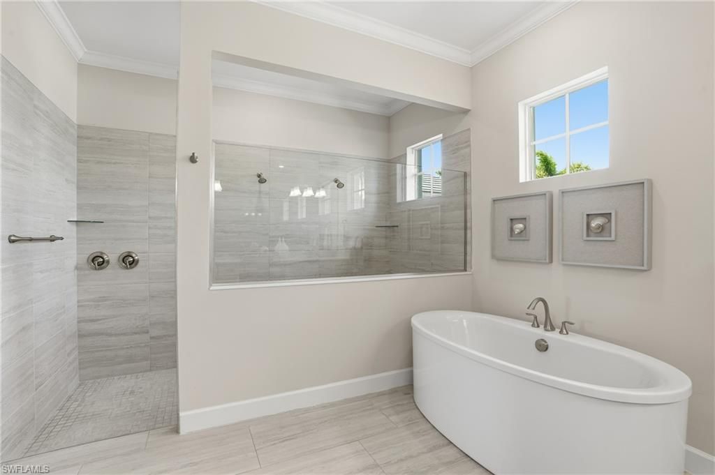 - Built-In Cabinets, Cable TV Hookup, Entrance Foyer, Internet Available, Pantry, Smoke Detector, Wired for Sound, Tray Ceiling(s), High Ceilings, Walk-In Closet(s), Den, Laundry Facility, Main Level Primary, Living/Dining Room, Eat-in Kitchen, Separate/Formal Dining Room, Gas Appliance Hookup, Kitchen Island, Dual Sinks, Multiple Shower Heads, Bathtub, Separate Shower, Impact Glass