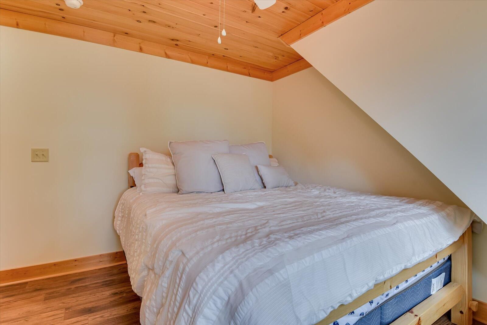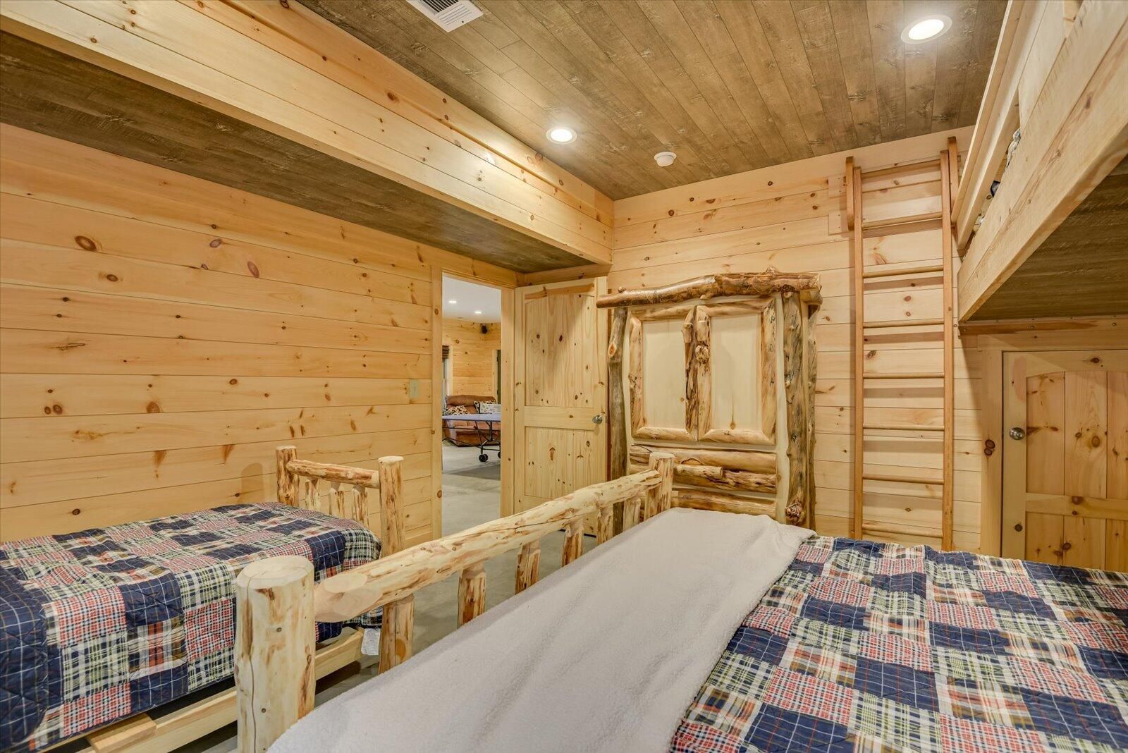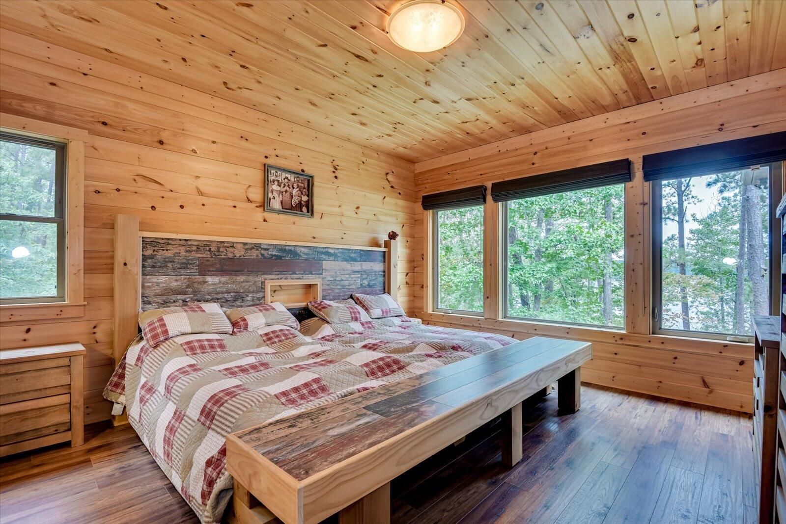 This LAKEFRONT RETREAT, w/ a SPECTACULAR VIEW and BEACH AREA comes FULLY FURNISHED, JUST BRING YOUR TOOTHBRUSH AND CLOTHES, 5 bedrooms, 4 baths, and a study (or 6 bedrooms), 3 car garage with one bay sized for an RV or Pontoon Boat, Sauna Room, Pool Table, Ping Pong Table, pull down Projection Screen, wet bar, front and back porches, plus a main level deck. Each room is unique, some with built-in features such as dresser drawers inset into the walls, kid's play closet, built-in loft and bunk style beds, and custom made furniture. Even the roof lines add interest to each room, with sunlight reflecting off of every angle and lighting fixtures spreading light to every corner. Beautiful tile and wood floors are found throughout this home. Other features include: •Primary suite comes with a custom built family size bed (or two queen beds together), custom dresser and chest of drawers and walk in closet. • Primary bathroom has heated floor & accessible Roman shower with rain style and wand shower heads, combination toilet/bidet, an extra long double vanity and a tub. • Family Room has floor-to-ceiling, wood burning, stone fireplace and loft area, allowing heat to help warm the upstairs, as well as into the Primary Suite. The design allows for continuous overnight operation. • A built-in bar is discreetly hidden in the living room wall. • All electric kitchen has granite counter tops, an L-shaped center island that matches the look of the stone fireplace, w/ counter height wood stools along one side, a walk-in pantry, lots of storage, discreet nook under the island for trash, externally exhausted range hood and outlets in the island as well as in the pantry. • All stainless appliances, microwave on elevated shelf and a farm style sink handle all of your food prep needs. • Induction top electric range in kitchen includes a set of pots for proper use of stove. • Dining room has custom, built in benches on two sides of a huge, expandable dining table, with wood chairs lining the other two sides. • Mudroom off of Kitchen has lots of storage for outdoor wear and sports accessories. • Laundry room has custom cabinetry with washer, dryer, sink and 2nd refrigerator. There is also an exit to the rear deck which has keyless entry pad. • Three of the 5 bedrooms include walk-in closets. • Lower level was finished in February 2024. A large recreation room. One end has a stone, wood burning fireplace, a projector with a roll down screen and pre-wired speakers. The other end houses a pool table and ping pong table (both convey) and the center includes a built-in wet-bar. • Lower level bedroom has built in loft bed and custom armoire. • Lower level bathroom includes a large tiled Roman shower, a sauna and sauna room and built in linen closet. • The garage includes a wall mounted vacuum system. • Front porch can be accessed from circular drive or from parking area in front of garage. There is also an installed bench swing. • Lower level concrete patio is covered by deck above with stair access and access from lower level. Off to the side, is an outdoor shower for use when returning from the lakeside beach. • Main level deck is under cover, with beautiful wood ceilings and boasts beautiful views of the lake and beach area • A large storage room for kayaks and water toy storage is accessible from the lower patio. Kayaks Convey. • There is a large unfinished room over the garage, with electric wiring, light and HVAC hook-up. Room is accessed from the upper level hallway. • Home has three independent HVAC units (one unit for each floor) • Outdoor security cameras also Convey that can be linked to your phone. • A dock permit is in place. NOTE: ''With an Accepted Offer, Seller will place an order to have a Boat Slip built at no cost to the Buyer, after Closing.'' All appliances are original (2017). HVAC on Main Level replaced in 2022 All appliances, furnishings, kayaks, everything in the home CONVEY!