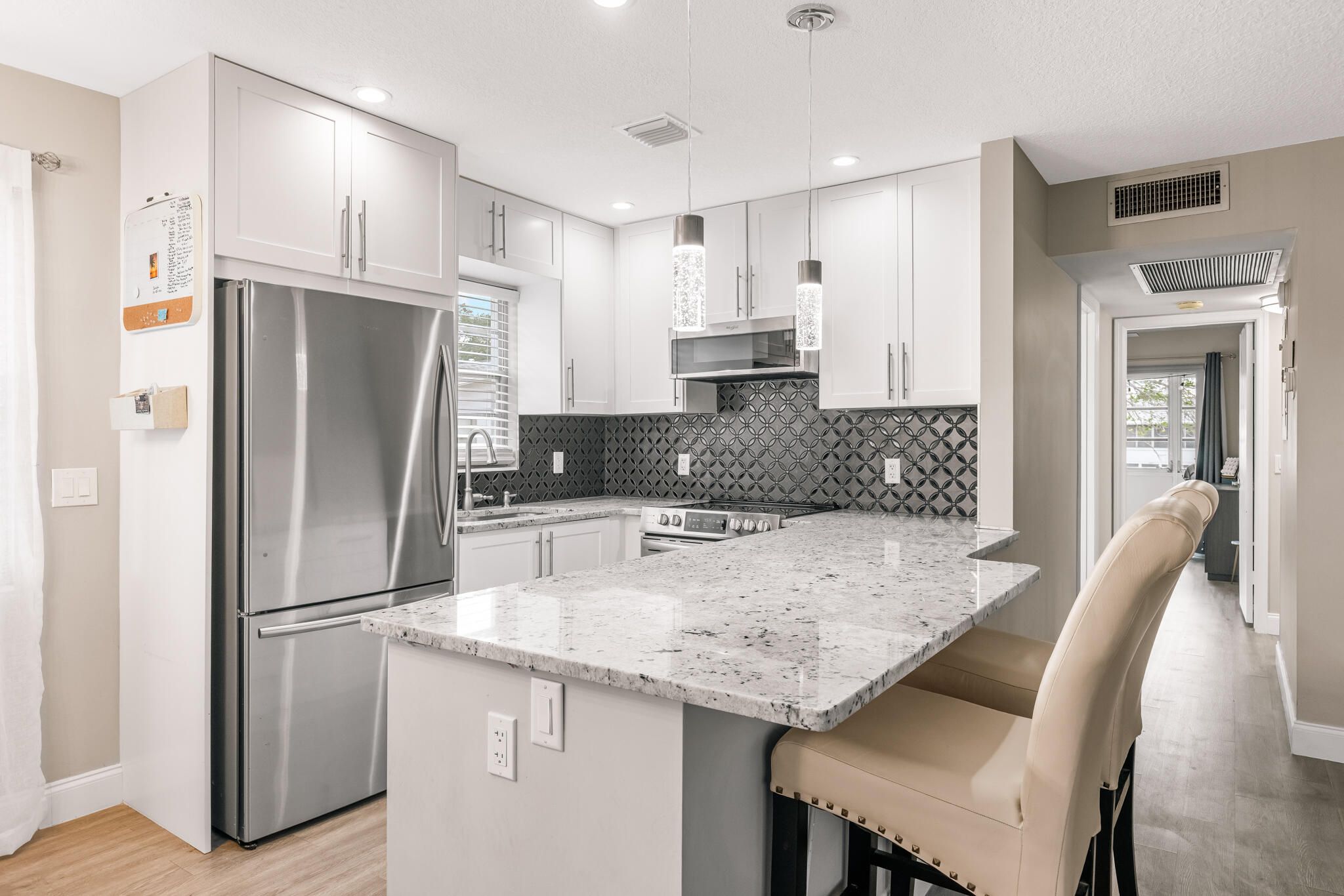 Step into this beautifully updated light and bright two bedroom, one and a half bathroom corner condo. The modern open kitchen features full-height cabinetry, stainless steel appliances and granite countertops that makes cooking and entertaining a breeze. Enjoy the airy open feel enhanced by modern light fixtures and ceiling fans throughout. Take in the beautiful sunsets relaxing in your air conditioned Florida room. Indulge in the resort-style amenities with a state-of-the-art clubhouse, fitness center, pool, pickleball and tennis courts and plenty of entertainment and activities to keep busy within this 55+ gated community. Schedule your private showing today! (*Furniture Negotiable*)