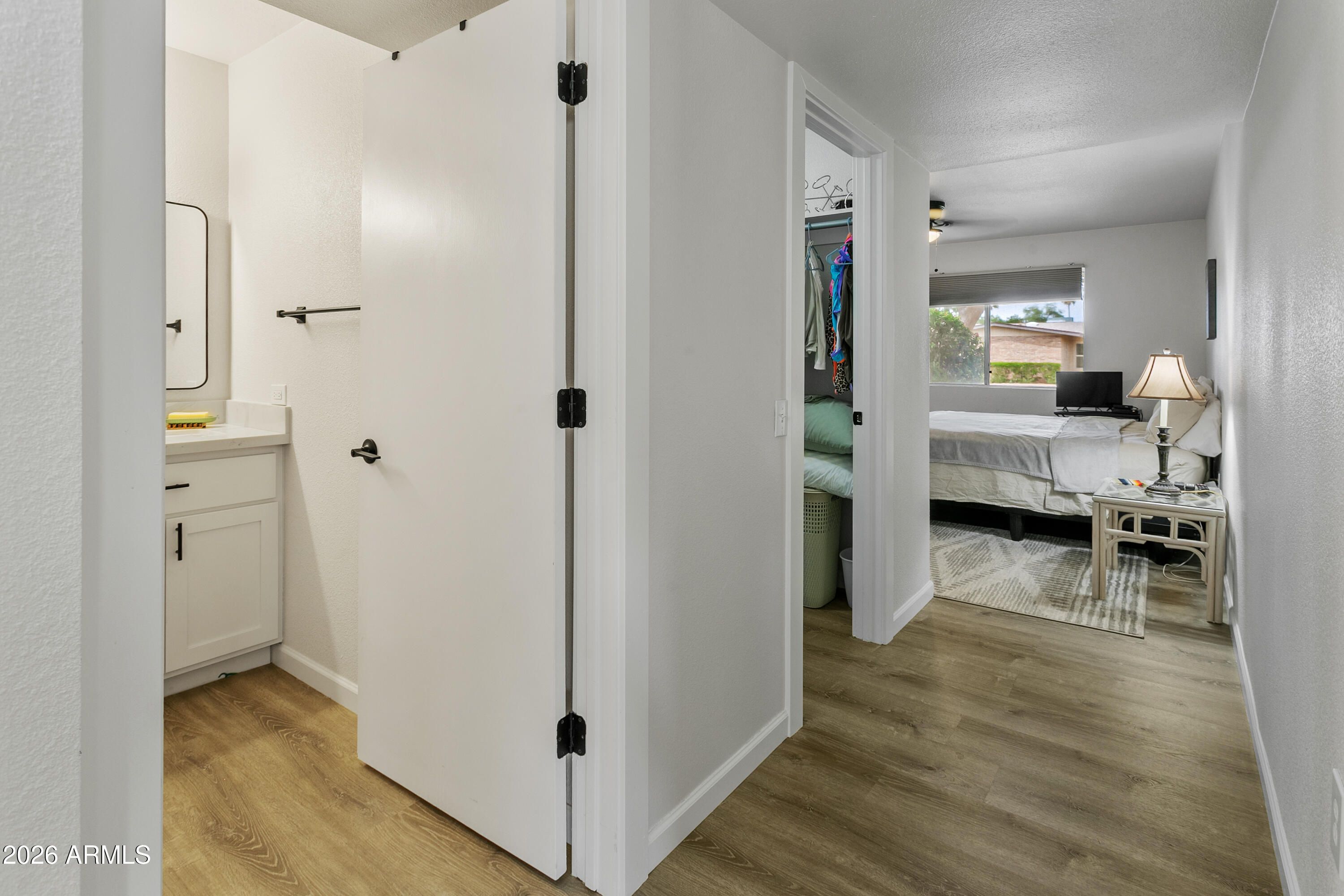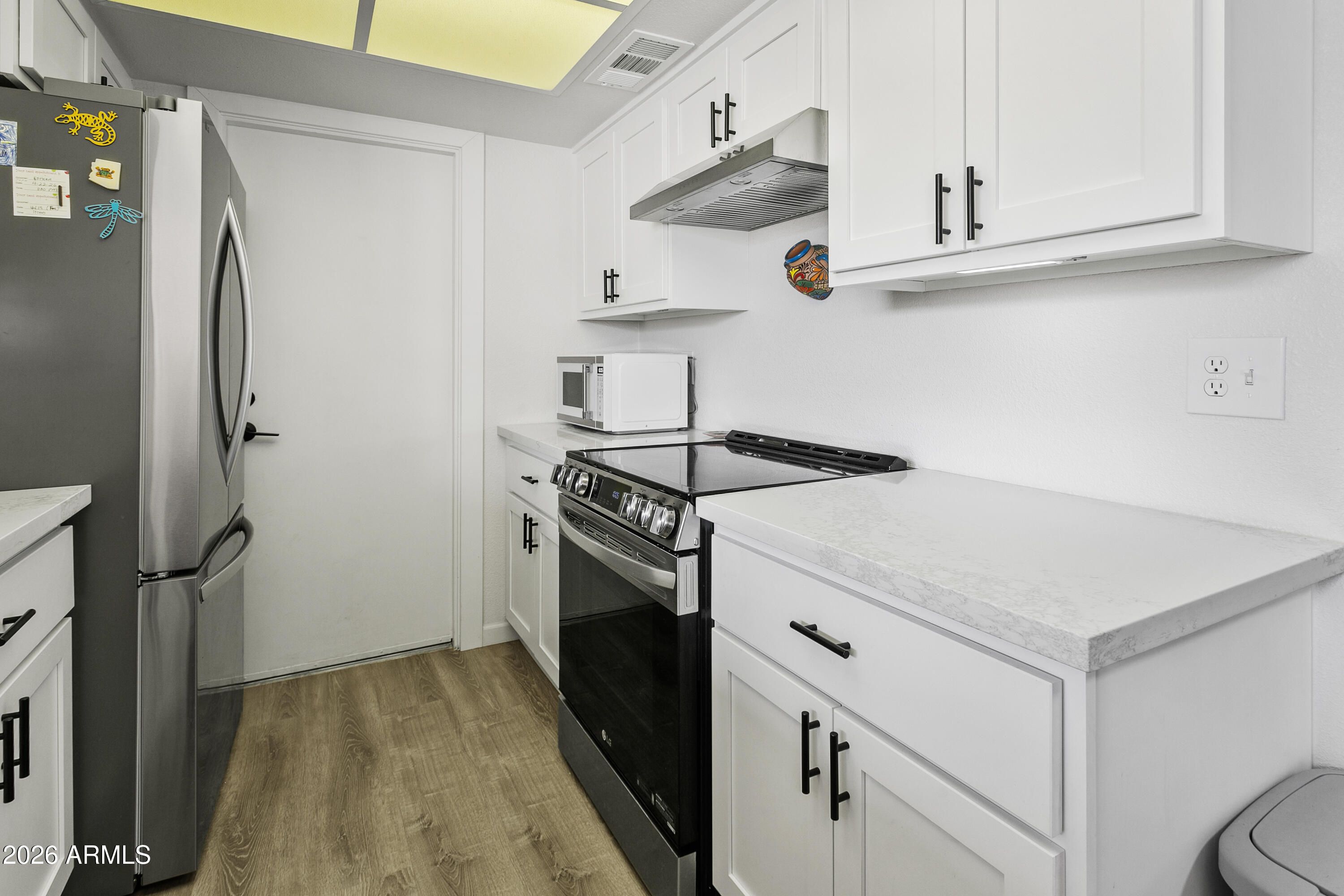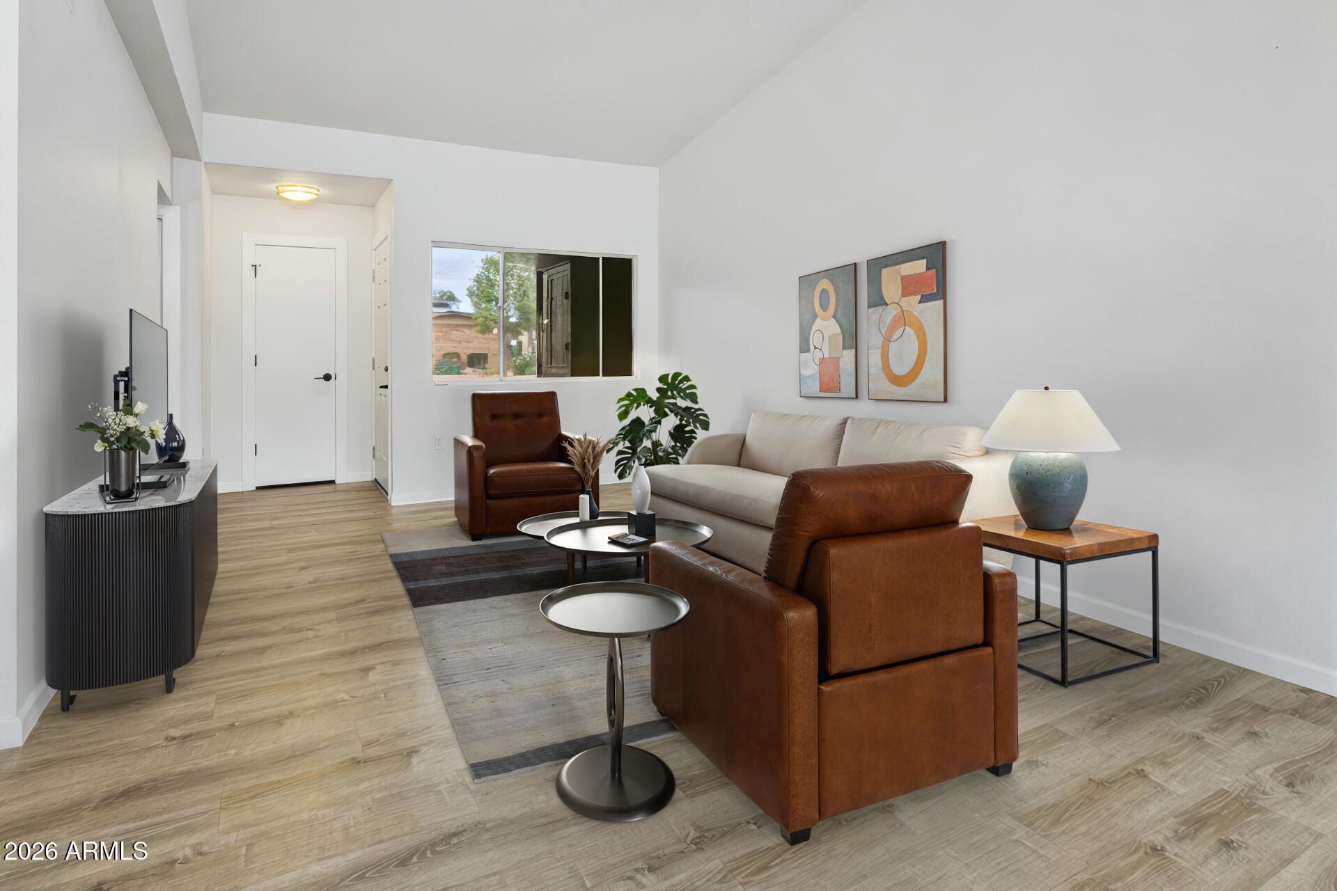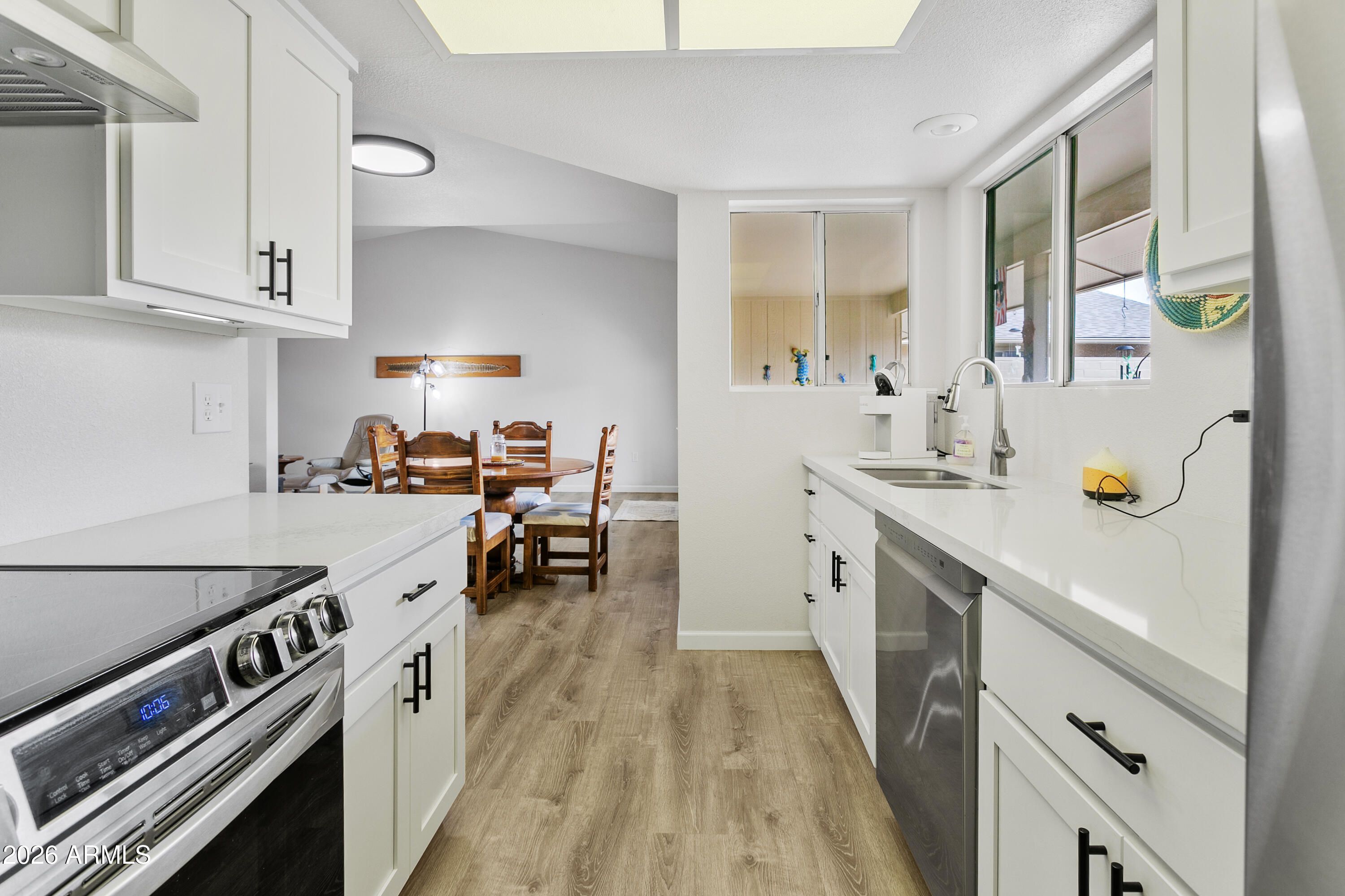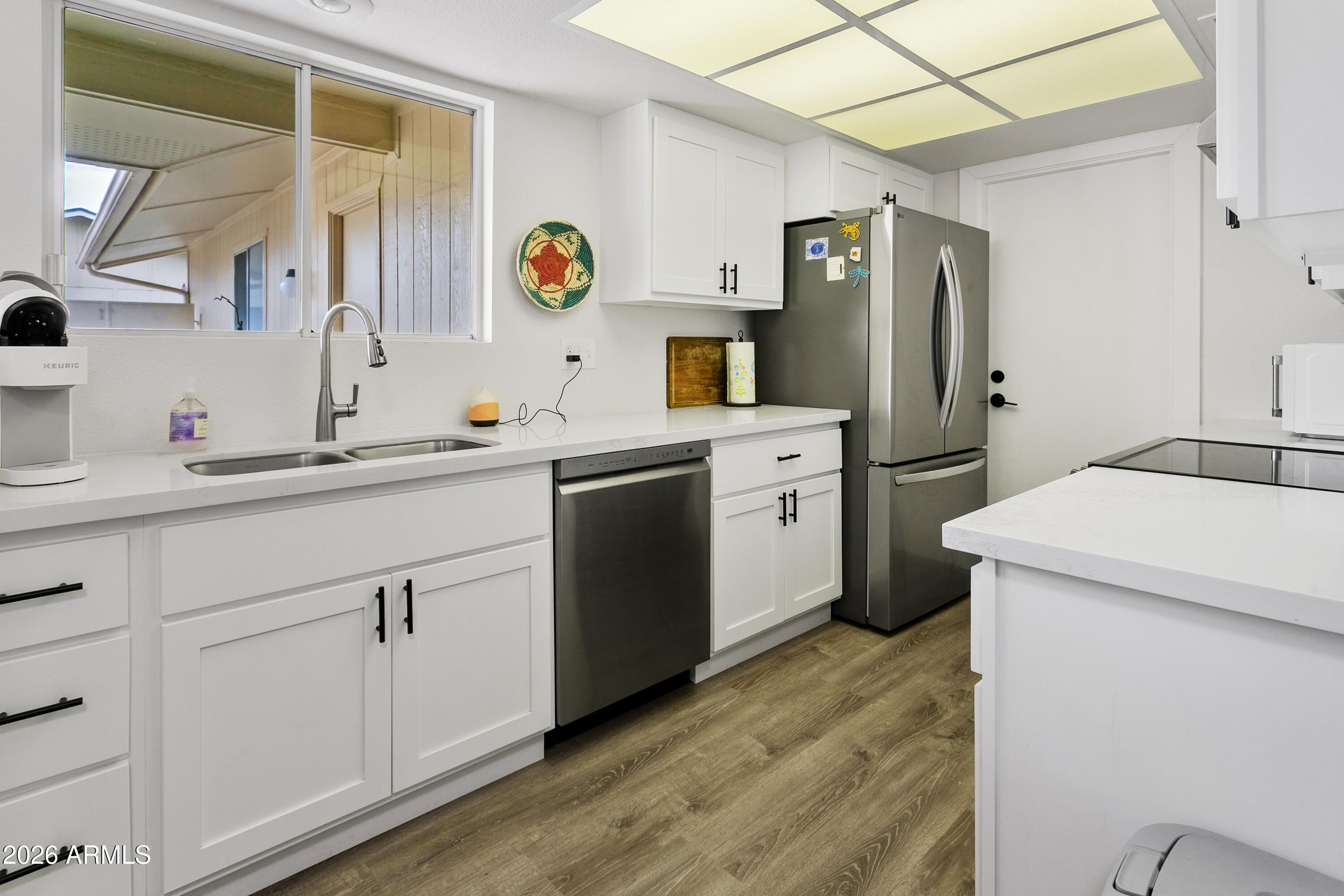 Turnkey, fully remodeled living in the heart of Sun City West - this lock-and-leave townhome is perfectly designed for seasonal escapes or full-time retirement comfort. Enjoy a low-maintenance lifestyle where every detail has already been upgraded. Spend your mornings on the private courtyard, afternoons on the golf course or at the pool, & evenings in a beautifully refreshed home that feels brand new. Whether you're a winter visitor or settling into full-time retirement, this home delivers ease, comfort, & community. Completely remodeled throughout, the home features new laminate flooring, updated baseboards, & fresh interior paint. The designer kitchen shines with white cabinetry, black hardware, quartz countertops, & stainless steel appliances--plus refrigerator, washer, & dryer convey. The open living room is elevated by vaulted ceilings and double French doors that lead to a private courtyard, creating seamless indoor-outdoor flow. Both the primary suite and guest bath have been fully remodeled with quartz vanities and beautifully tiled walk-in shower/bath combo. Bedrooms include blackout honeycomb cellular shades for comfort and privacy. Private back courtyard with space and access for golf cart parking, plus a 1.5-car garage offering ample storage. Experience the best of Sun City West living in a fully updated, move-in-ready home, perfect for your next chapter or winter retreat.