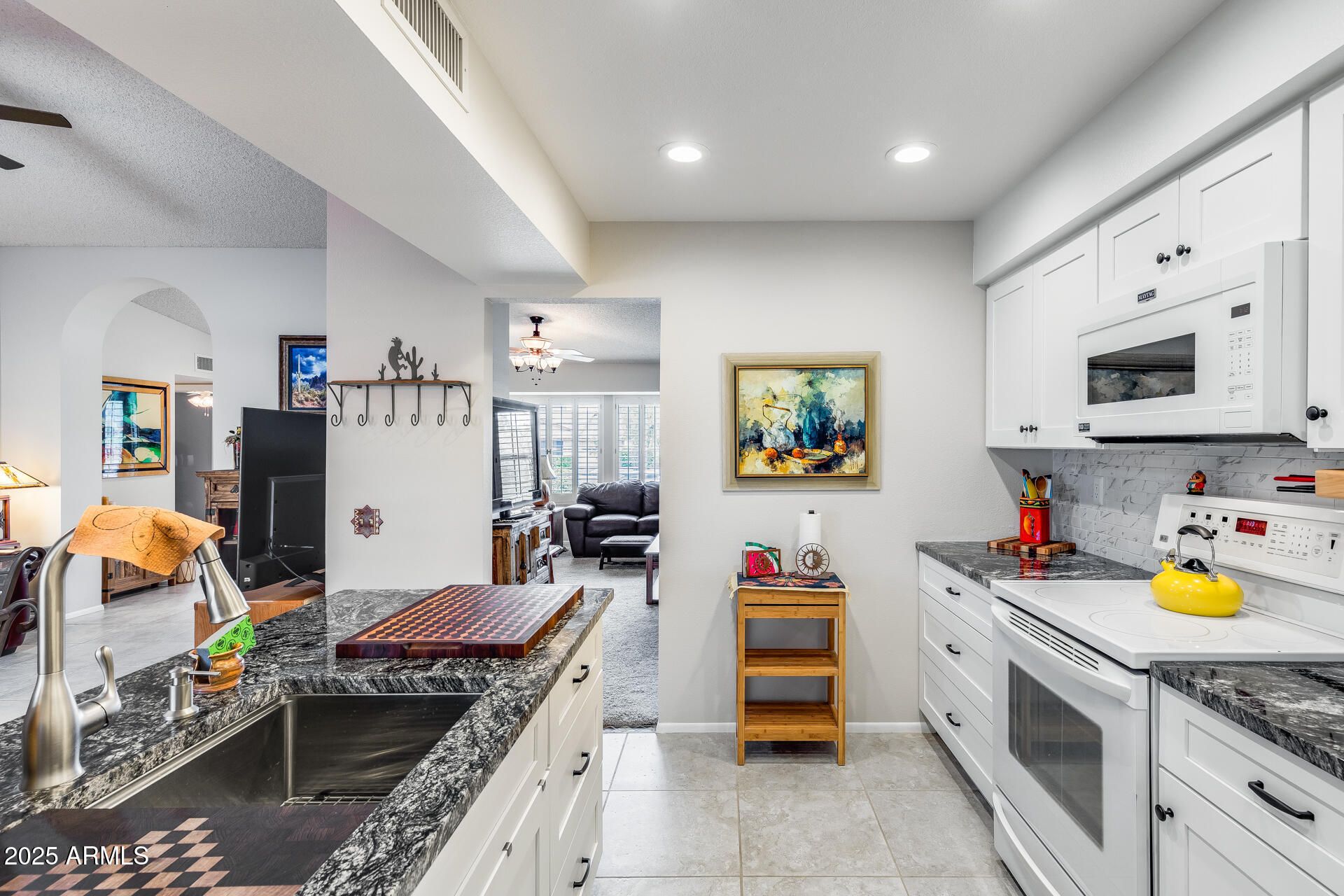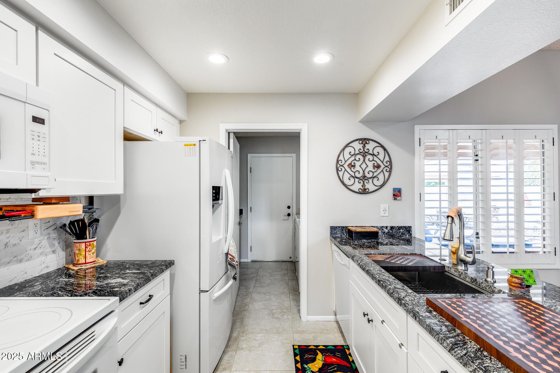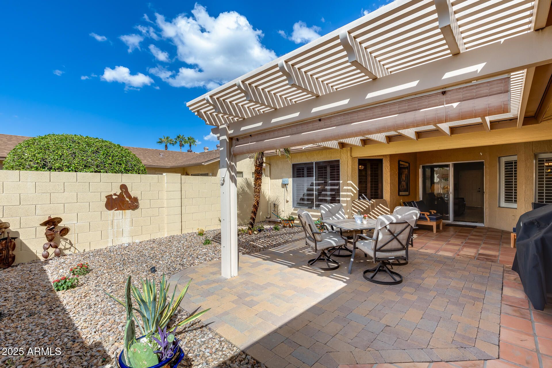 This beautifully updated home blends comfort and quality with thoughtful upgrades throughout. The kitchen showcases chiseled-edge granite countertops, white Shaker cabinets with large drawers and pullouts, updated appliances that all convey, and a dining area that flows into the spacious living room—perfect for entertaining or relaxing. You'll appreciate the tile in all the right areas, fresh interior paint, updated shutters on every window, and a new slider shade for added comfort and privacy. Both bedrooms include walk-in closets, and the bathrooms feature newer vanities and fixtures. A brand-new HVAC (2024) ensures year-round comfort, and the roof (replaced in 2014) is covered by the HOA ... Step outside to your private backyard retreat with a covered pergola, decorative shutters, low-maintenance desert landscaping, and a recently replaced irrigation systemperfect for morning coffee or evening relaxation. Added conveniences include inside laundry with cabinetry and a 1-car garage for secure parking and extra storage. Located in a desirable 55+ community with access to a clubhouse, pool, spa, and social activities, and within walking distance to several stores and restaurants, this move-in-ready home delivers the best of comfort, style, and low-maintenance living in one complete package.