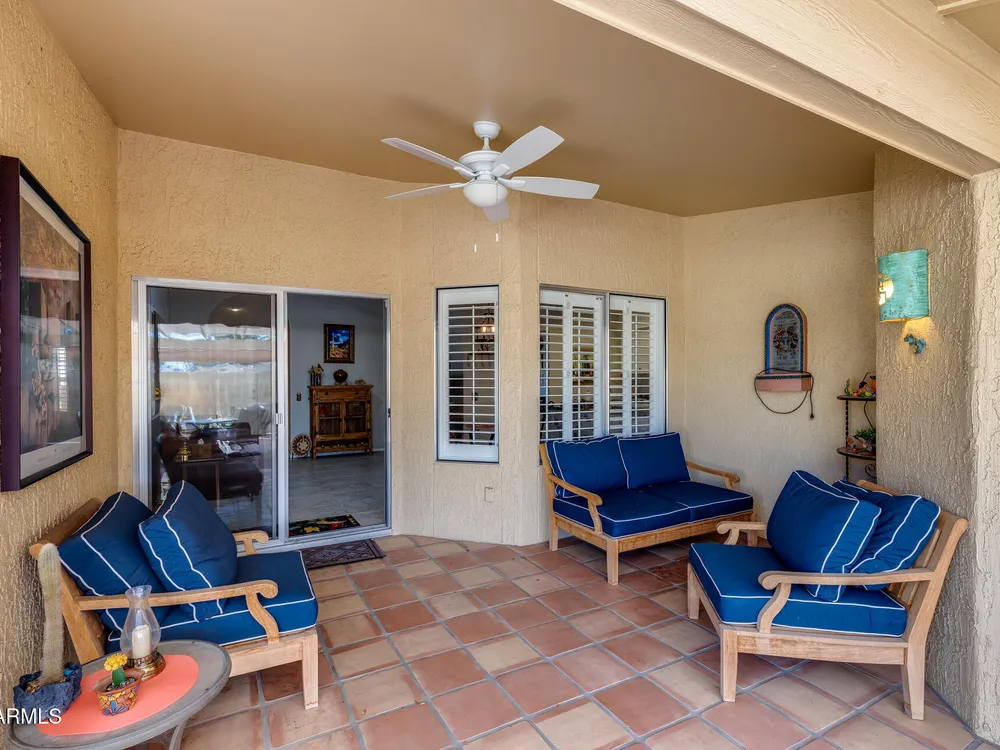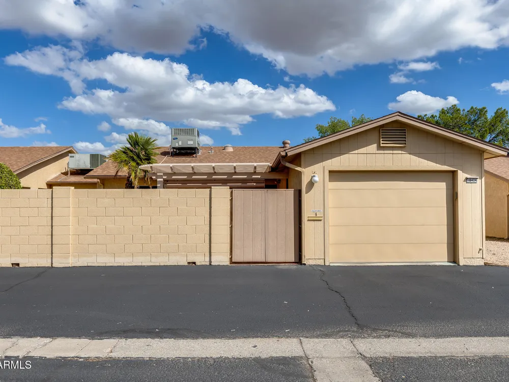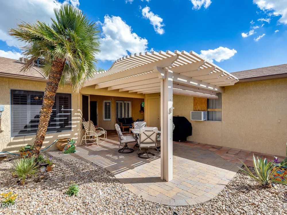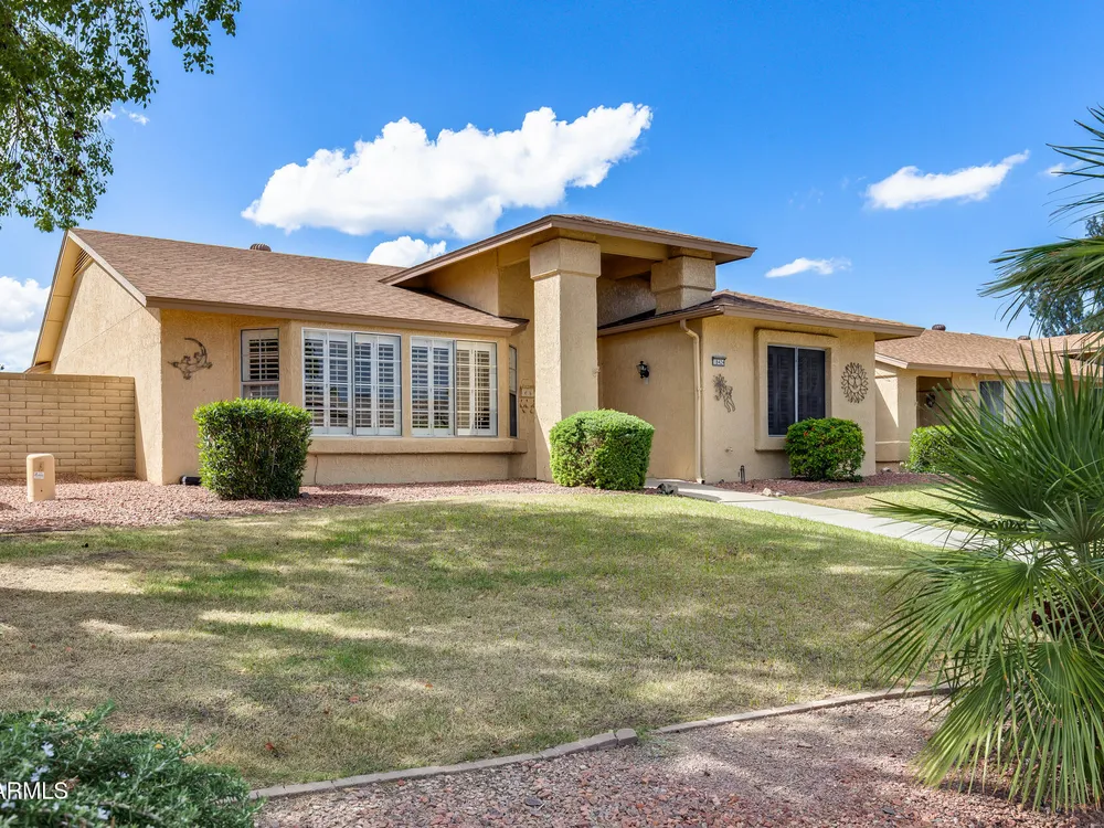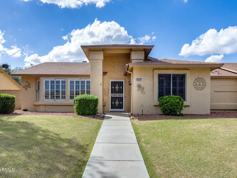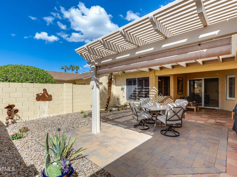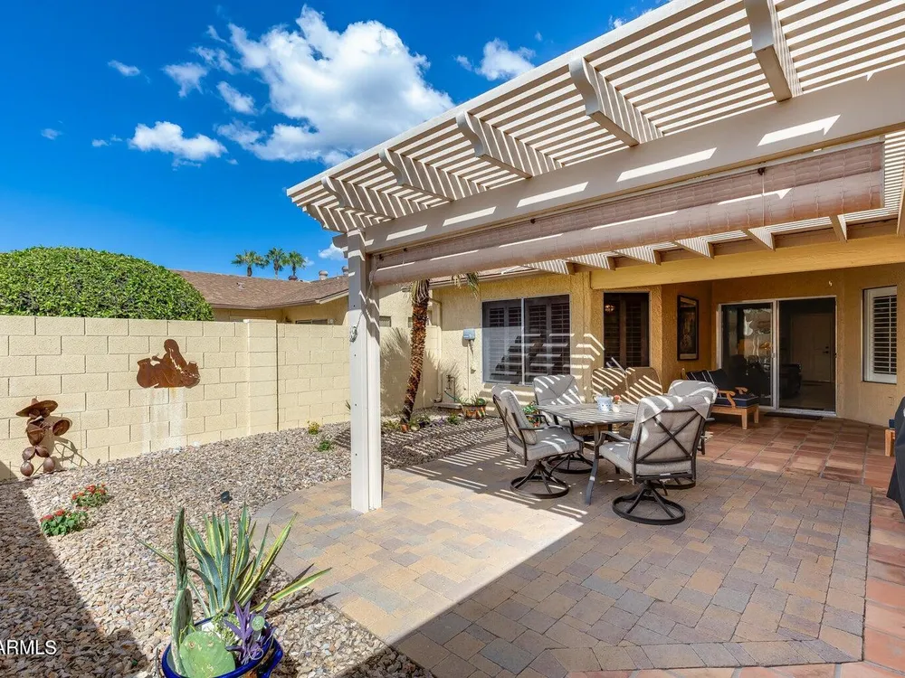 This beautifully updated home blends comfort and quality with thoughtful upgrades throughout. The kitchen showcases chiseled-edge granite countertops, white Shaker cabinets with large drawers and pullouts, stainless steel appliances (all appliances convey), and a dining area that flows into the spacious living room—perfect for entertaining or relaxing. You'll appreciate the tile in all the right areas, fresh interior paint, updated shutters on every window, and a new slider shade for added comfort and privacy. Both bedrooms include walk-in closets, and the bathrooms feature newer vanities and fixtures. A brand-new HVAC (2024) ensures year-round comfort, and the roof (replaced in 2014) is covered by the HOA ... Step outside to your private backyard retreat with a covered pergola, decorative shutters, low-maintenance desert landscaping, and a recently replaced irrigation systemperfect for morning coffee or evening relaxation. Added conveniences include inside laundry with cabinetry and a 1-car garage for secure parking and extra storage. Located in a desirable 55+ community with access to a clubhouse, pool, spa, and social activities, and within walking distance to several stores and restaurants, this move-in-ready home delivers the best of comfort, style, and low-maintenance living in one complete package.