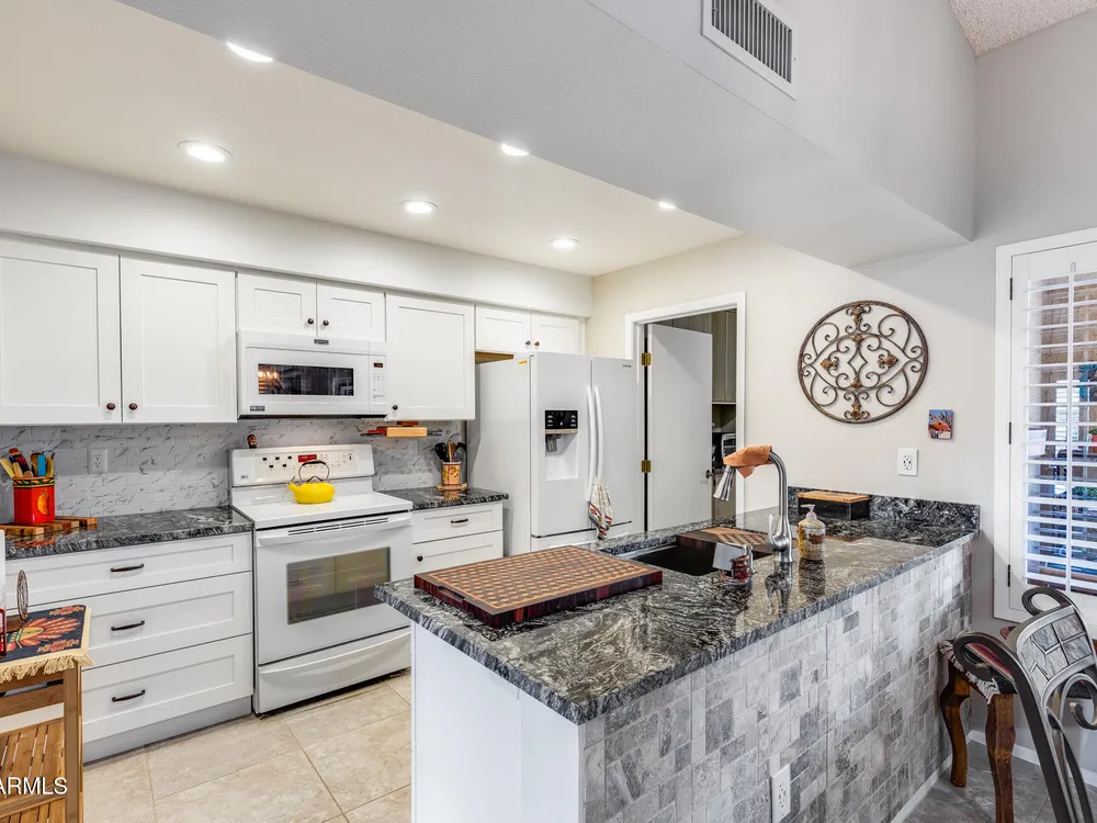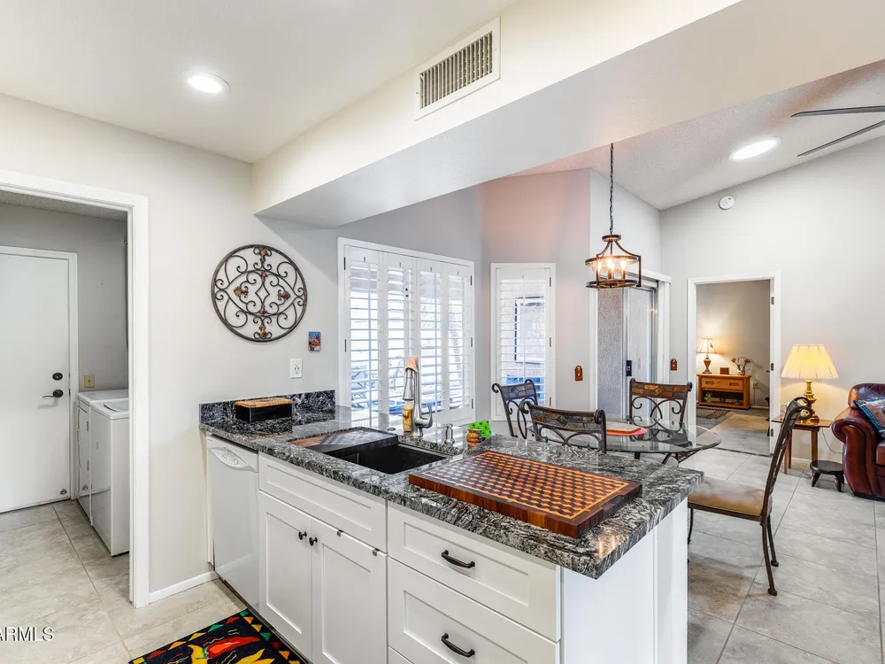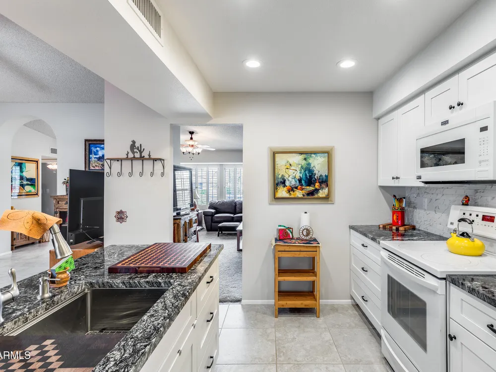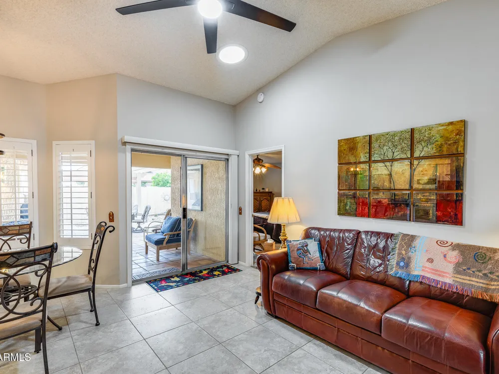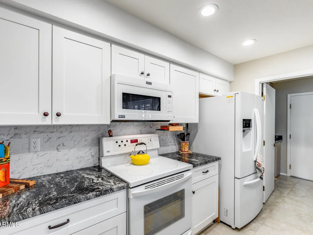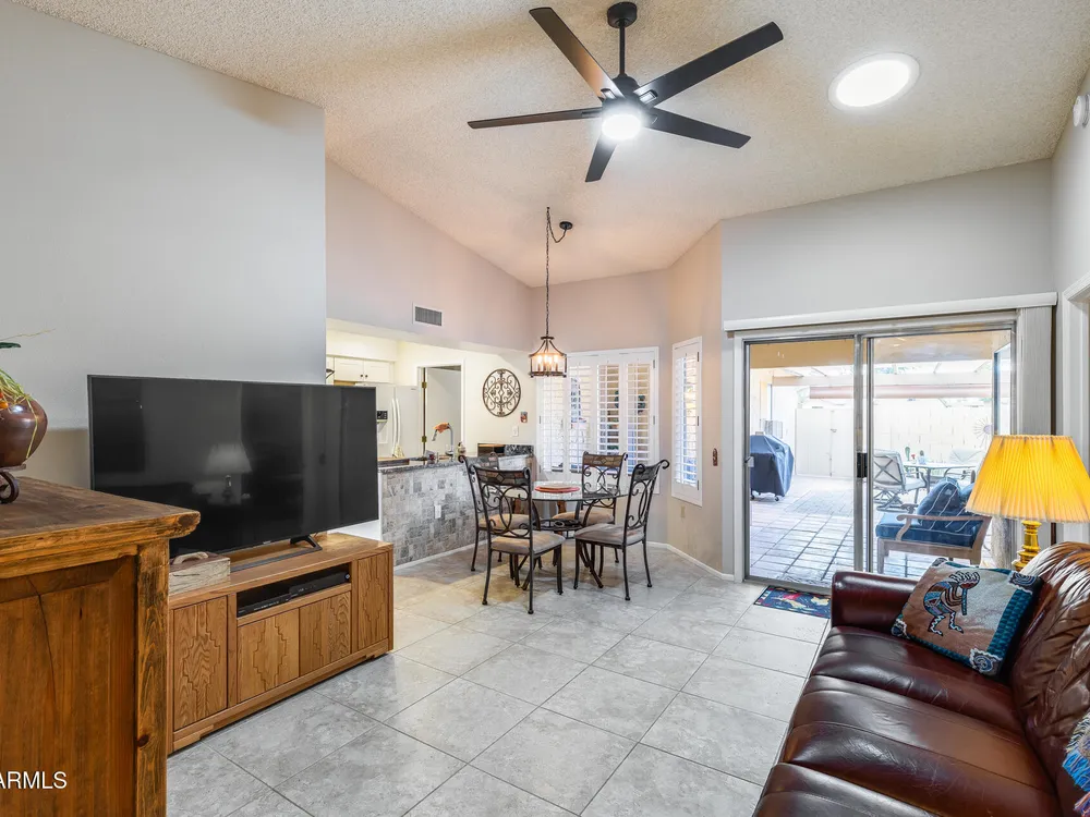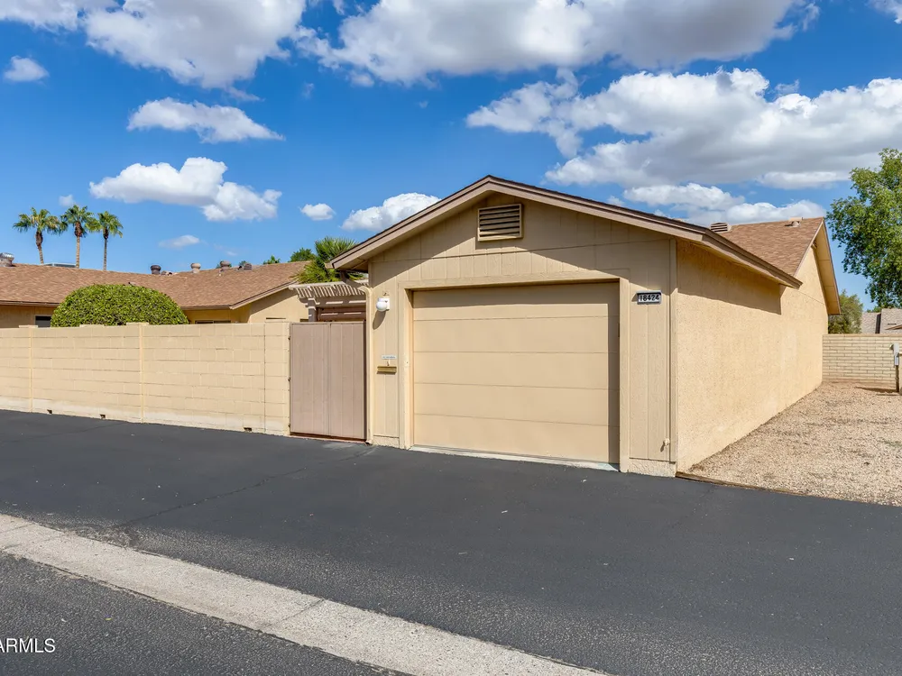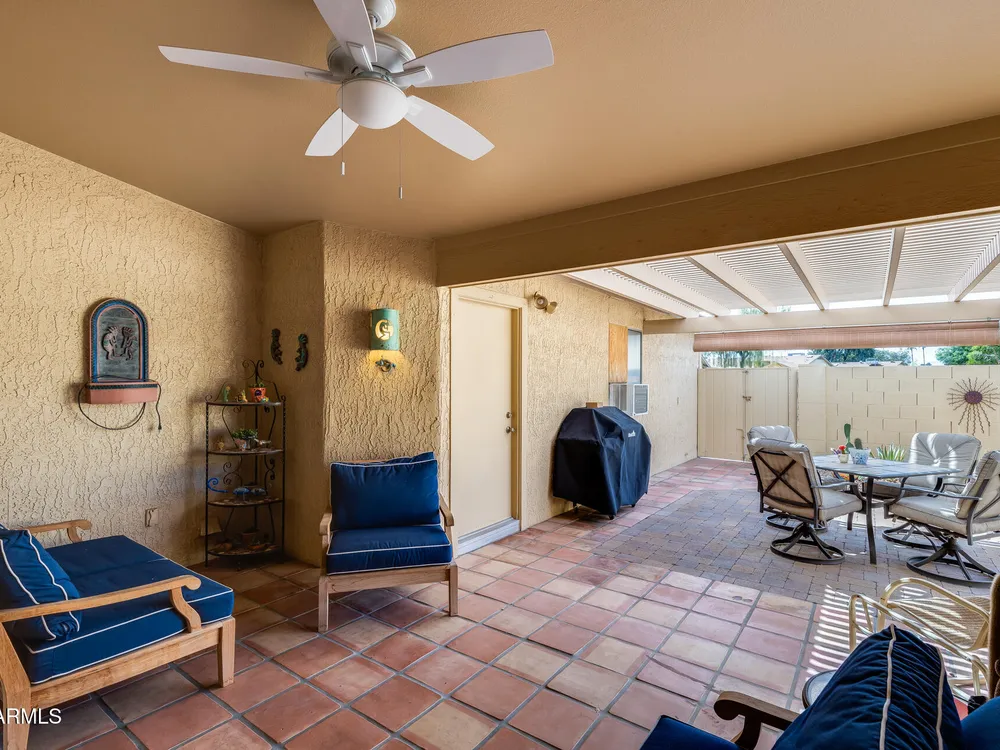This beautifully updated home blends comfort and quality with thoughtful upgrades throughout. The kitchen showcases chiseled-edge granite countertops, white Shaker cabinets with large drawers and pullouts, stainless steel appliances (all appliances convey), and a dining area that flows into the spacious living room—perfect for entertaining or relaxing. You'll appreciate the tile in all the right areas, fresh interior paint, updated shutters on every window, and a new slider shade for added comfort and privacy. Both bedrooms include walk-in closets, and the bathrooms feature newer vanities and fixtures. A brand-new HVAC (2024) ensures year-round comfort, and the roof (replaced in 2014) is covered by the HOA ... Step outside to your private backyard retreat with a covered pergola, decorative shutters, low-maintenance desert landscaping, and a recently replaced irrigation systemperfect for morning coffee or evening relaxation. Added conveniences include inside laundry with cabinetry and a 1-car garage for secure parking and extra storage. Located in a desirable 55+ community with access to a clubhouse, pool, spa, and social activities, and within walking distance to several stores and restaurants, this move-in-ready home delivers the best of comfort, style, and low-maintenance living in one complete package.