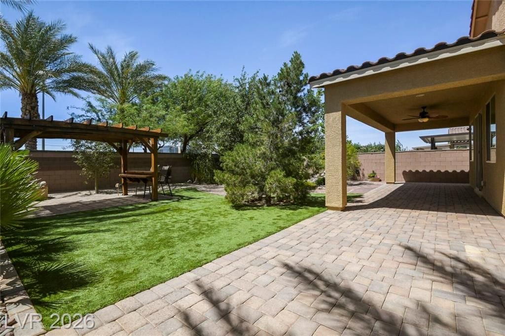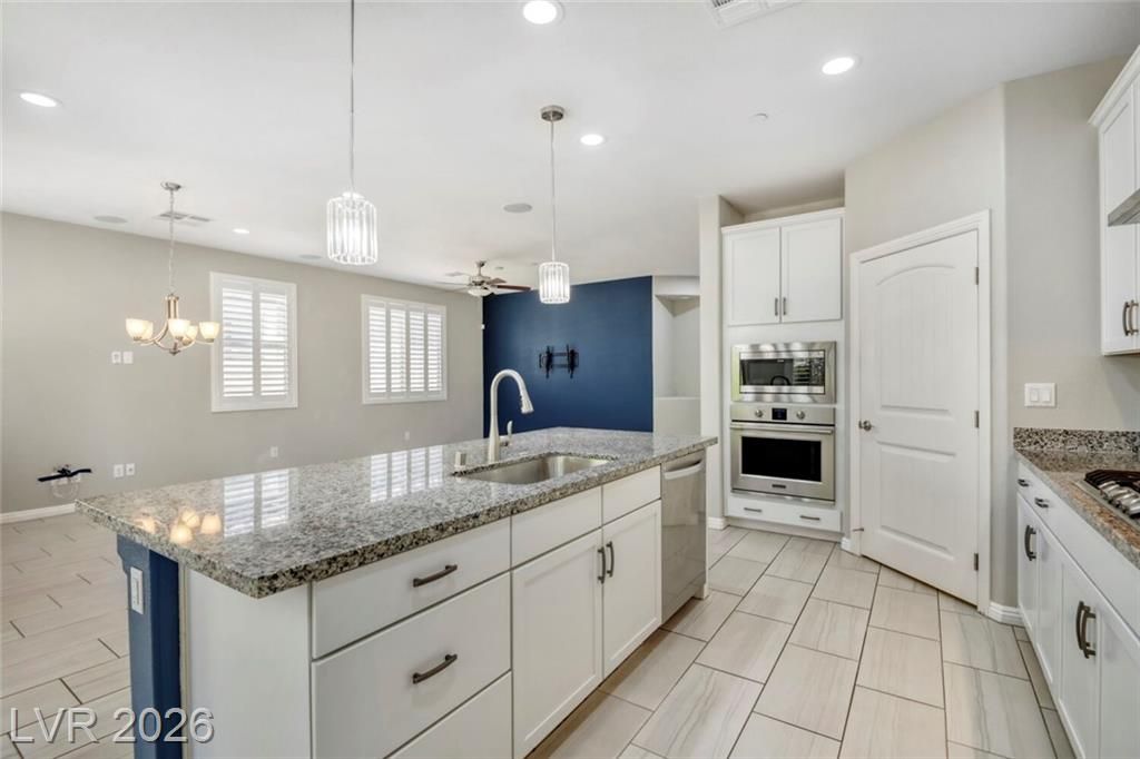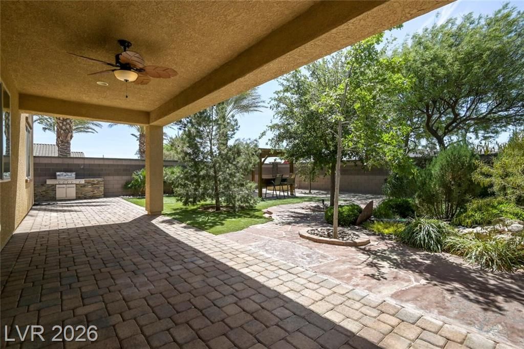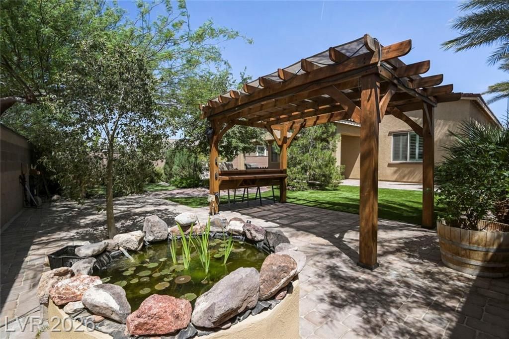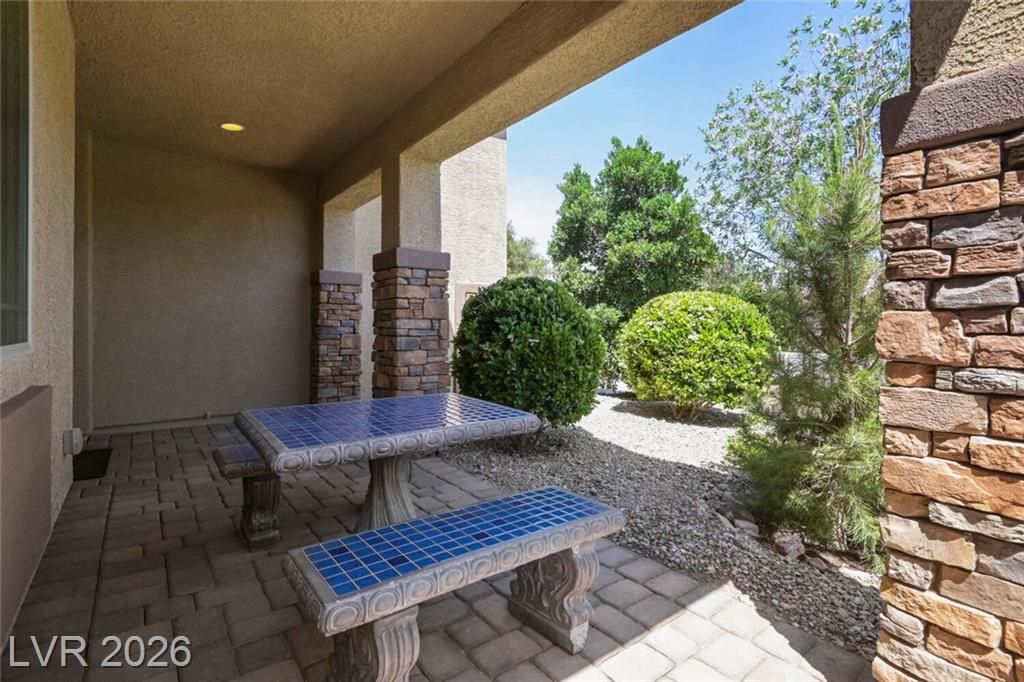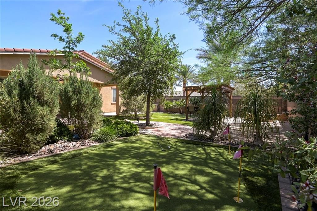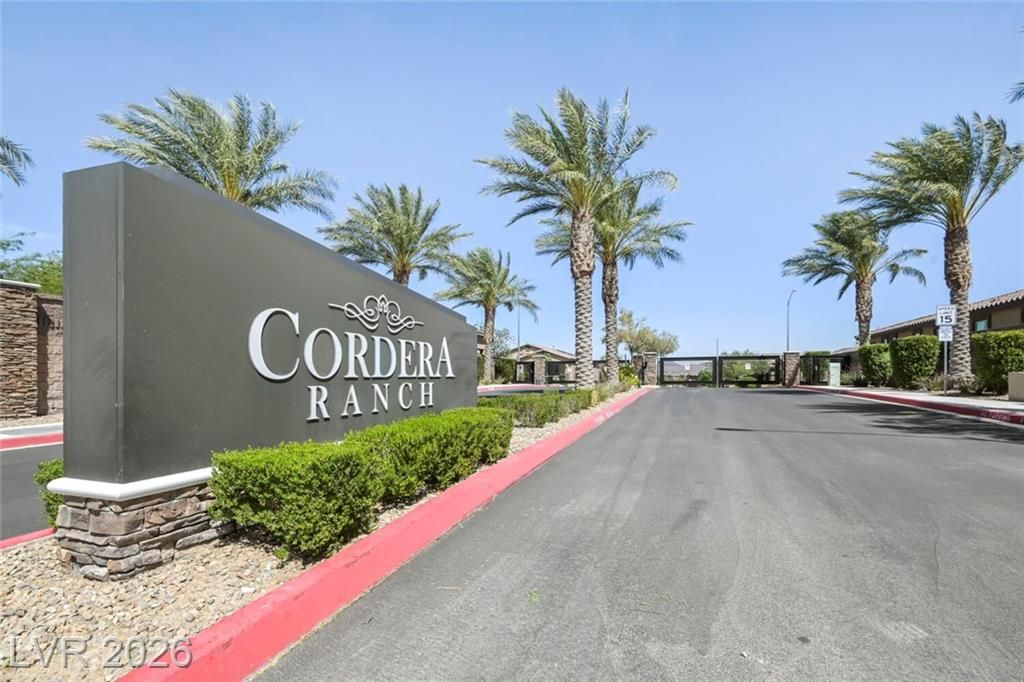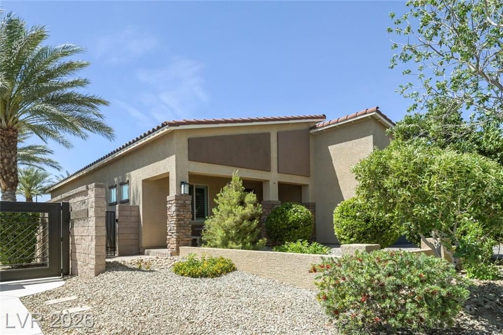 Experience resort living in this highly upgraded home in gated 55+ community, Cordera Ranch. Positioned on an oversized corner lot, the home captures mountain views & showcases exceptional outdoor living with lush landscaping, water features, built-in BBQ, private putting green, & an oversized covered patio with ceiling fan. The gourmet kitchen is a chef's dream with stainless steel appliances, built-in oven & microwave, hood, a 5-burner gas cooktop, upgraded white cabinetry, soft-close construction, crown molding, & granite countertops. Contemporary tile flooring through main living spaces, with new carpet in bedrooms and custom shutters throughout. Primary suite offers dual vanities and granite walk-in shower. Additional highlights include surround sound, smart doorbell, and laundry room with cabinets and sink. Residents enjoy exclusive access to a clubhouse with resort-style pool, spa, & fitness center, all minutes away from M Resort, shopping, dining, and easy access to the I-15.