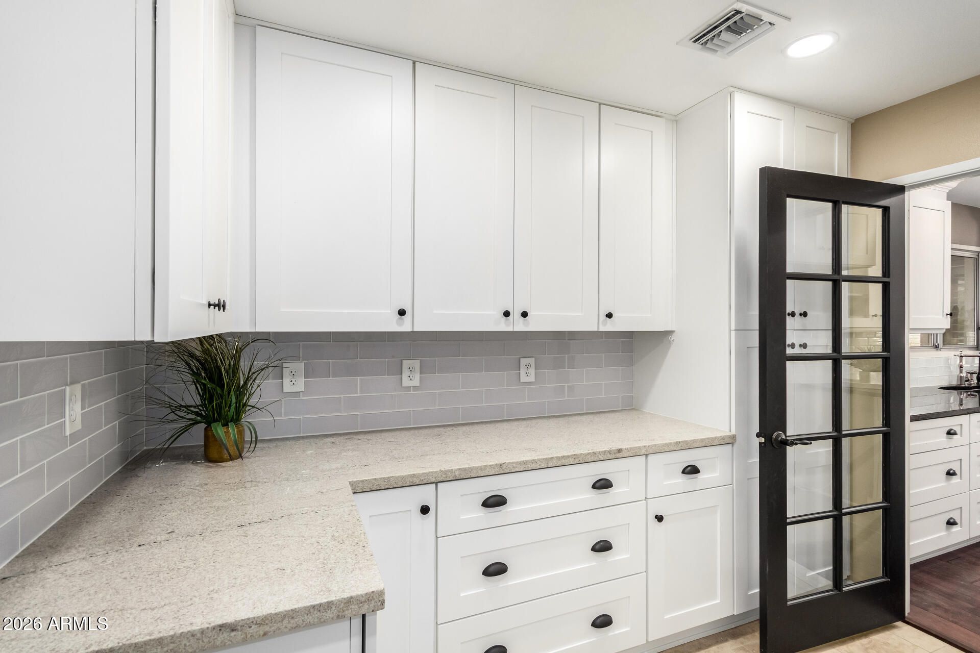 Discover this adorable twin home nestled in a quiet cul-de-sac in the desirable Sun City! A charming courtyard with well-laid pavers will lead you inside, where you'll find a bright and inviting layout with wood-look flooring, recessed lighting, plantation shutters, and earthy colors that make every area perfect for entertaining and relaxation. The galley kitchen features shaker-style cabinets, tile backsplash, granite countertops, and built-in essentials for a seamless cooking experience. The tranquil main bedroom promises a good night's sleep and hosts a bathroom with double sinks and double walk-in closets for convenience. You'll love the extra living space with a sizable AZ room and den. You'll find attached cabinetry in the laundry area and the 2-car garage for added organization. All of this plus access to the many Sun City Recreation Centers with a wide variety of activities like Pickleball, Bocce, Bowling, Swimming, Mini Golf, Puzzle Room, Knitting, etc!!!! There is leased solar on this home, buyer to qualify and take over balance of lease. Enjoy weekend grills and peaceful evenings in the backyard, showcasing a serene landscape with grass and pavers. What's not to love? Make it yours!