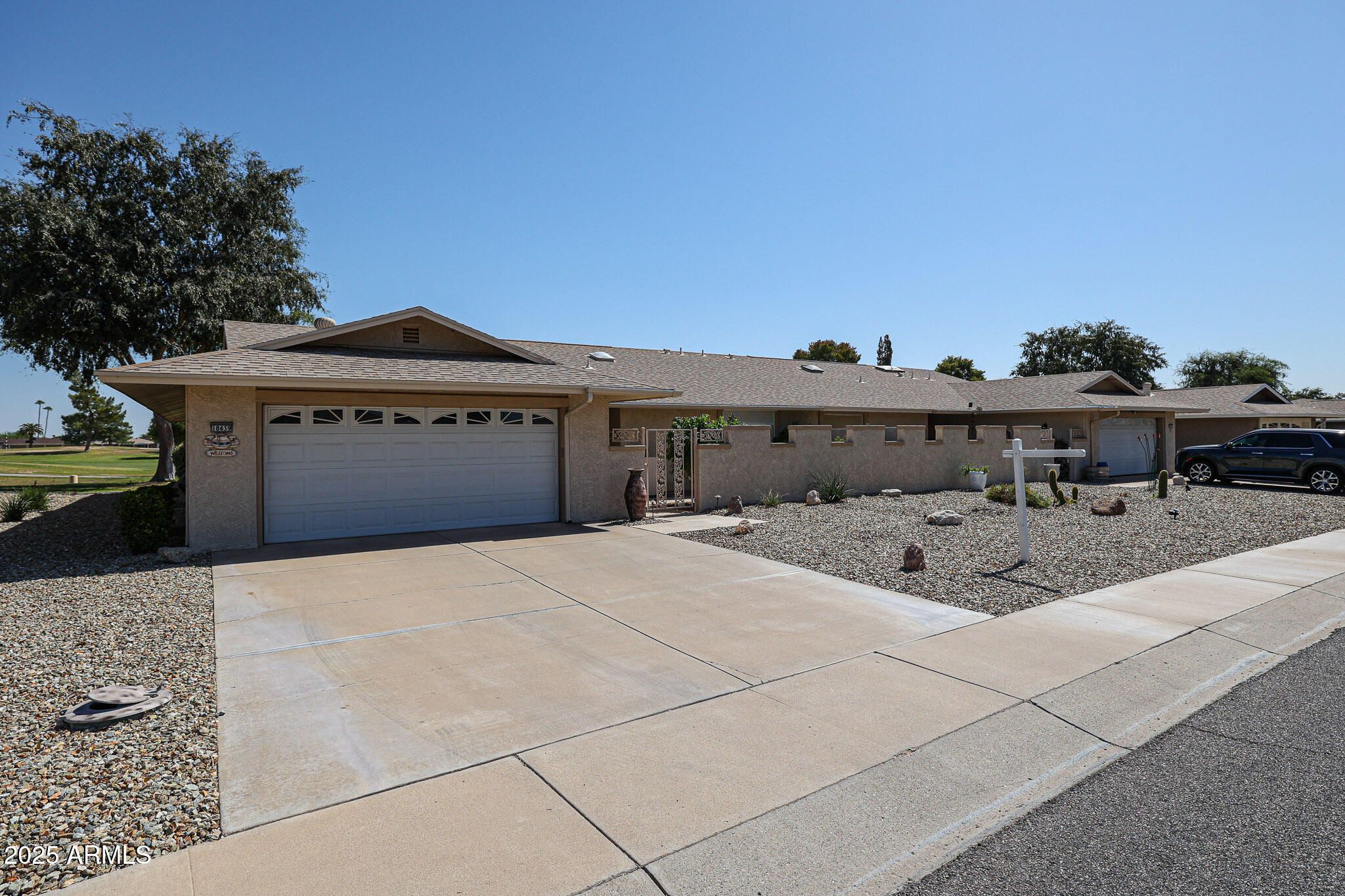 Welcome to this attractive golf course home located in the highly sought-after area of Sun City! As you enter this inviting 2-bedroom, 2-bathroom residence, you'll immediately appreciate the stunning golf course views and thoughtful updates throughout. The kitchen has been beautifully upgraded with granite countertops, tile backsplash, pull-out drawers, and newer appliances. Enjoy an eat-in dining area just off the kitchen, along with an additional formal dining space—perfect for hosting guests.The guest bathroom has been remodeled with a stylish tile shower. Popcorn ceilings have been removed, and ceiling fans have been added in every room. The living and dining area feature newer flooring, while the kitchen and walkway offer neutral tile. The spacious primary bedroom includes a walk-in closet. Additional highlights include dual-pane windows, a huge laundry room with sink and storage, an owned water softener, and copper wiring. Step outside to the covered patio overlooking the beautiful golf coursean ideal spot for morning coffee or afternoon entertaining. Come see this lovely home today!