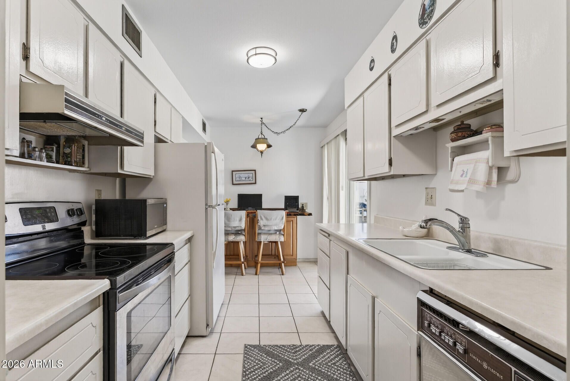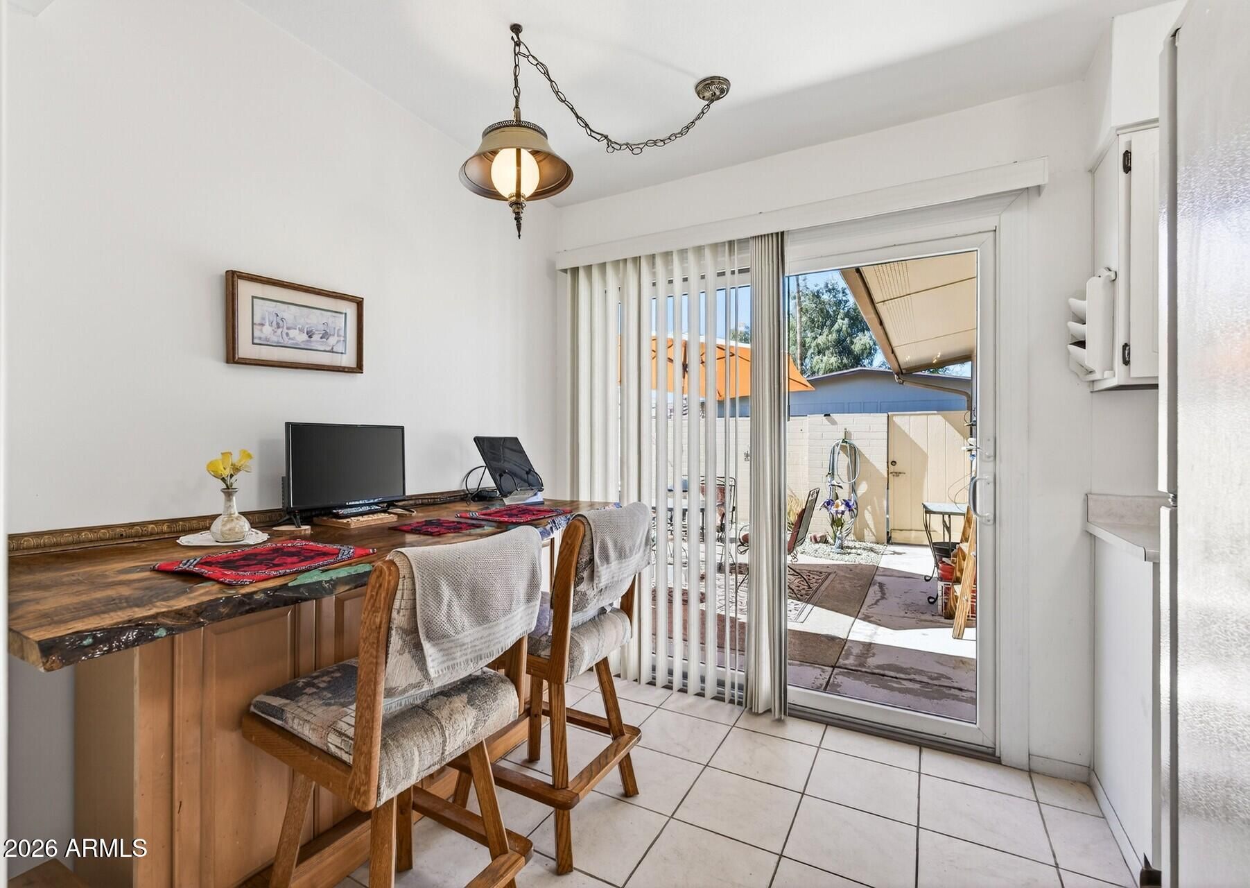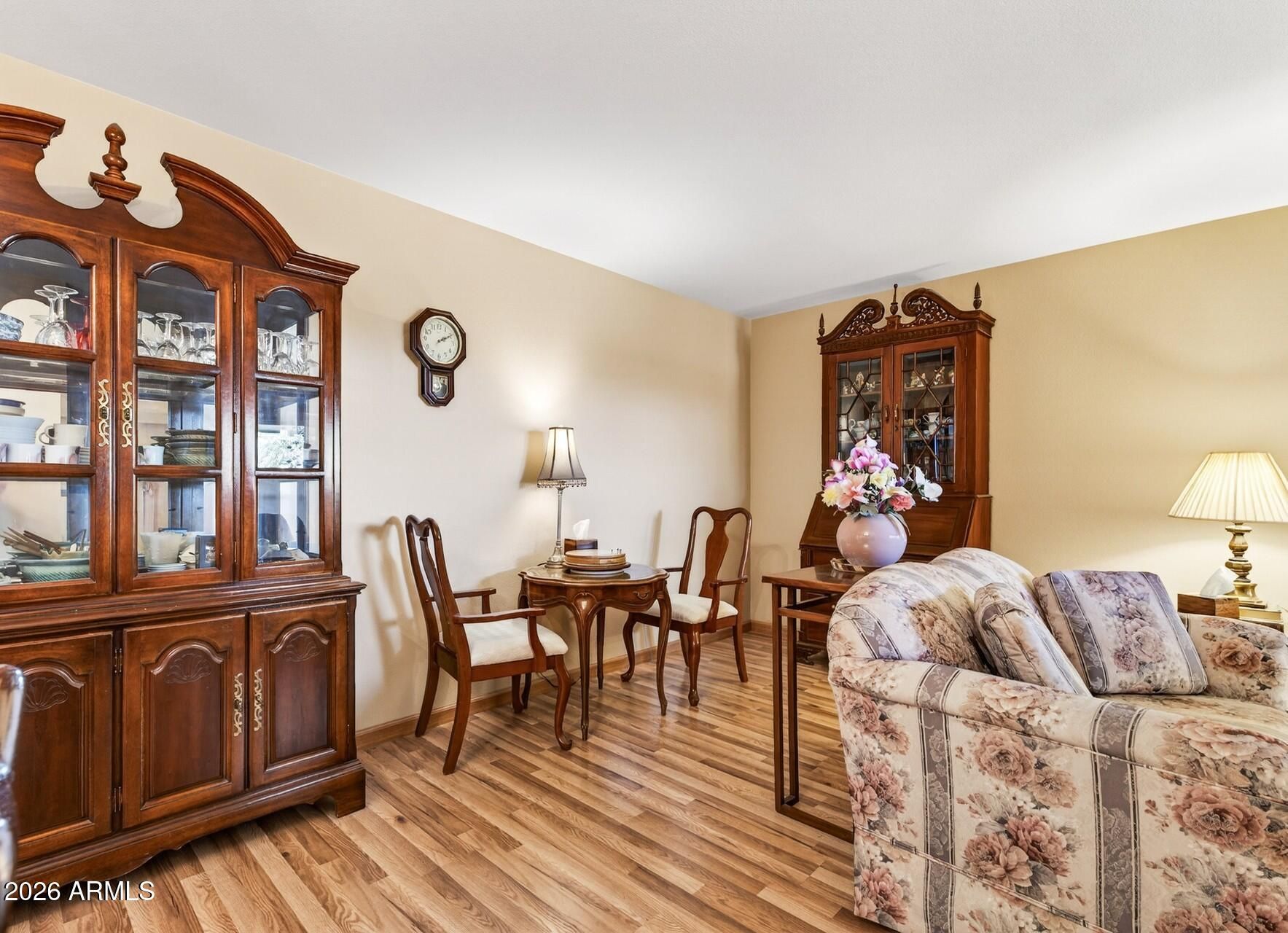 Rarely on the market a 2 bedroom/1 bath garden apartment in Sun City West--perfect for buyers who need more space than a typical 1 bedroom offers. This well-maintained 1,341 sq ft home includes an additional 195 sq ft (in the tax records) flex space ideal for an office, den or hobby room. Recent updates include popcorn ceiling removal, most flooring replaced, remodeled shower, original windows replaced and a newer HVAC system (2021). The HOA replaced the roof approximately 3 years ago. The galley kitchen remains largely original but is functional and features a custom made breakfast counter. Enjoy a private, inviting courtyard and an unbeatable location near the recreation centers, golf, shopping and dining in this sought-after 55+ active adult community of Sun City West in Arizona..