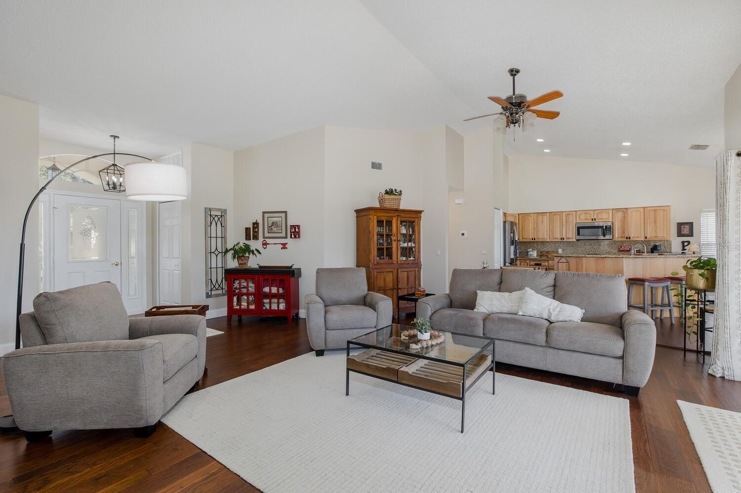- Ceiling Fan(s), Eat-in Kitchen, High Ceilings, Kitchen/Family Room Combo, Living/Dining Room, Open Floorplan, Main Level Primary, Solid-Wood Cabinets, Split Bedrooms, Stone Counters, Thermostat, Vaulted Ceiling(s), Walk-In Closet(s), Window Treatments