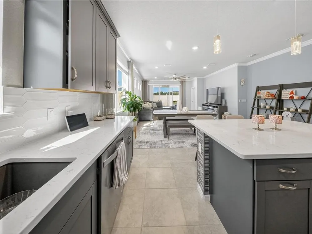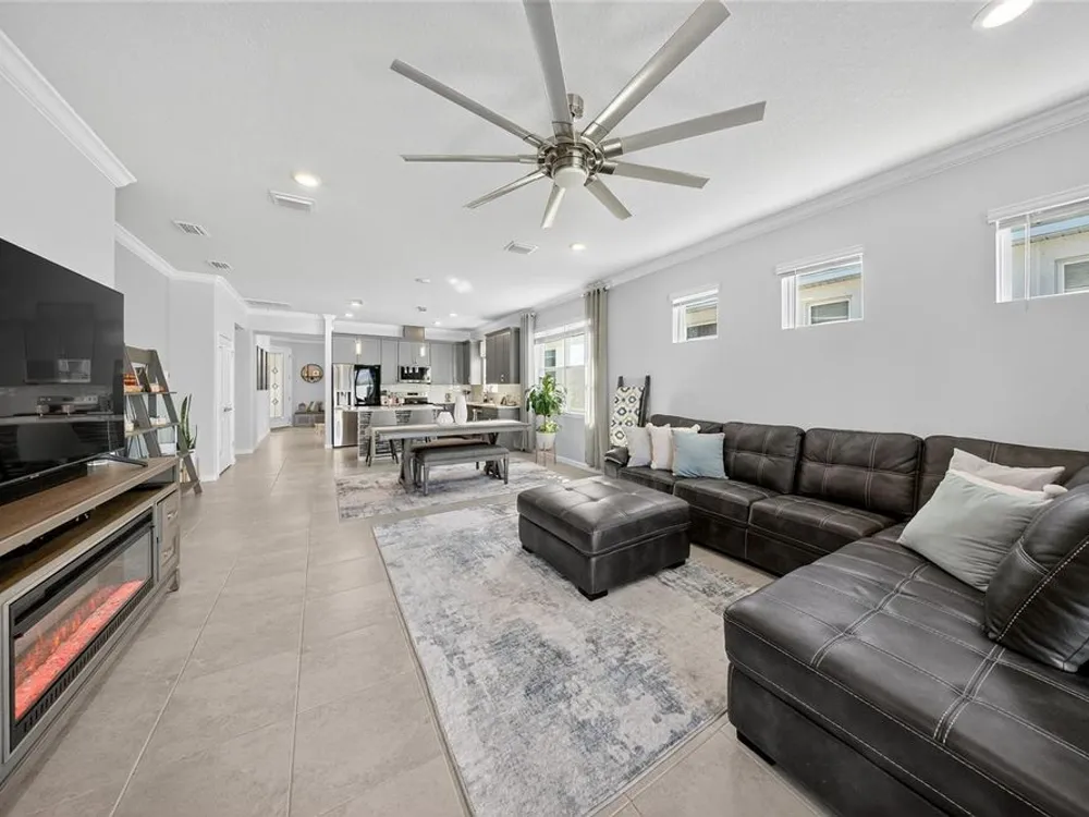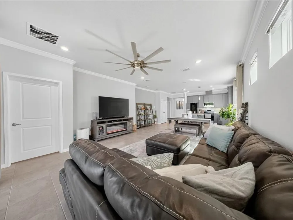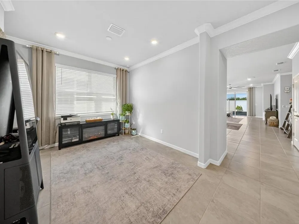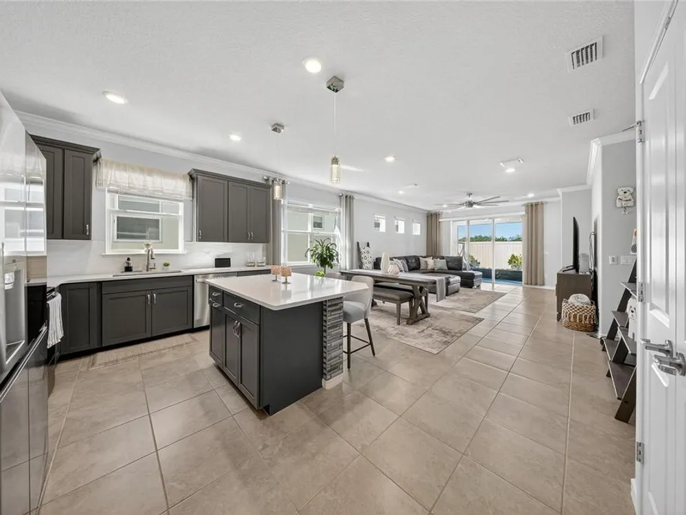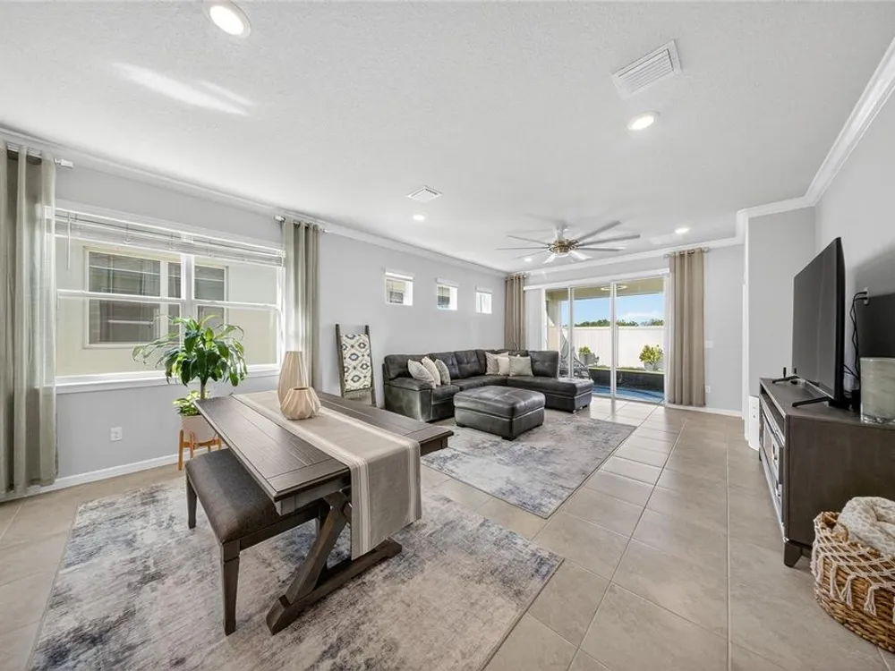 Beautiful meticulously maintained Villa in a 55+ gated community, Tohoqua Reserve. This move-in ready home features lots of upgrades. This spacious 2-bedroom, 2-bathroom home features a versatile flex room, perfect for an office, or can be easily converted into a third bedroom. Upon entering the home, you’ll notice the beautiful crown molding throughout the home, and an abundance of natural light filling the living space. The open floor plan combines the kitchen, dining, and living areas, creating a beautiful large open, bright and welcoming space. Tile throughout home, no carpet. The kitchen features lots of storage space, a pantry, gray cabinets, quartz countertops, an island, and stainless-steel appliances. Through the triple sliding glass doors is a screened-in covered lanai, with extended pavers and artificial grass, perfect for relaxation. The large main bedroom offers a bathroom with a dual sink vanity, tile shower, linen closet, and a large walk-in closet. The 2-car garage features an upgraded epoxy floor for improved durability and sleek appearance. Fenced in yard. This community offers excellent recreational amenities, including access to 2 resort-style pools, clubhouse, tennis and pickleball courts, bocce ball court, fire pits, fitness centers, playground, and scenic walking trails. Tohoqua Reserve is conveniently located near US-192 and the FL Turnpike and is within 30 minutes of Orlando International Airport and Disney World. Lots of shopping centers near by and close to the beautiful Saint Cloud Lake Front area. Furnished - By Appointment Only