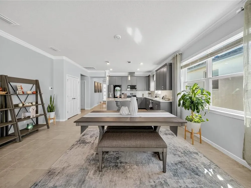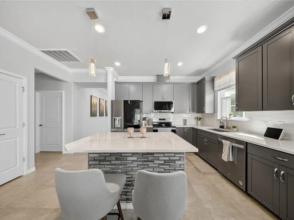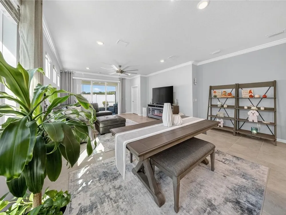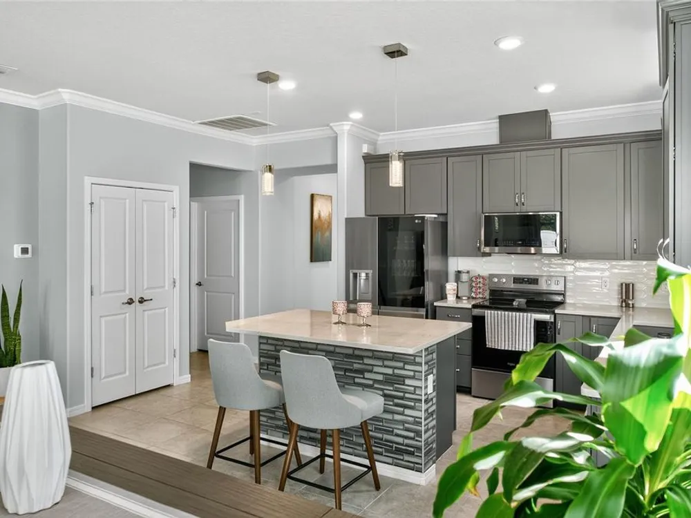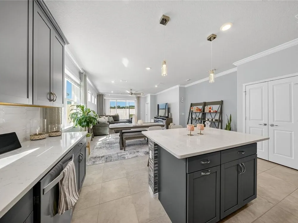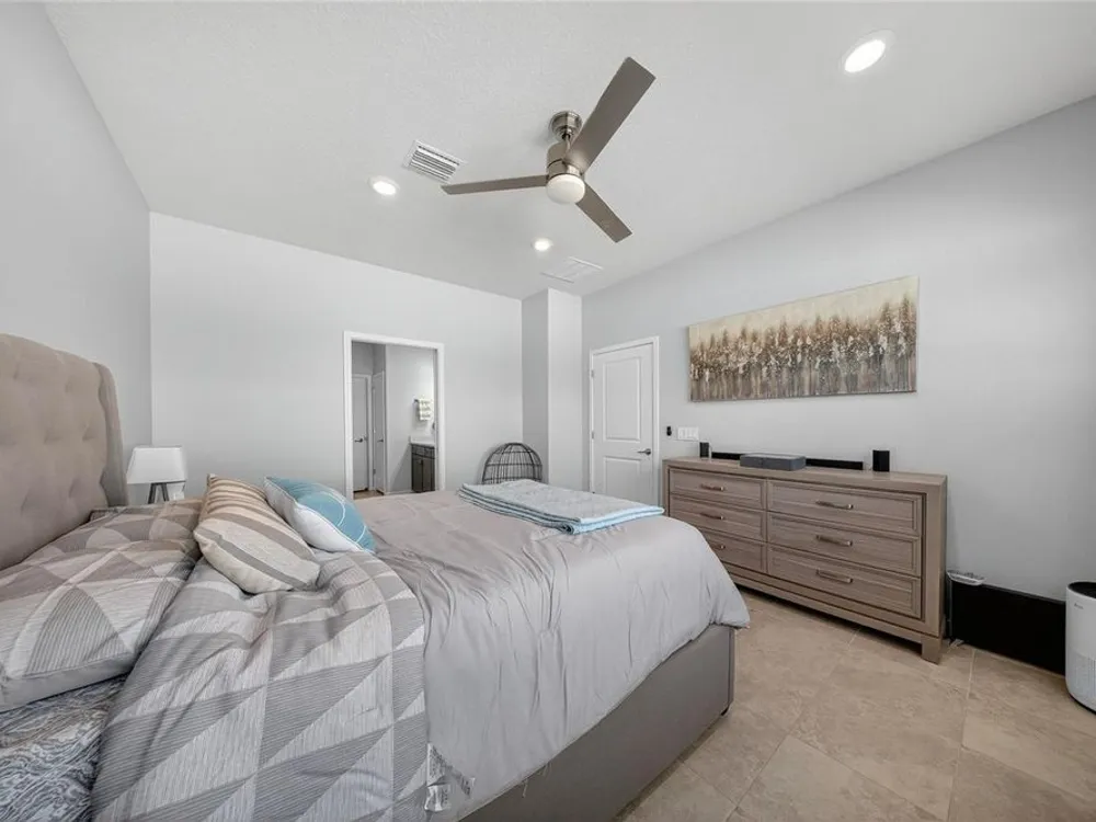 Beautiful meticulously maintained Villa in a 55+ gated community, Tohoqua Reserve. This move-in ready home features lots of upgrades. This spacious 2-bedroom, 2-bathroom home features a versatile flex room, perfect for an office, or can be easily converted into a third bedroom. Upon entering the home, you’ll notice the beautiful crown molding throughout the home, and an abundance of natural light filling the living space. The open floor plan combines the kitchen, dining, and living areas, creating a beautiful large open, bright and welcoming space. Tile throughout home, no carpet. The kitchen features lots of storage space, a pantry, gray cabinets, quartz countertops, an island, and stainless-steel appliances. Through the triple sliding glass doors is a screened-in covered lanai, with extended pavers and artificial grass, perfect for relaxation. The large main bedroom offers a bathroom with a dual sink vanity, tile shower, linen closet, and a large walk-in closet. The 2-car garage features an upgraded epoxy floor for improved durability and sleek appearance. Fenced in yard. This community offers excellent recreational amenities, including access to 2 resort-style pools, clubhouse, tennis and pickleball courts, bocce ball court, fire pits, fitness centers, playground, and scenic walking trails. Tohoqua Reserve is conveniently located near US-192 and the FL Turnpike and is within 30 minutes of Orlando International Airport and Disney World. Lots of shopping centers near by and close to the beautiful Saint Cloud Lake Front area. Furnished - By Appointment Only