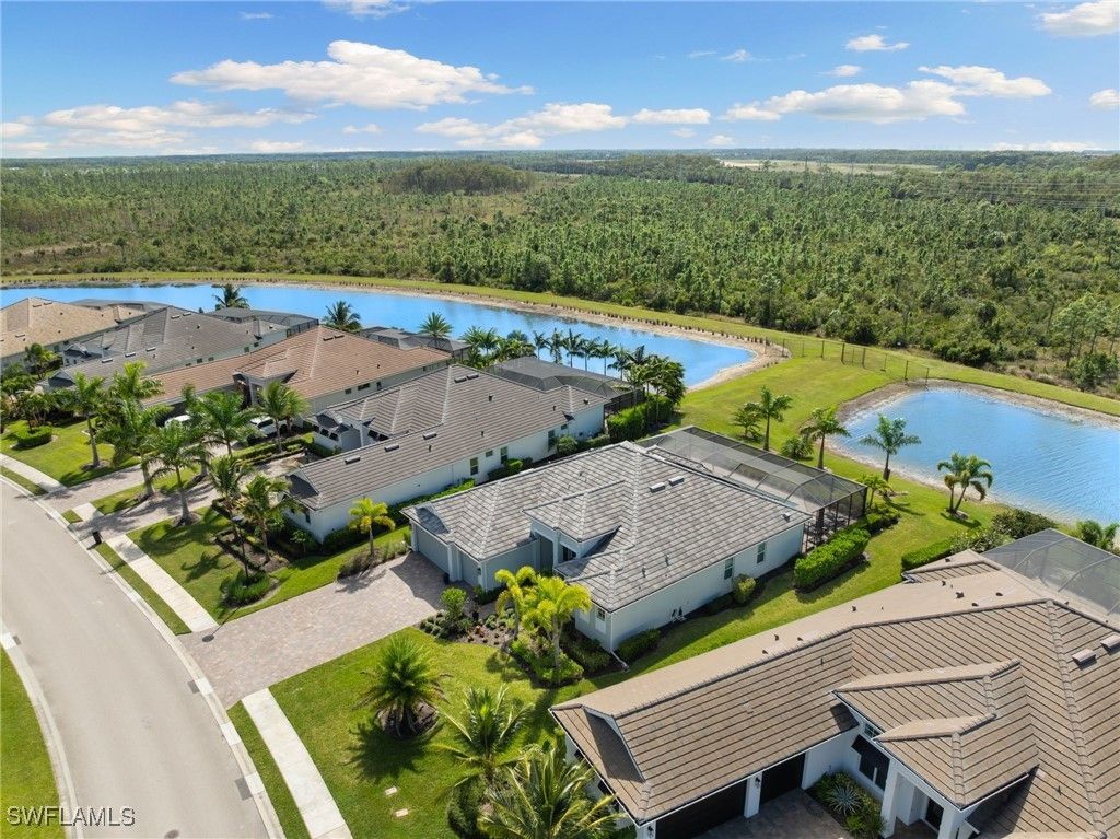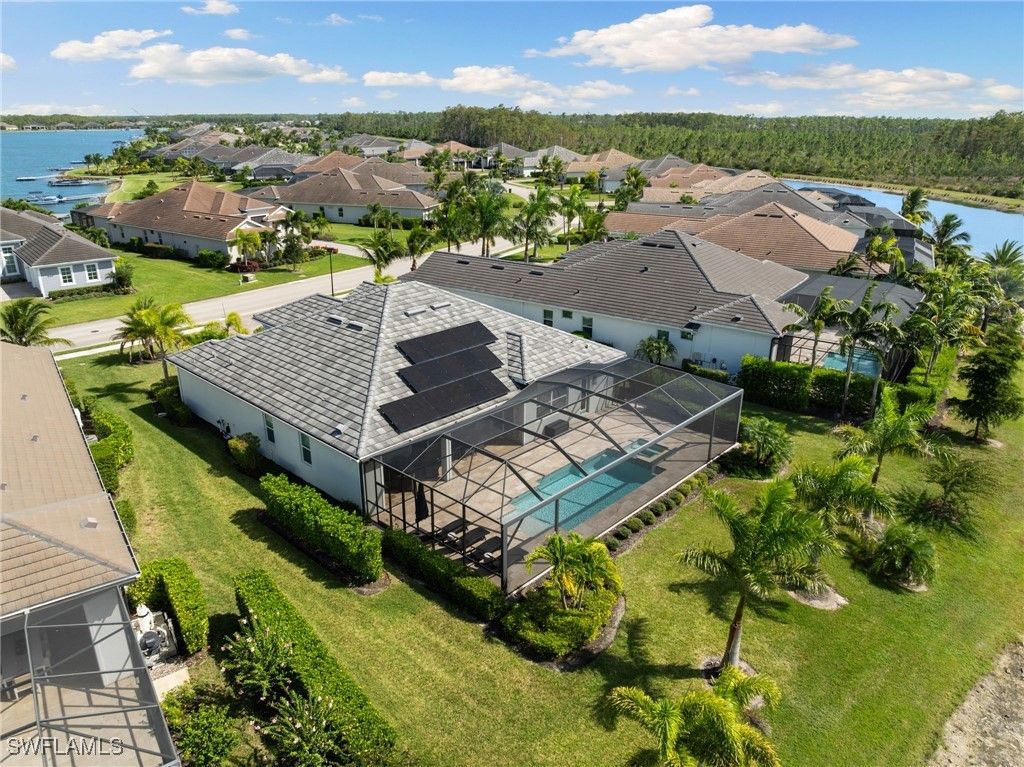 Stunning Solar-Powered Lakeside Home in WildBlue – Move-In Ready and Fully Furnished! Welcome to 18460 WildBlue Blvd — a meticulously maintained, fully furnished 2022-built home offering the perfect blend of luxury, sustainability, and resort-style living. Positioned on a rare southwest-facing, pie-shaped lot with 102 feet of lake and preserve frontage, this home captures breathtaking sunsets and sunlight all day long across its expansive pool and spa area. This single-level Lakeside floor plan by WCI Homes offers nearly 2,700 sq. ft. under air with one of the largest great room layouts in WildBlue. Soaring ceilings enhance the open concept living, dining, and kitchen areas, highlighted by a massive island, gas cooktop, wall oven/microwave, and stacked, backlit display cabinetry. The great room features built-in shelving flanking an 86” TV with a Sonos Arc soundbar, creating the ultimate entertainment space. The split-bedroom design offers privacy, with two guest suites on one side and a luxurious master retreat on the other. The master suite includes two oversized walk-in closets, double vanities, a large walk-in shower, and abundant natural light. A spacious den/office near the entry can easily convert into a fourth bedroom if needed. Step outside to your private tropical oasis — a screen-enclosed lanai with dining and lounge areas, an outdoor TV, and a built-in kitchen with grill and refrigerator. The travertine pool deck, LED pool and spa lighting, faux-wood tongue-and-groove ceiling, and motorized hurricane screens create the perfect setting for outdoor living and entertaining. Lush professional landscaping includes Calusa hedges for privacy, multiple palm species, and low-voltage lighting surrounding the property. The upgraded contemporary glass-panel front doors enhance curb appeal and welcome you into a home that feels brand new. Enjoy incredible energy savings with a 24-panel paid-off solar system and Tesla Powerwall 3, delivering an average electric bill of just ~$39/month and allowing off-grid capability. Additional upgrades include engineered ash wood flooring, decorative ceiling beams, wood trim accents, upgraded fans and lighting throughout, Wi-Fi thermostat, MyQ smart garage, and Ring doorbell. The 3-car front-facing garage offers easy access and extra driveway space — unique for WildBlue homes. WildBlue is a premier gated lakefront community featuring a 700-acre boating lake, resort-style clubhouse with restaurant and bar, fitness center, spa, pickleball, tennis, and basketball courts, plus a resort pool and cabanas. Conveniently located near RSW Airport, Gulf Coast Town Center, and Southwest Florida’s best beaches, this location combines luxury, nature, and convenience. Enjoy endless sunsets, full-day sun, and effortless luxury — this exceptional WildBlue home is move-in ready, beautifully furnished, and truly one of a kind.