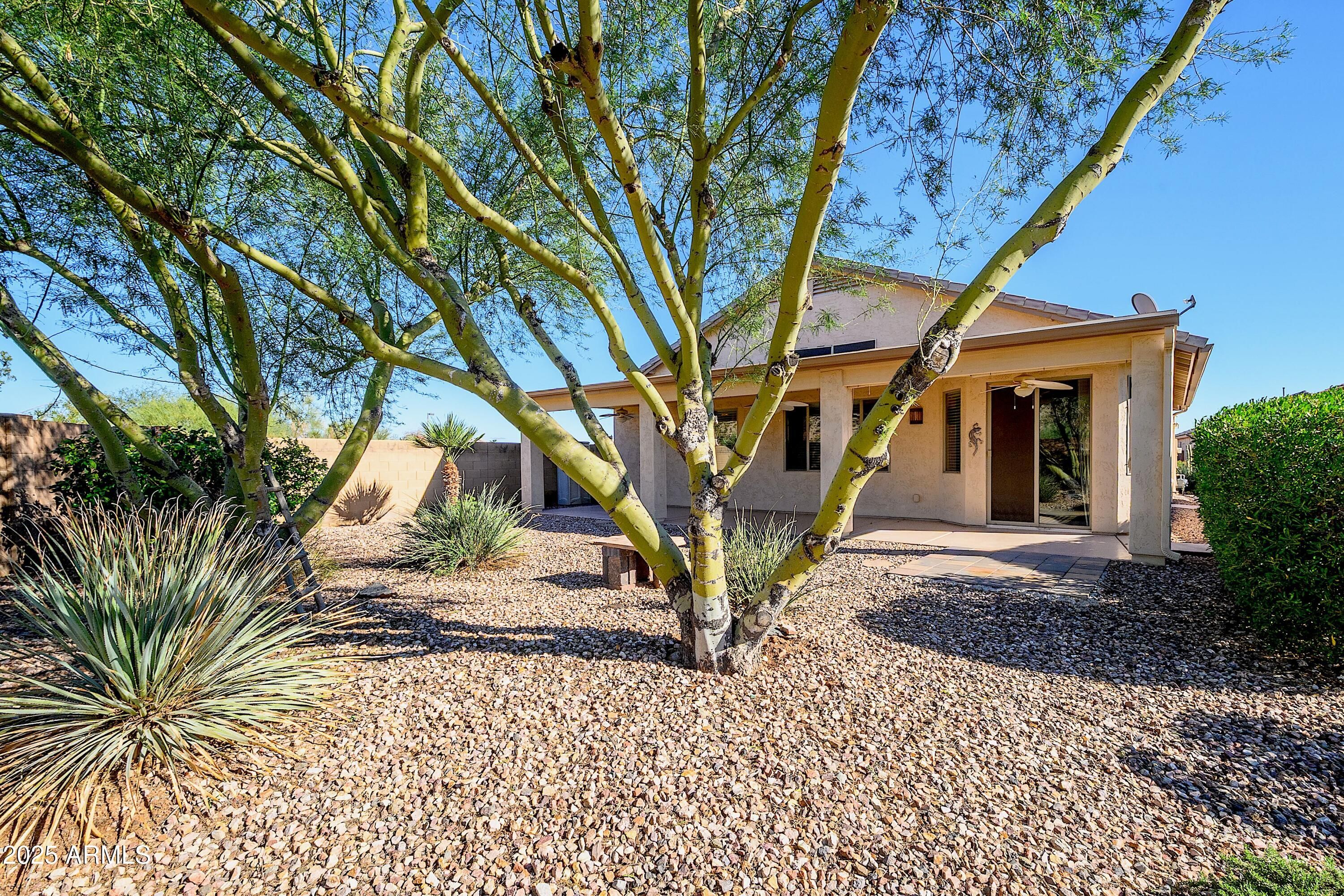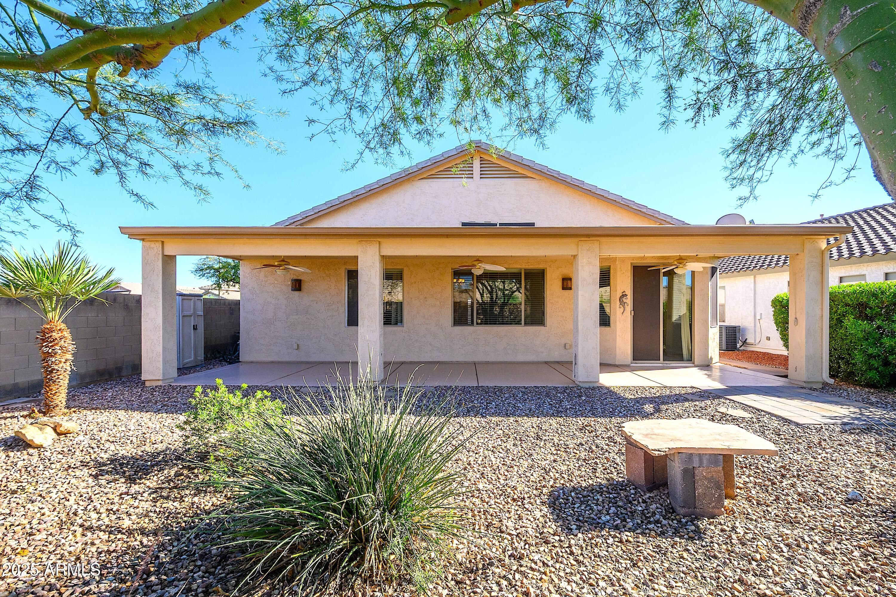 Welcome Home to this 1519 sq/ft Saguaro in the 55+ community of AZ Traditions in a quiet area of the Retreat. For those looking for privacy & AZ sunsets don't miss this home on your tour. Front foyer brings you to a vaulted great room w/upgraded flooring, fan, & open site-line to kitchen & dining. S/S appliances, upgraded granite w/island & pantry. Laundry room w/ new washer plus sink & exit to garage. Primary bedroom w/newer carpet, fan, & ensuite bath. Guest room, full bath, & office/den complete the interior of the home. Step out to your covered patio which is full length of home w/fans installed! Plenty of room for dining & entertaining. PVC drip system was recently replaced. Mountain views, no roof lines, & AZ Sunsets make for a peaceful & tranquil setting. Home is ready for 2026!